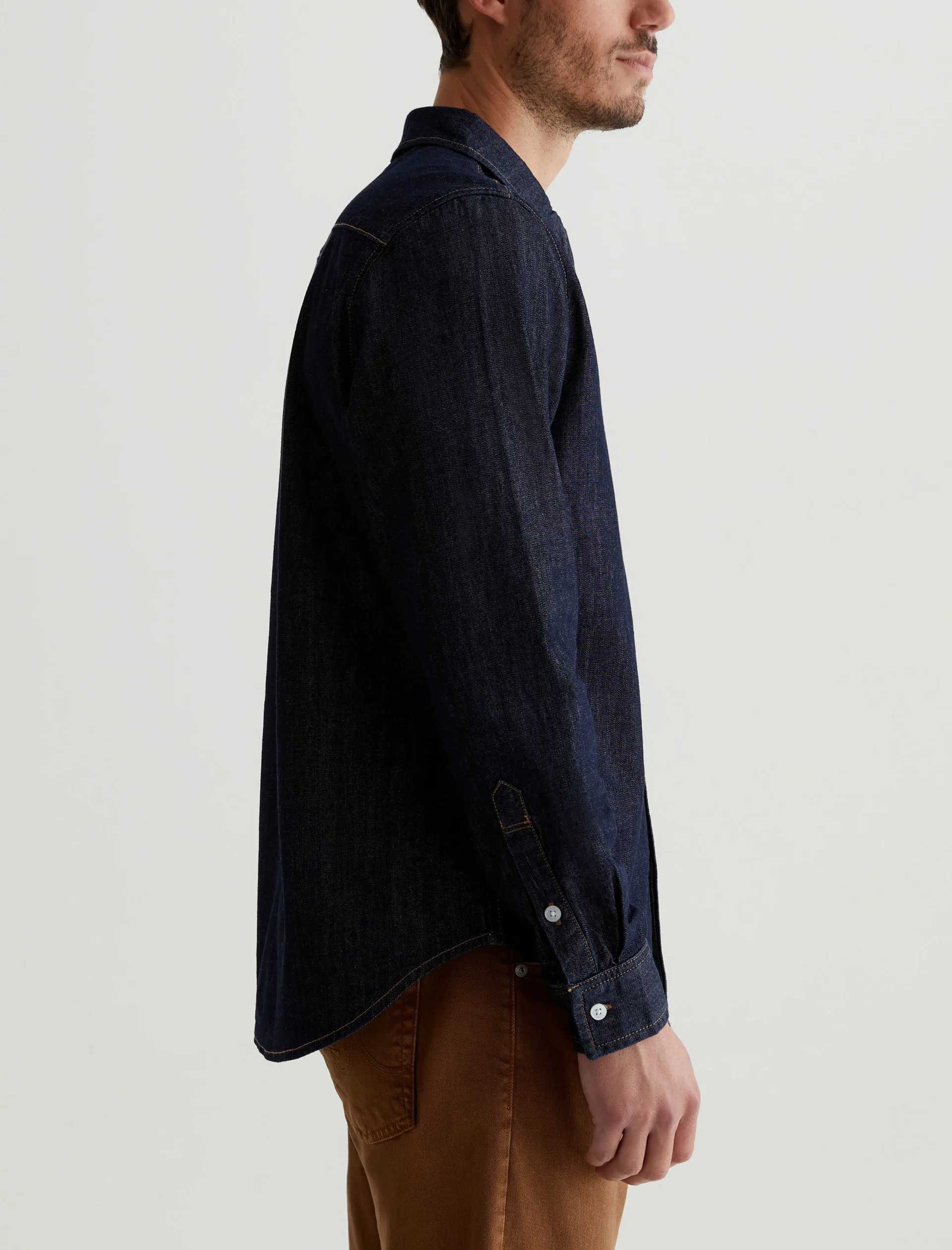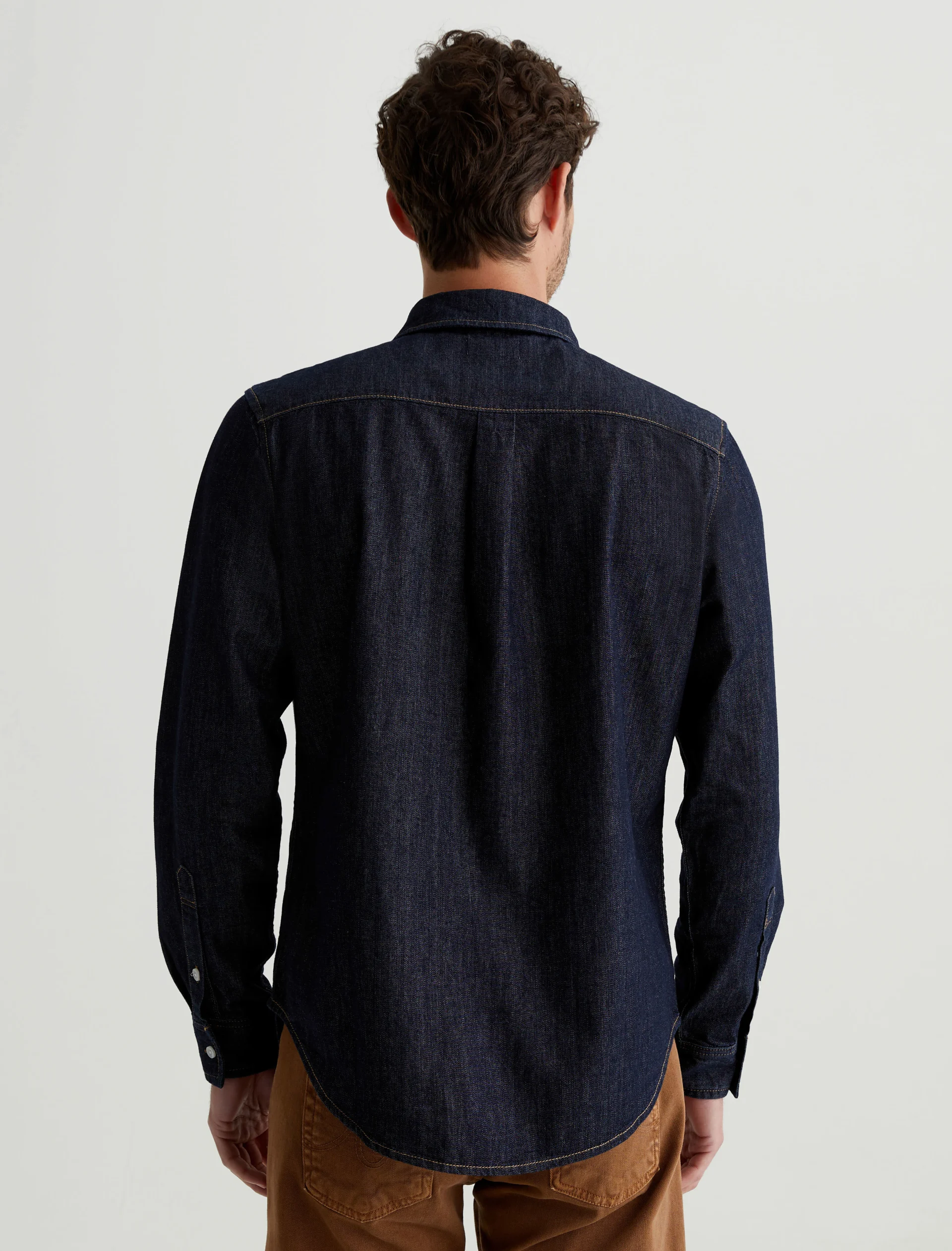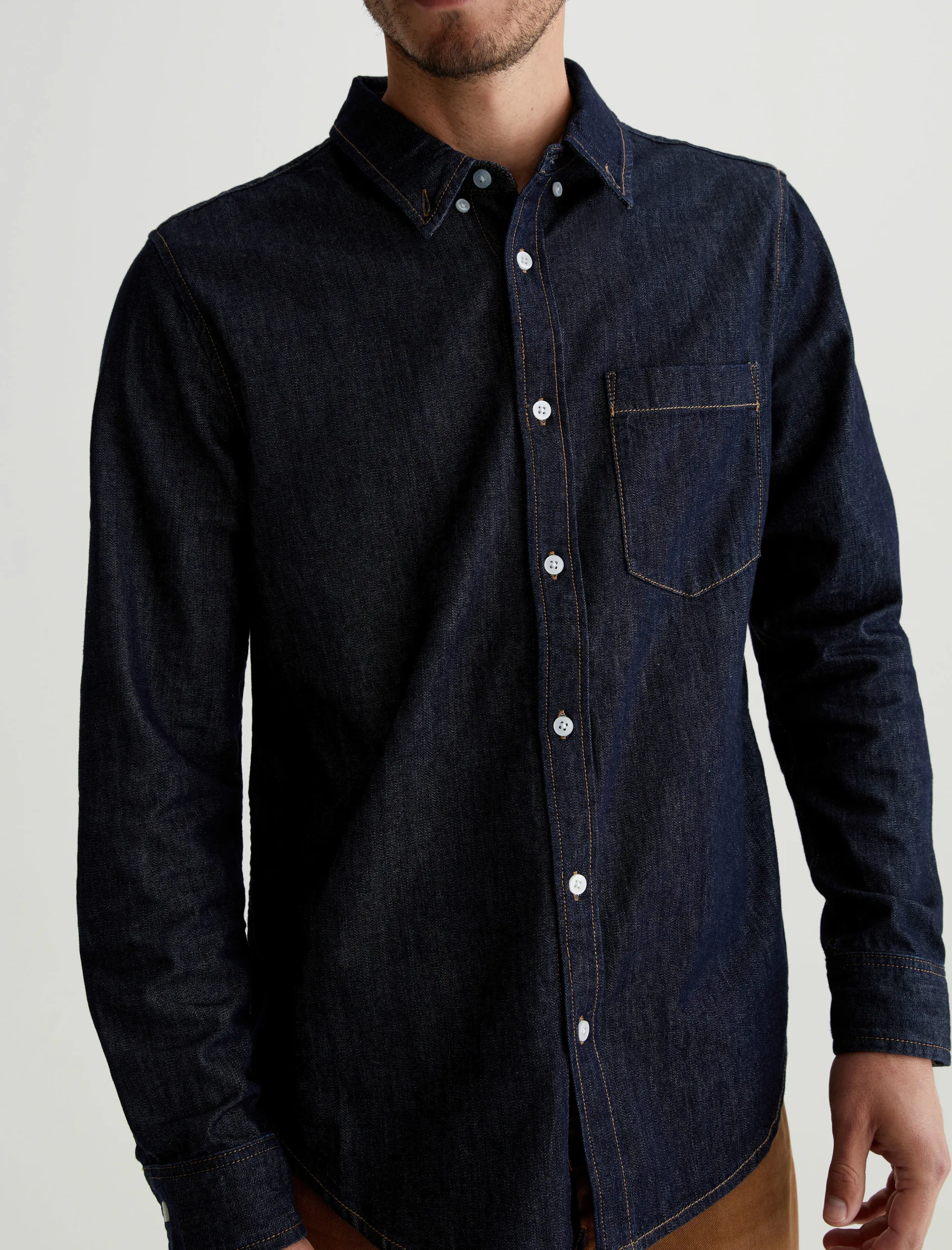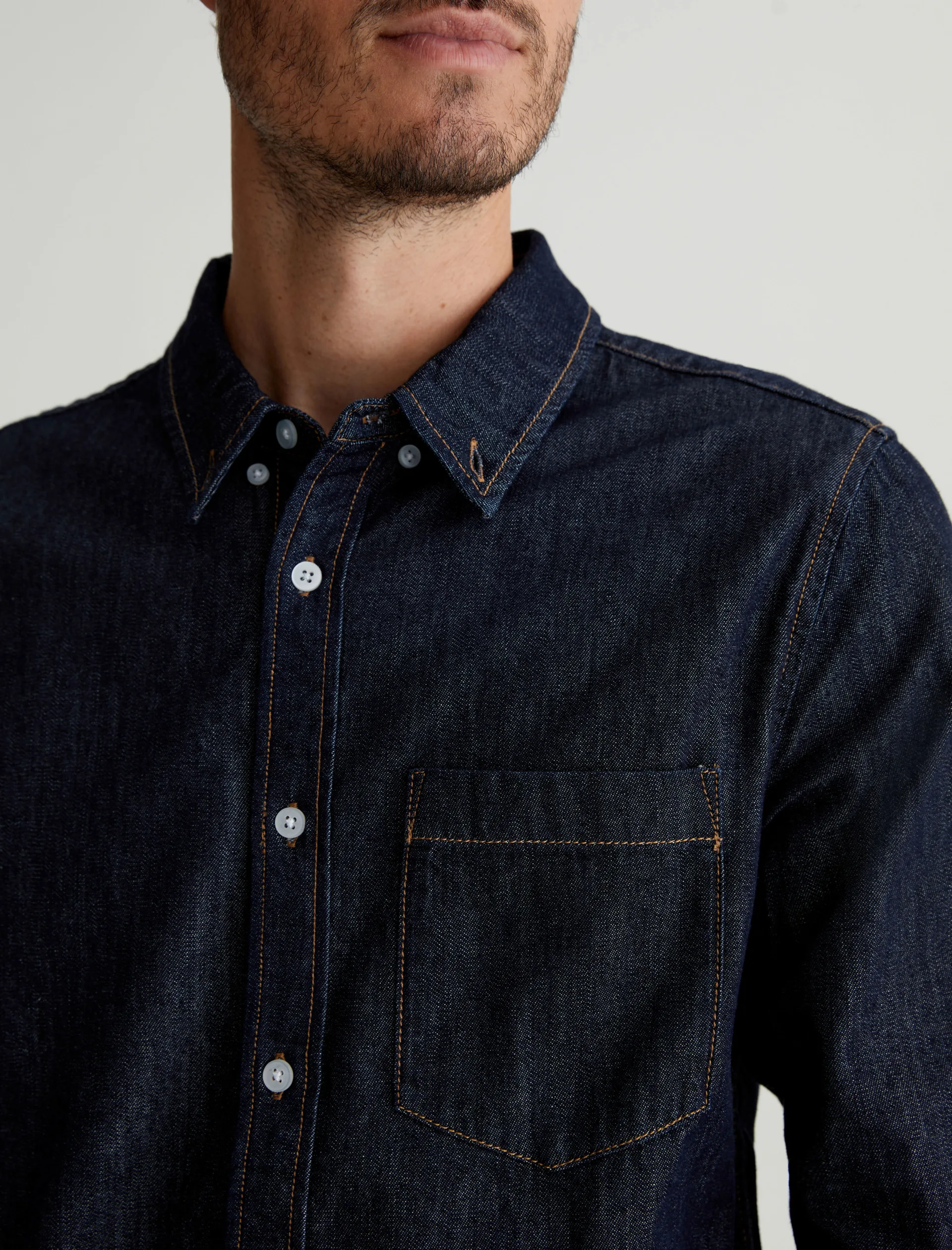 The Aiden Classic Shirt for men features a dark denim wash. The Aiden Classic Shirt features a single front chest pocket, gentle fading, and white buttons, designed in a comfortable and lightweight Cove Denim.