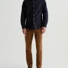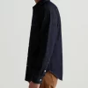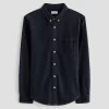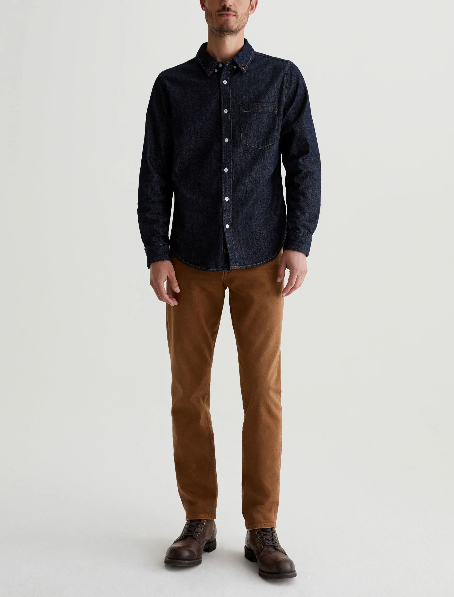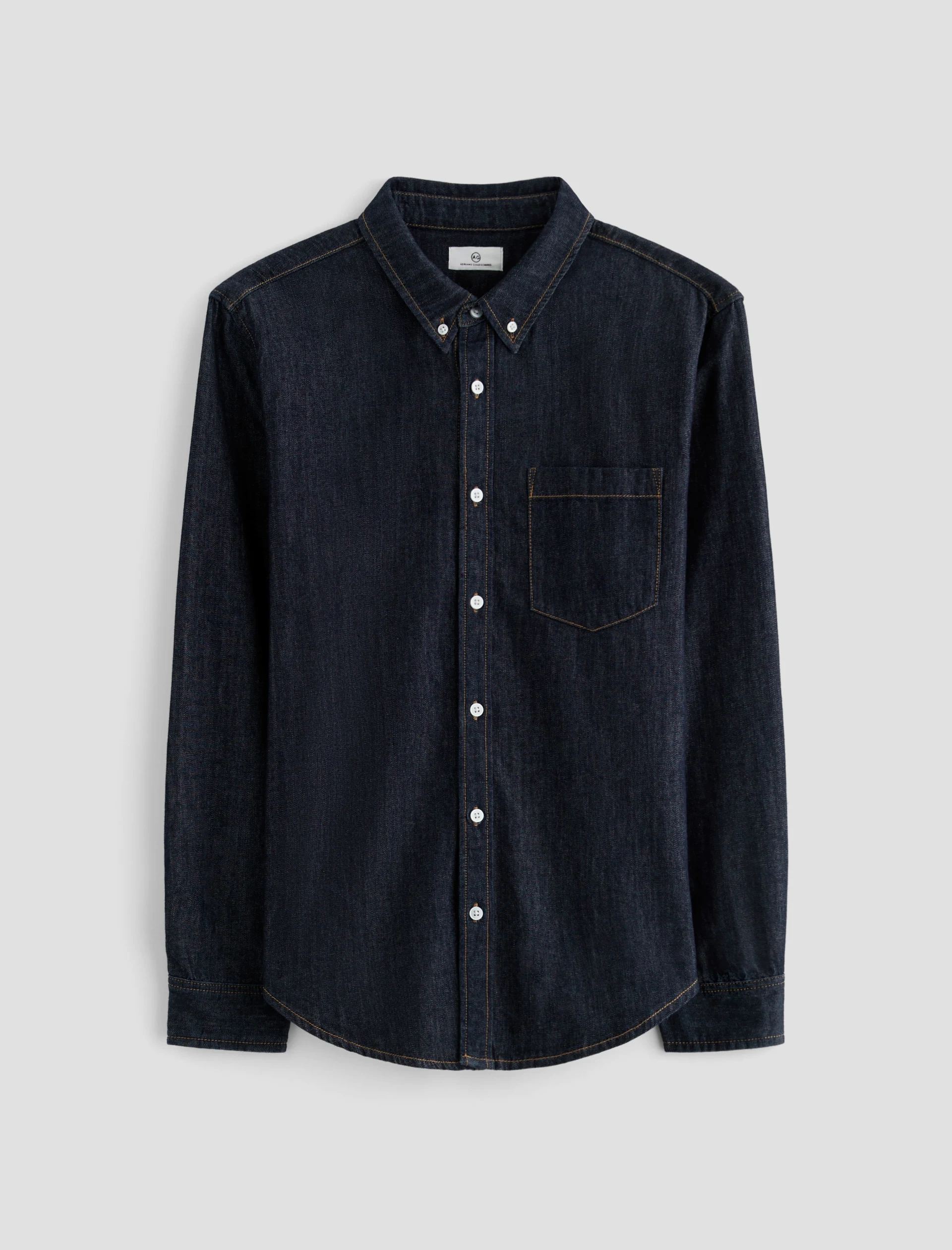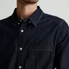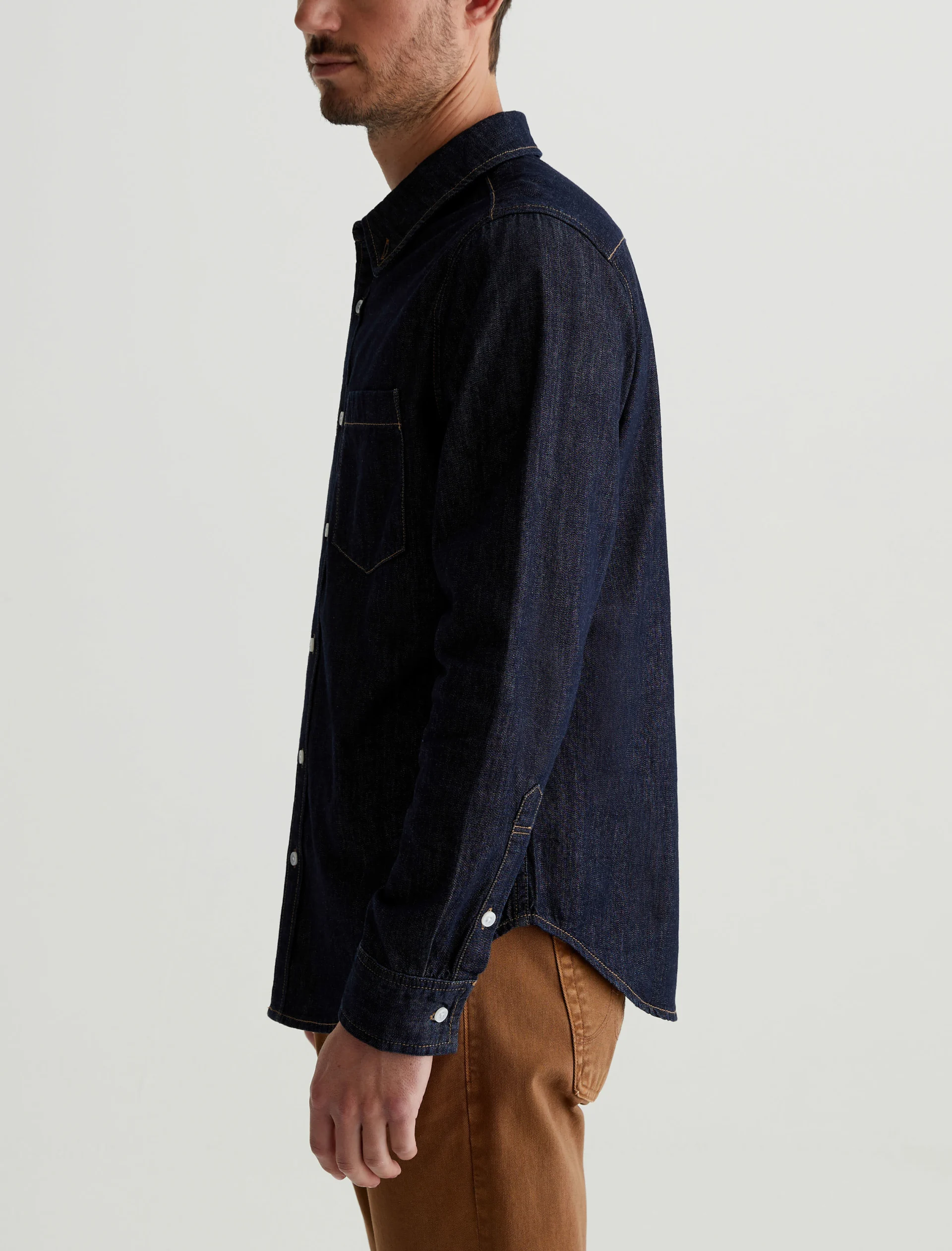 The Aiden Classic Shirt for men features a dark denim wash. The Aiden Classic Shirt features a single front chest pocket, gentle fading, and white buttons, designed in a comfortable and lightweight Cove Denim.