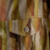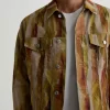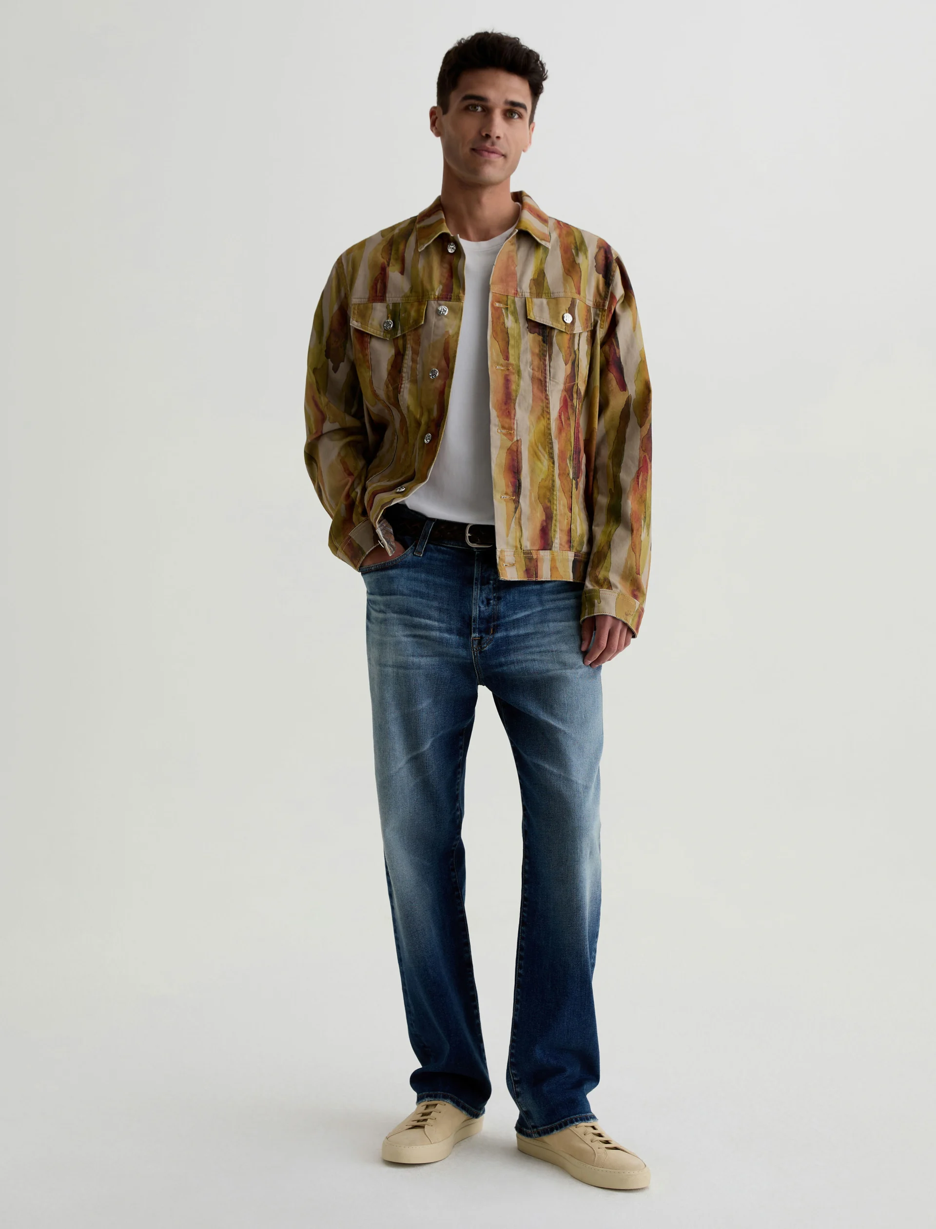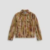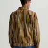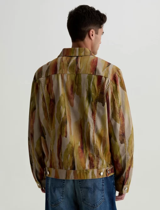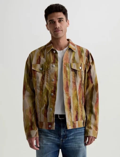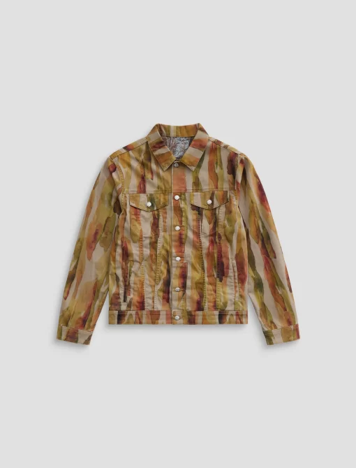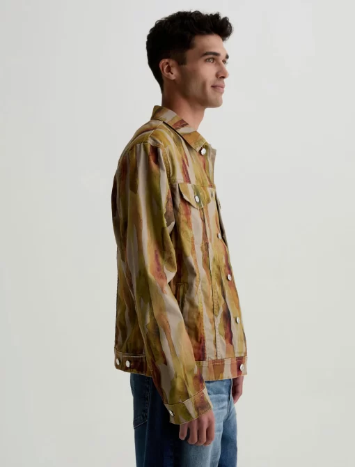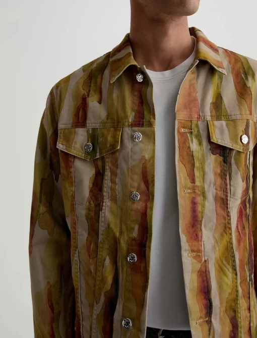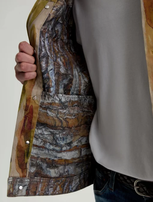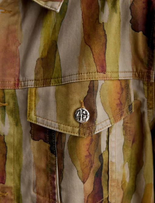 The Dart Jacket is a classic long-sleeve woven trucker style made from a 6.9 oz. Flex Cotton Blend. It features a button-up front with 49 engraved enamel buttons and two front flap pockets for a functional, clean look. About the Art Project print: Inspired by tropical getaways, this collection blends soft shapes and la