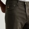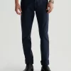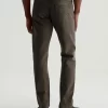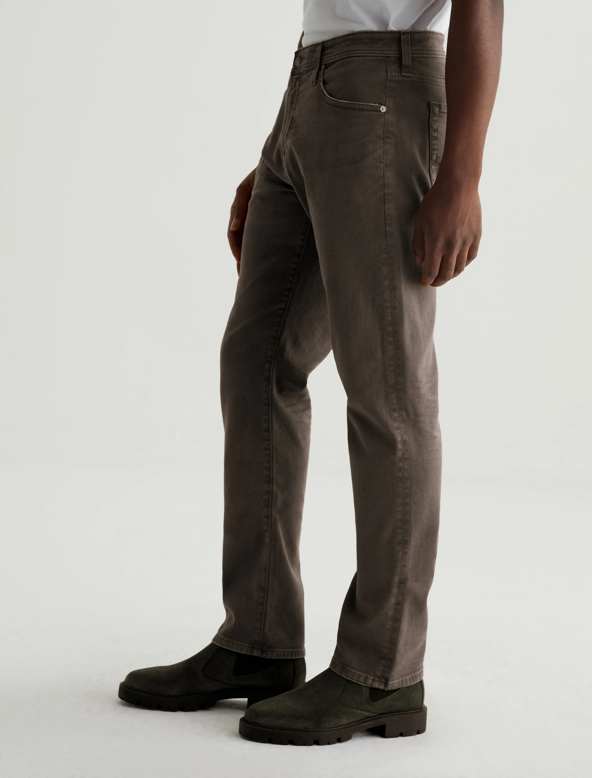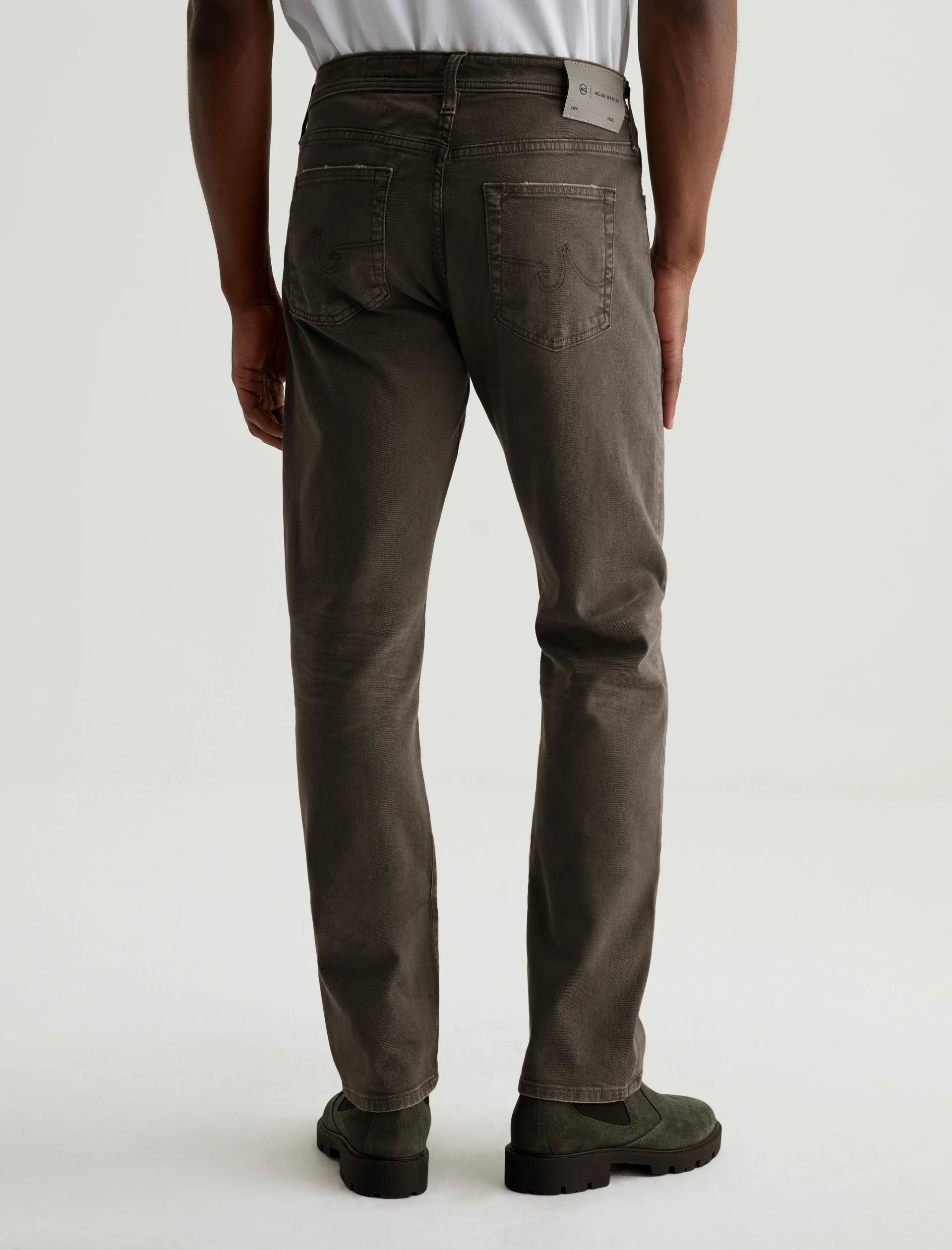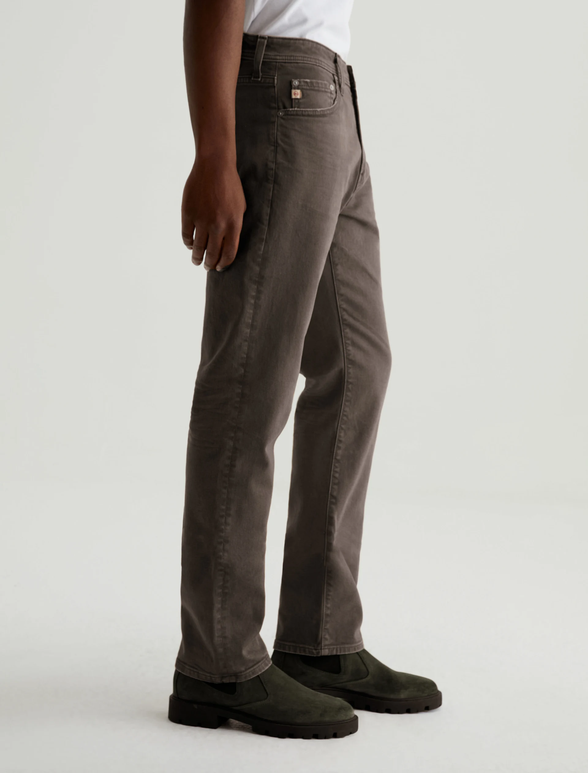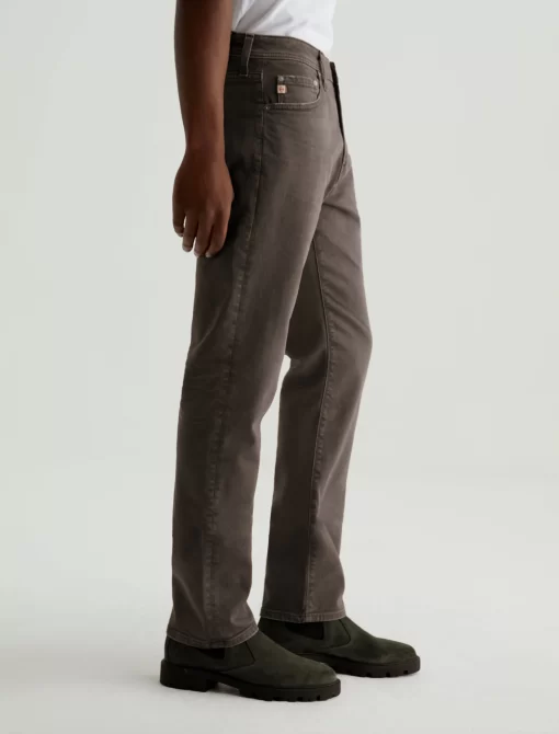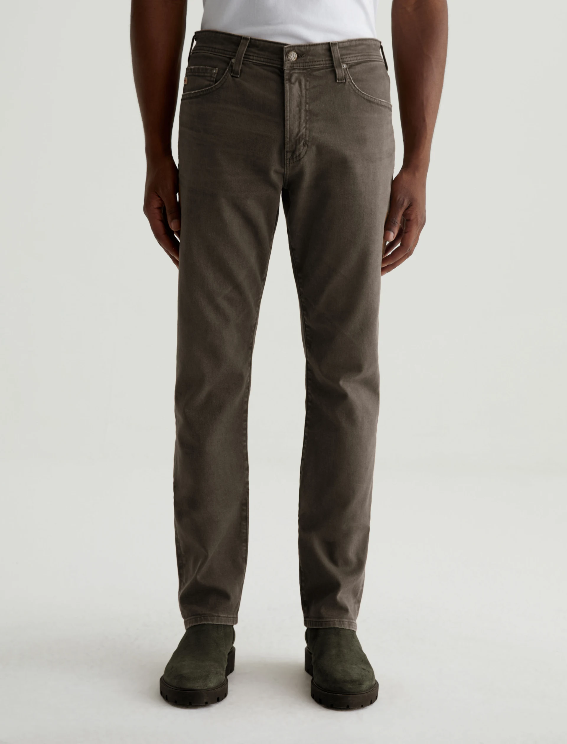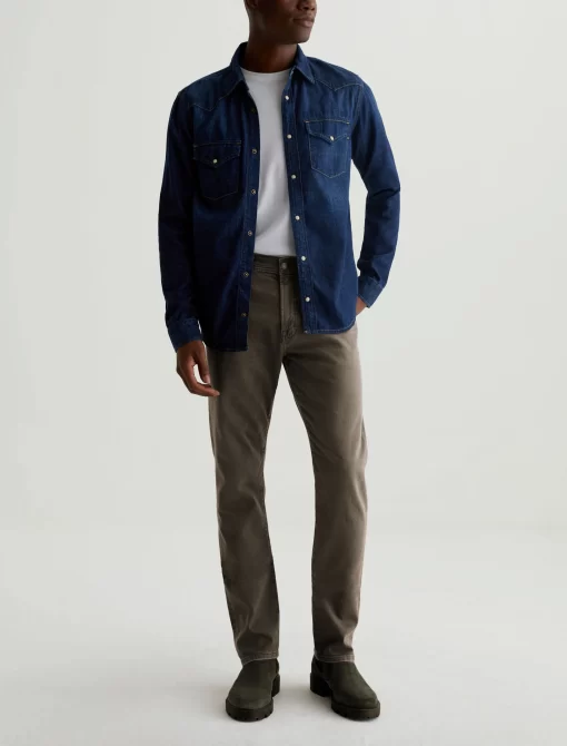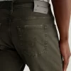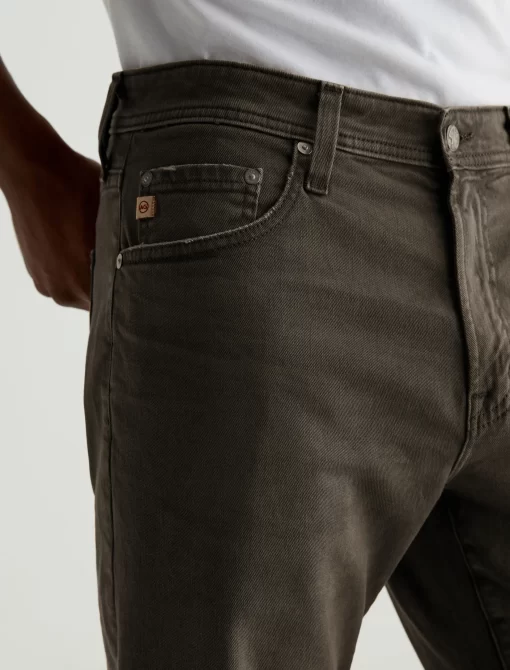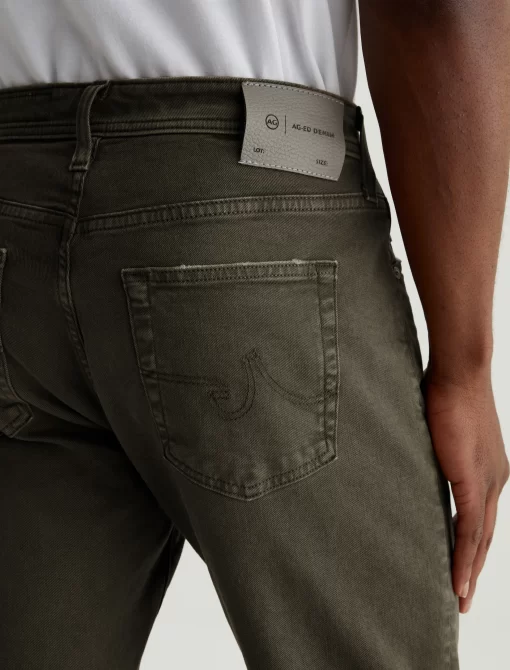 Everett is a slim-straight men’s jean updated in a sulfur-dyed green shade with AG-ed™ fading and gently worn pocket edges. The style has a mid-rise waist and a straight fit that’s relaxed from hip to knee before slightly tapering at the leg opening. These slim-straight men’s jeans feature 8.7 oz. Hyper Soft White Bull