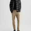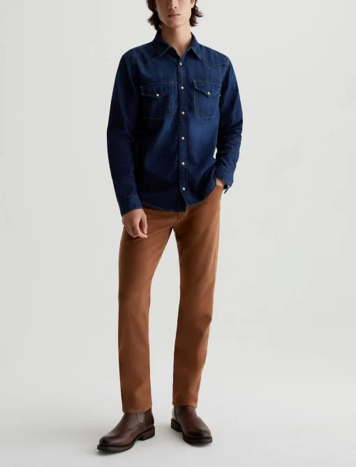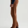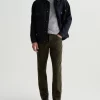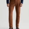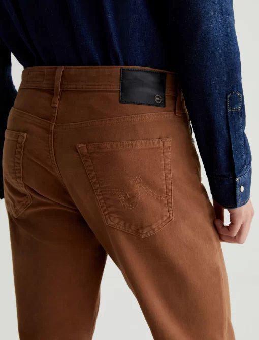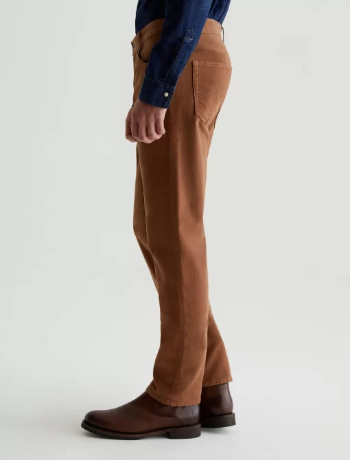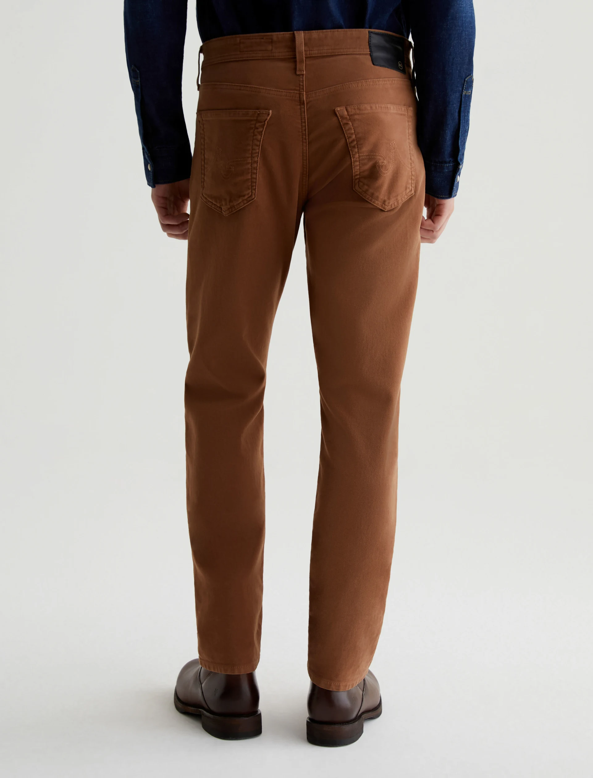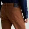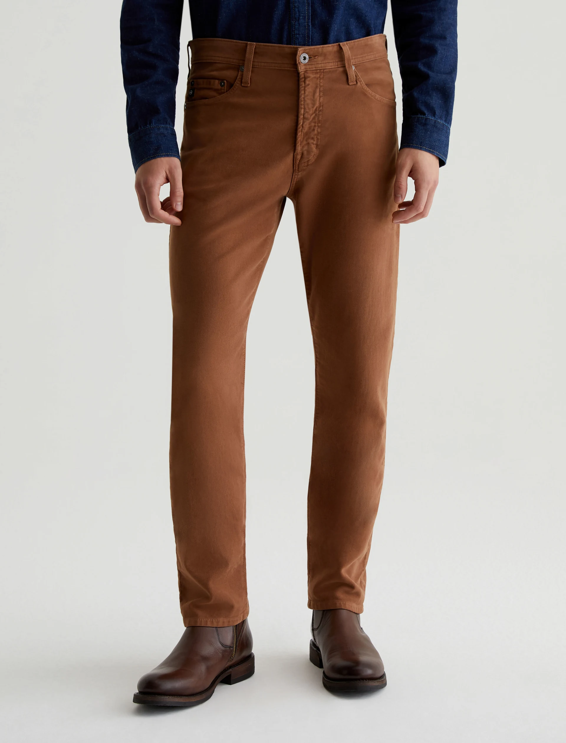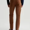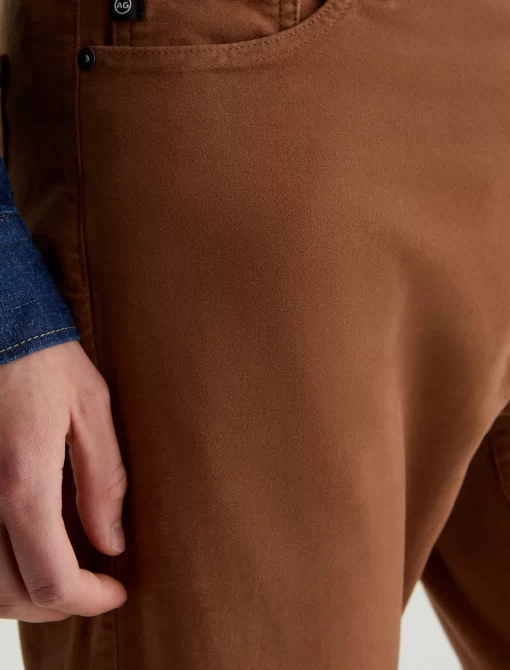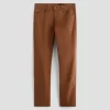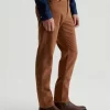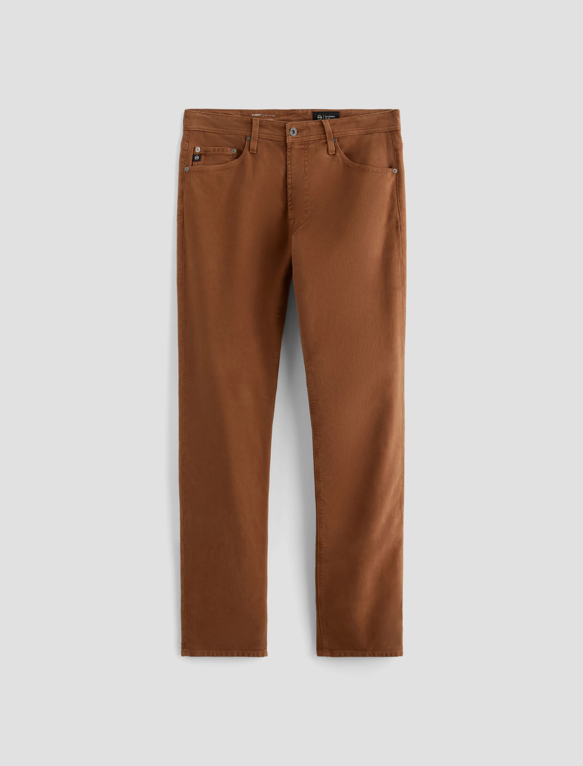 Everett is a slim-straight men’s fit designed in 8.7 oz. Brushed Stretch Moleskin, a soft and luxurious fabric from Japan. It’s done here in a rust shade. The five-pocket style has a comfortable mid-rise waist and a straight fit that’s relaxed from hip to knee before slightly tapering at the leg opening.