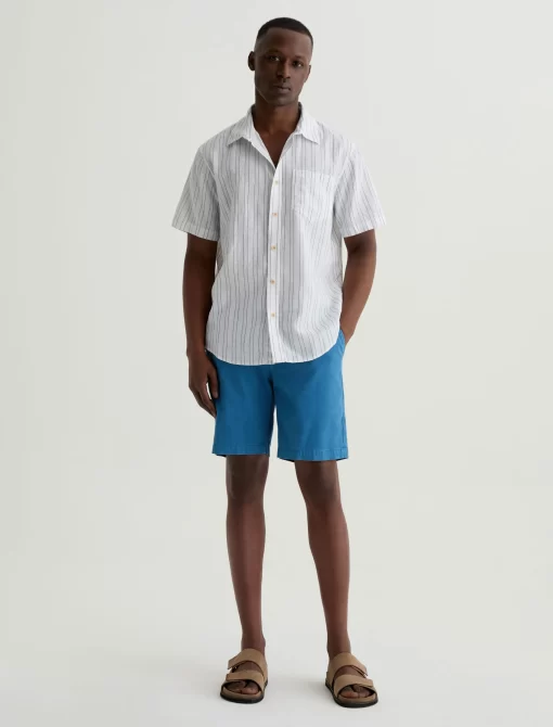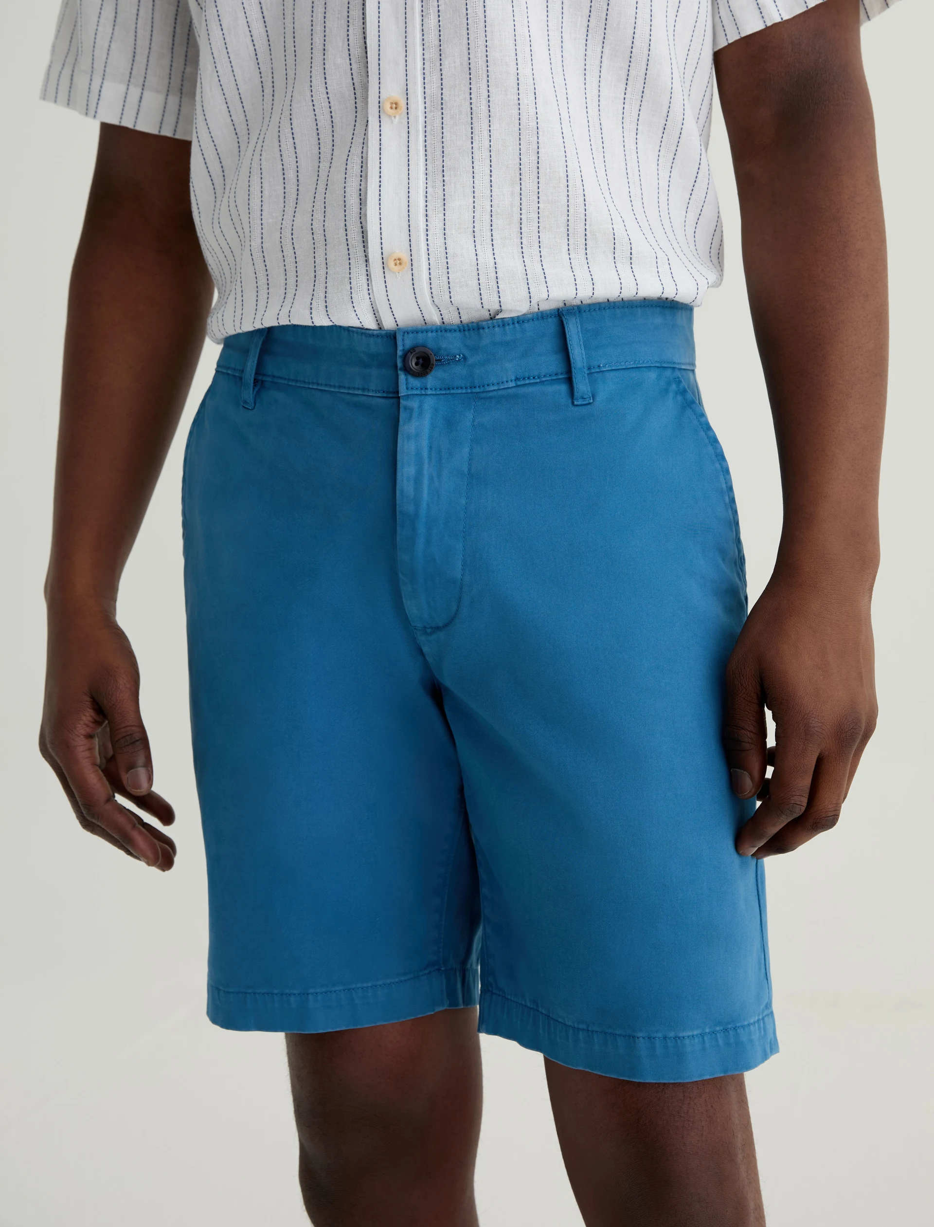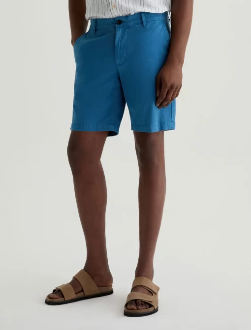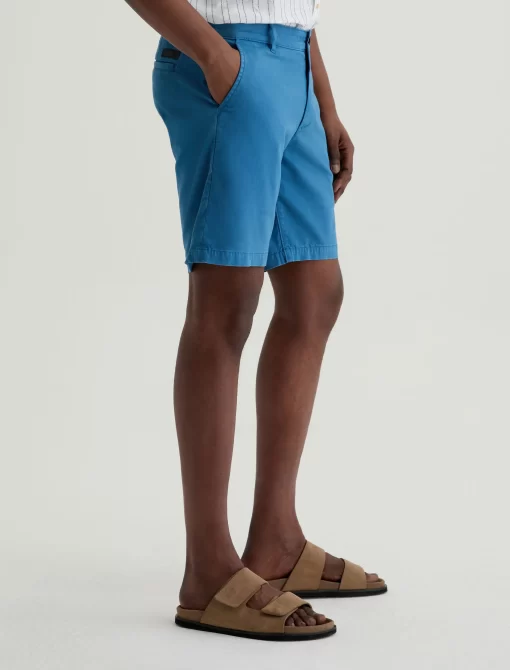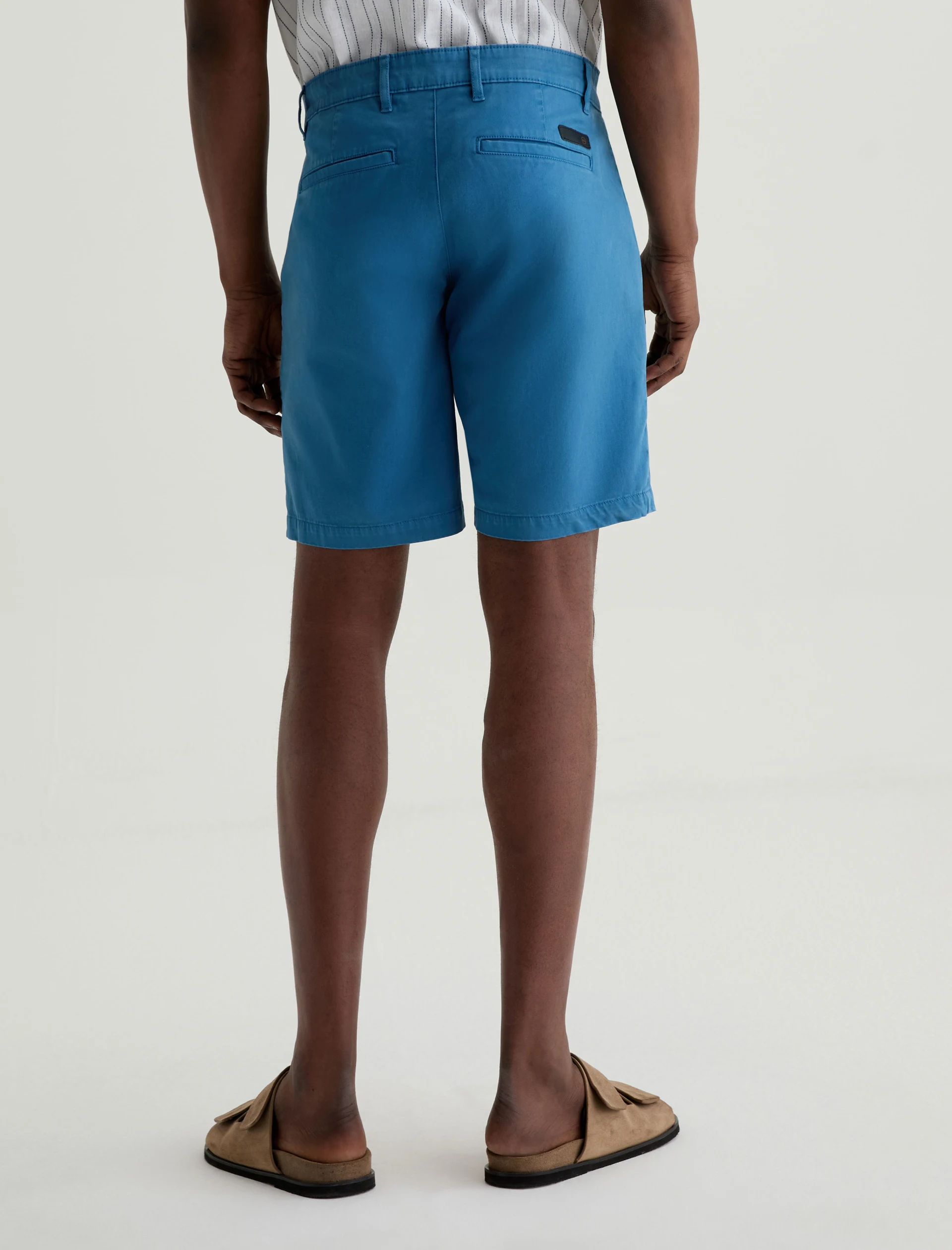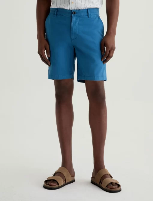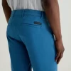 The men’s Wanderer Short is a mid-rise style with an 8.5” inseam and a slim trouser fit. This Sulfur Baja Blue short is crafted from 7.4 oz. Brighton Sueded Sateen, it offers a polished look with a soft, refined feel.