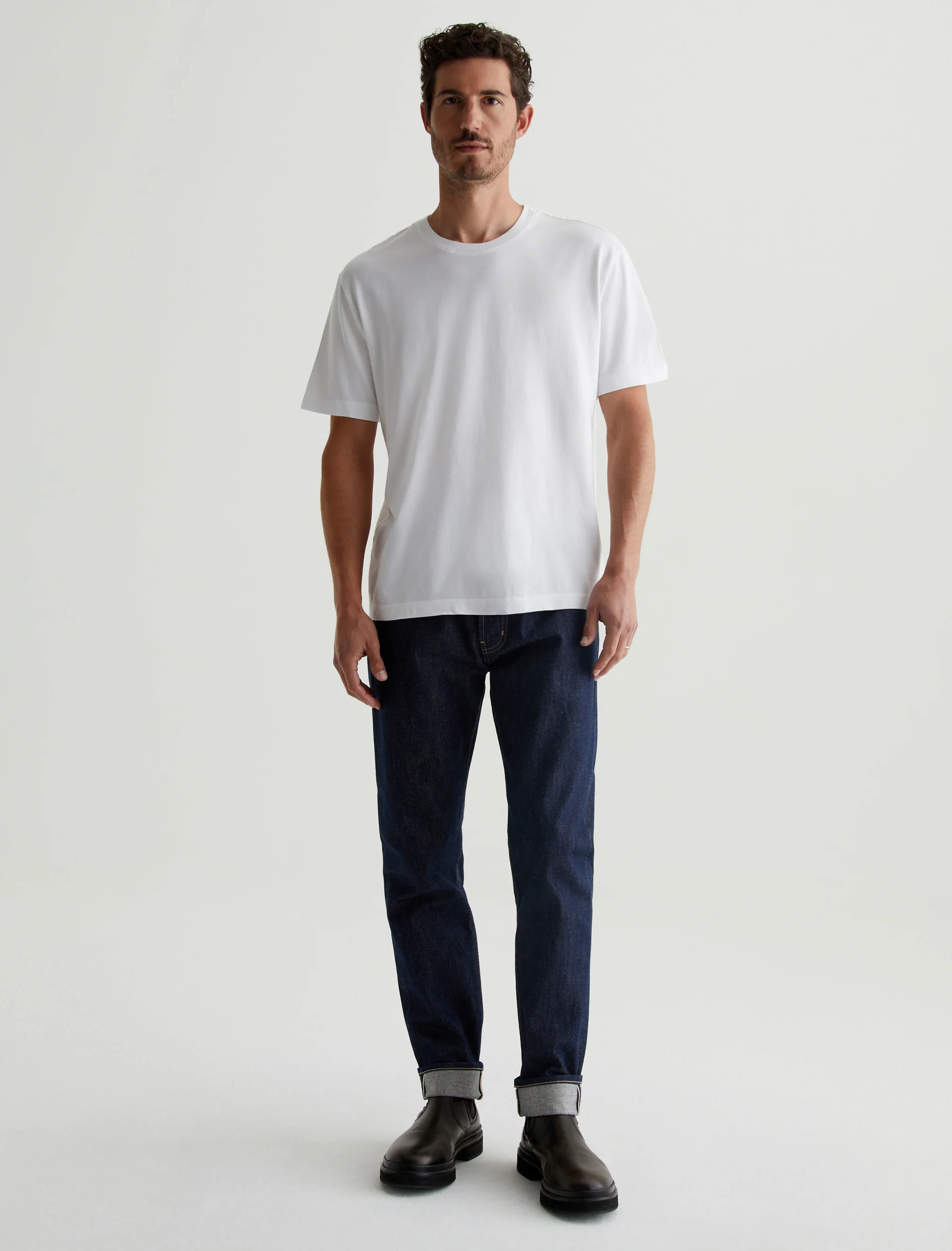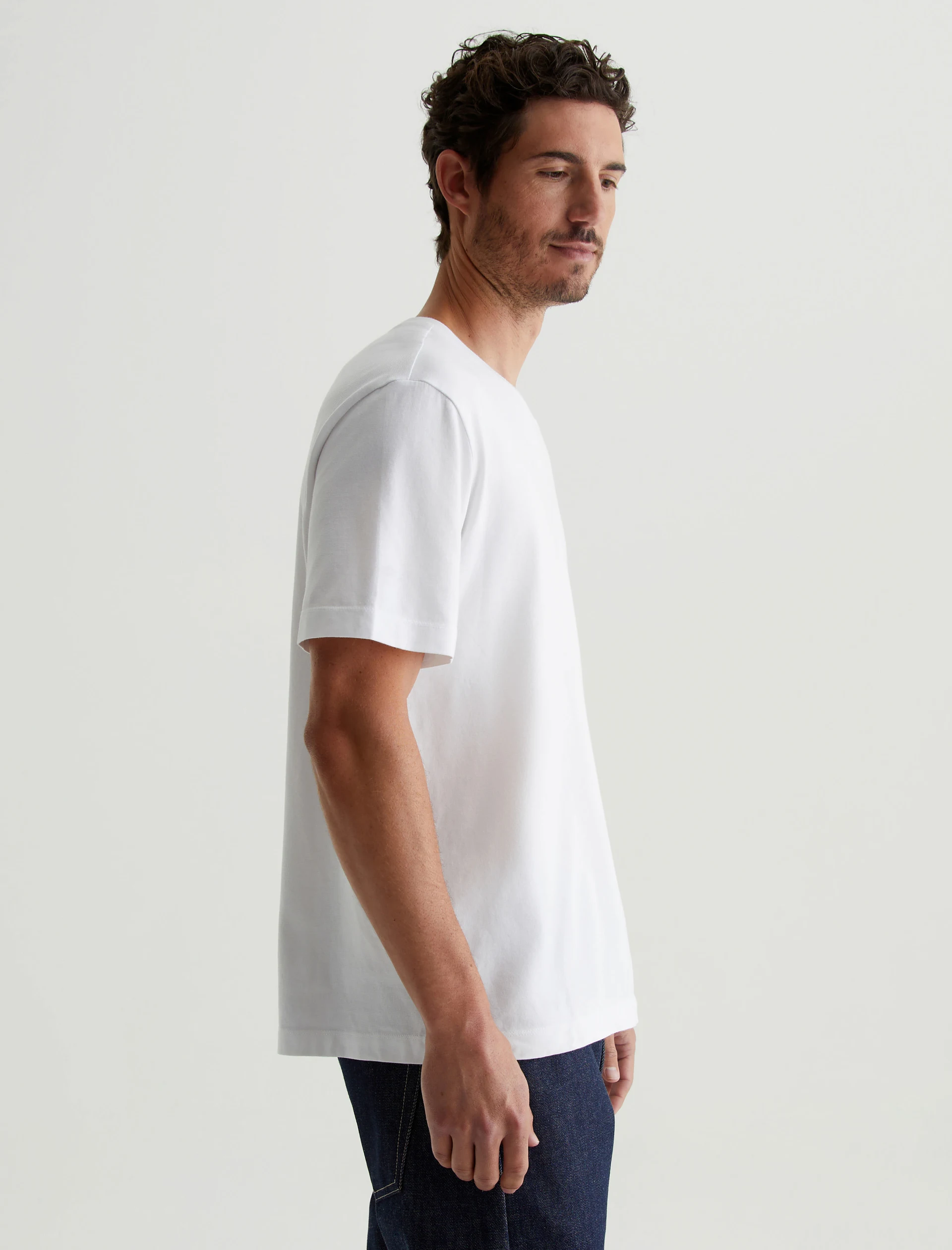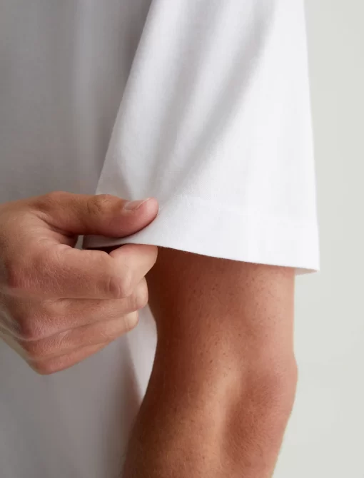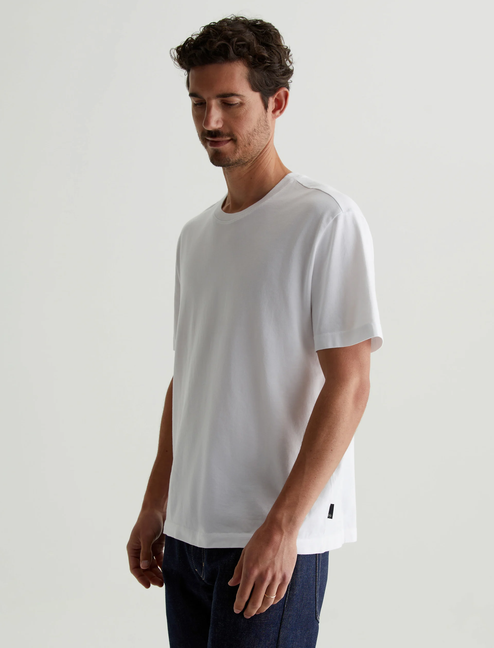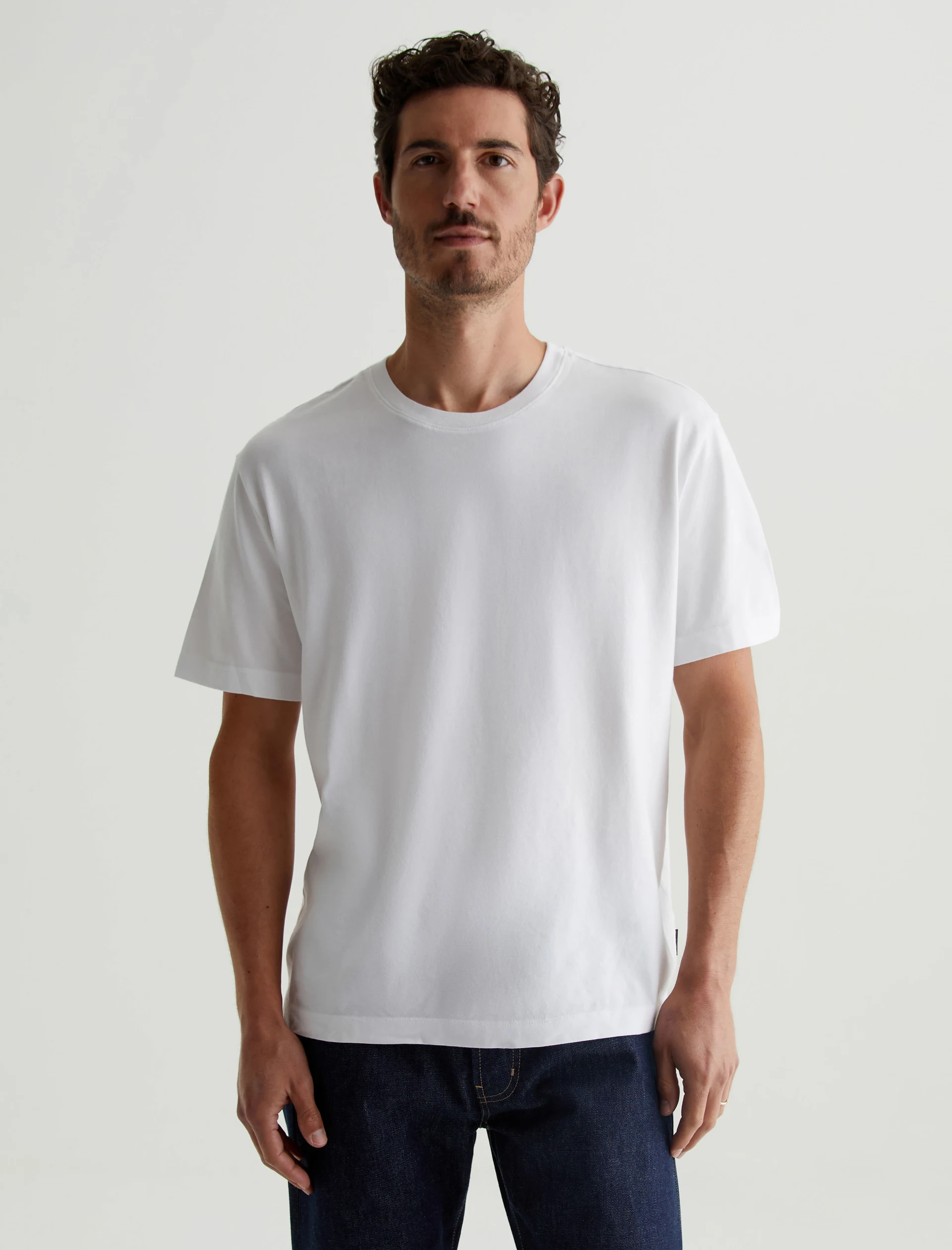The Wesley Crew in white is a relaxed short-sleeve tee for men. The tee offers drop shoulder detailing and wider hem for a more fashion forward fit. Our Jersey Knit offers a luxurious comfort that is unrivaled—knitted with both S-twist and Z-twist yarn to sustain longevity and stability, preventing unnecessary twisting