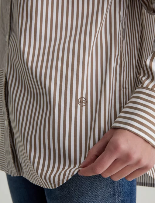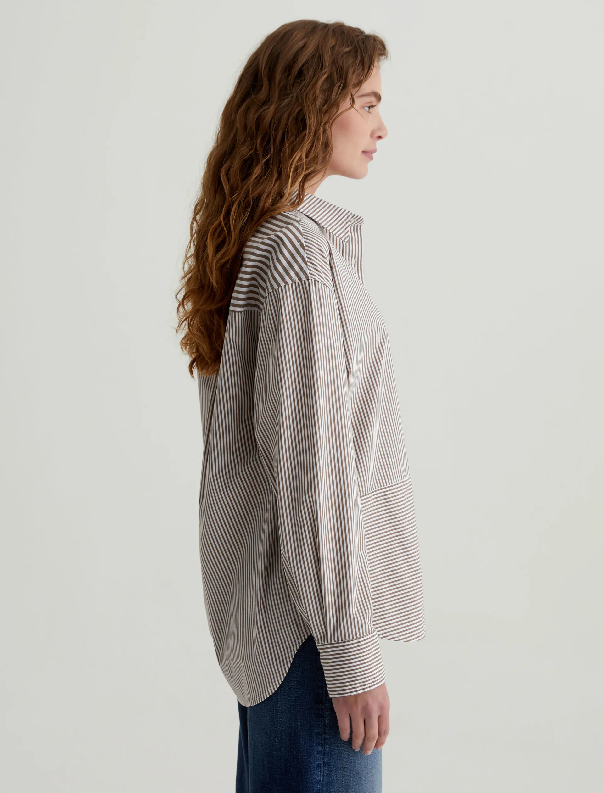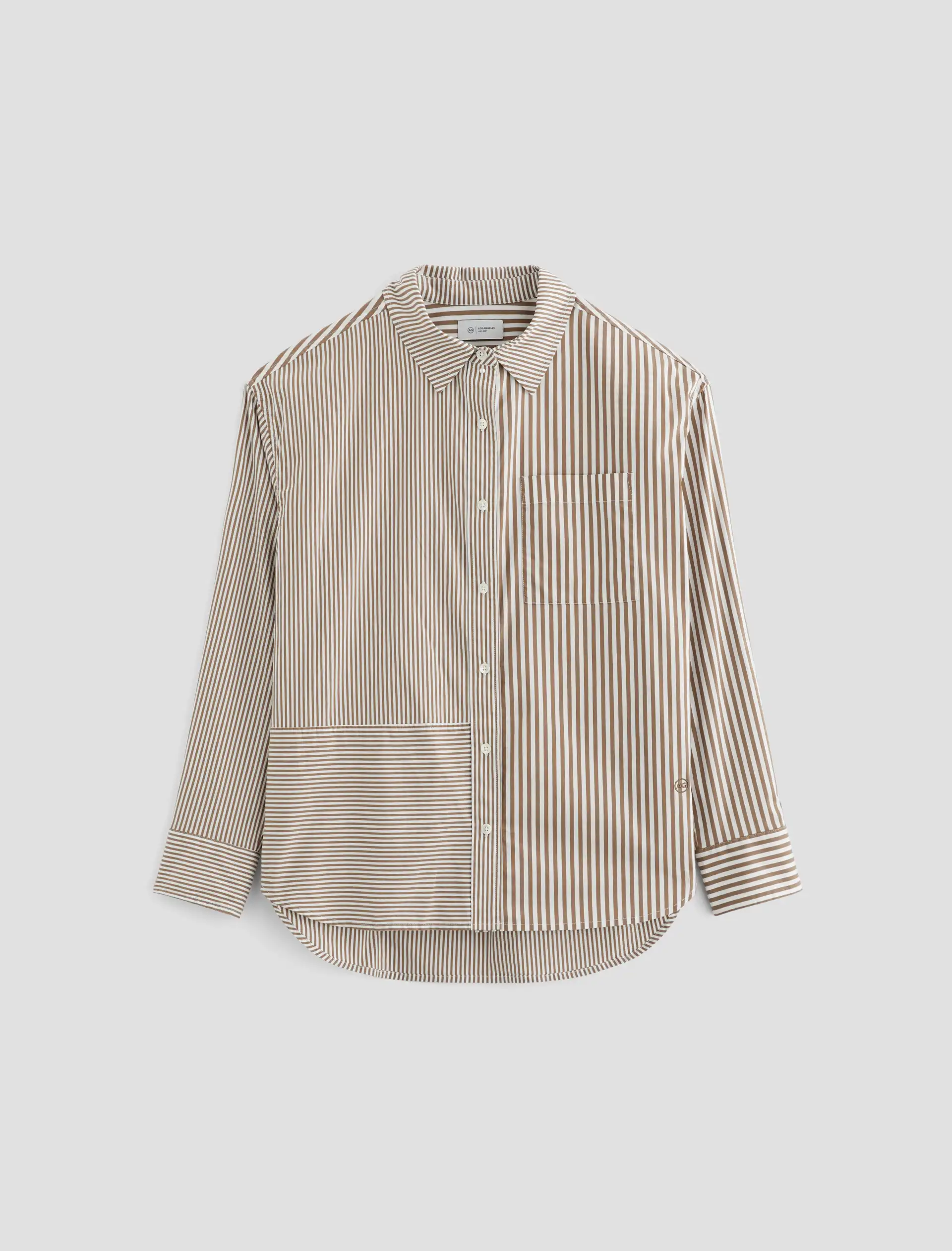 The Addison Shirt takes inspiration from vintage men’s styles. Cut from stretch cotton-nylon poplin, it’s patterned with a mix of vertical stripes and horizontal stripe paneling. This long-sleeve button-up has a relaxed, oversized fit featuring a pointed collar, dropped shoulders, and a shirttail hem. Finished by a sin
