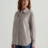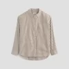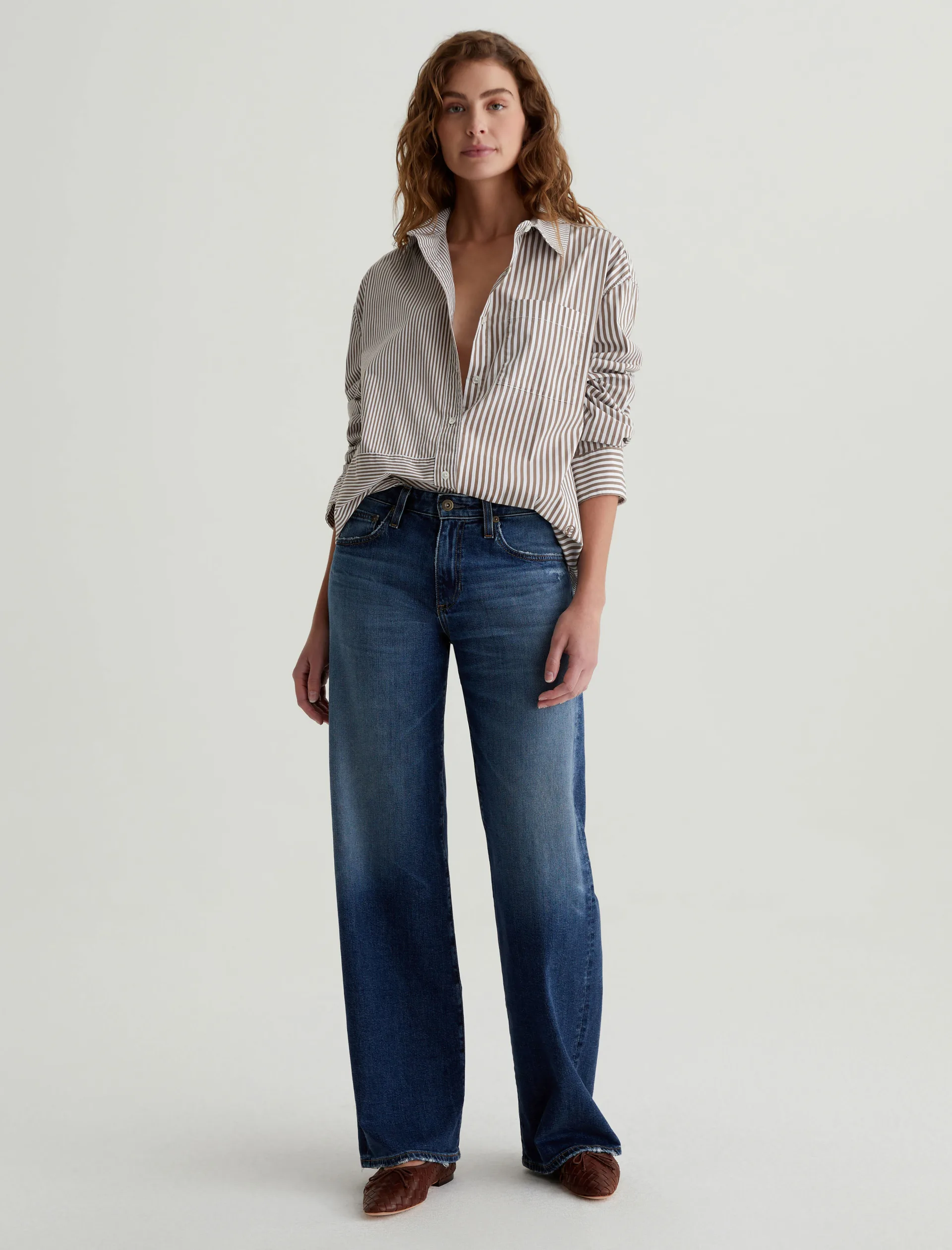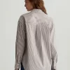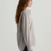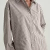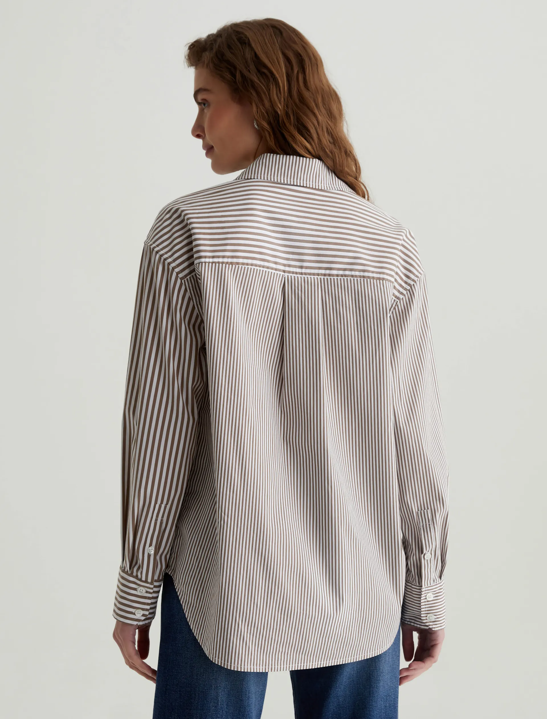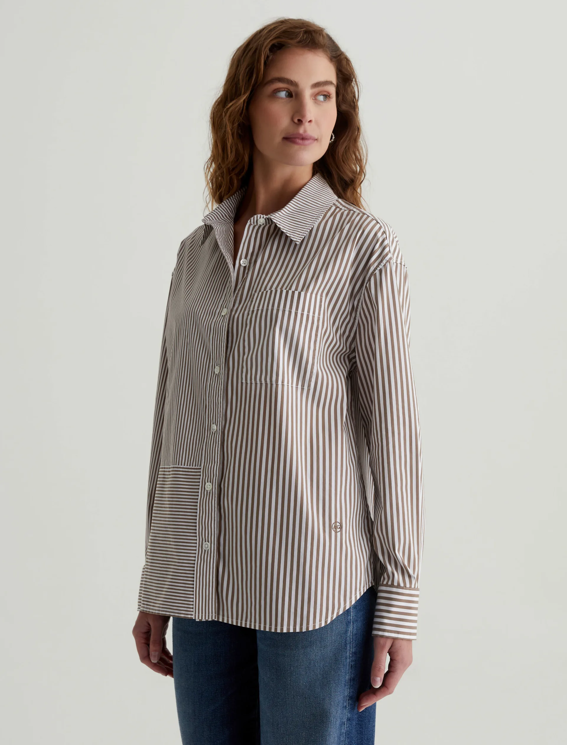 The Addison Shirt takes inspiration from vintage men’s styles. Cut from stretch cotton-nylon poplin, it’s patterned with a mix of vertical stripes and horizontal stripe paneling. This long-sleeve button-up has a relaxed, oversized fit featuring a pointed collar, dropped shoulders, and a shirttail hem. Finished by a sin