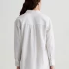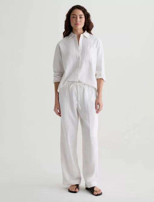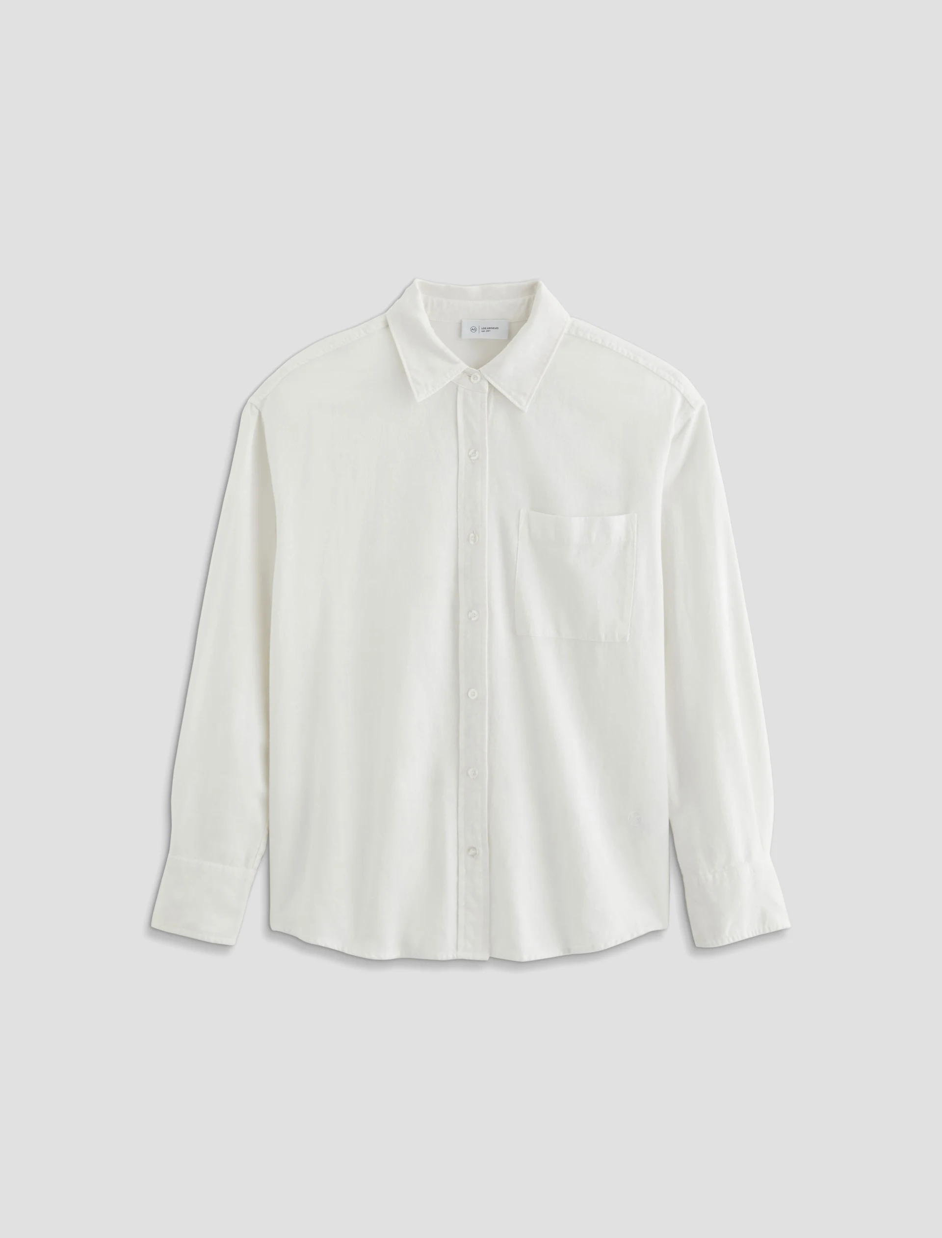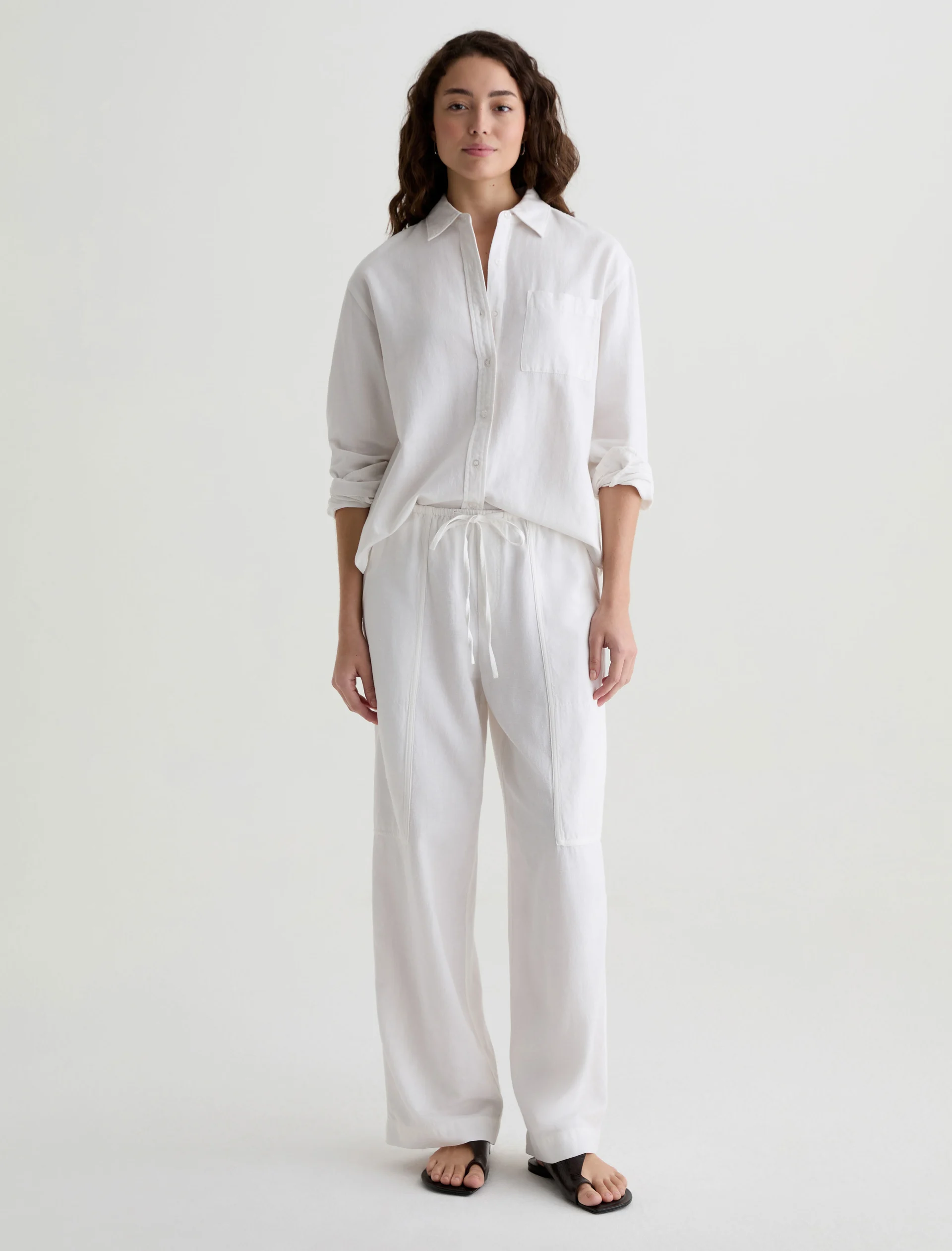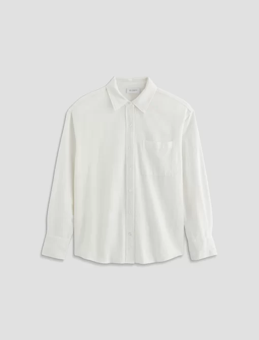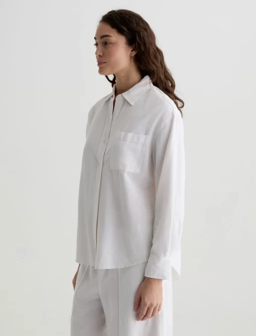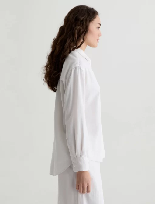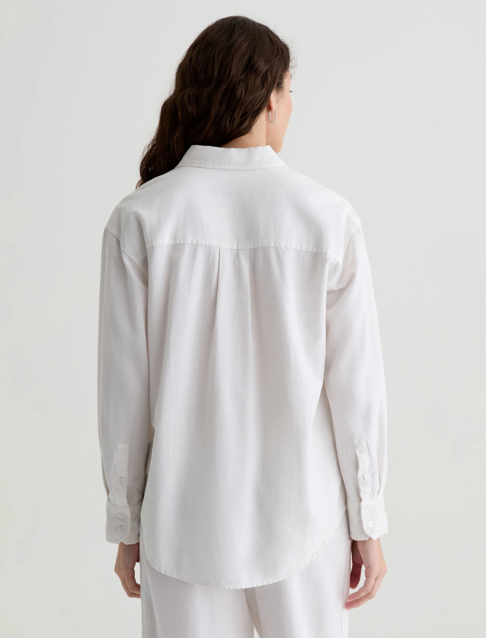 The Addison Shirt is a lightweight, long-sleeve button-up made from a 55% linen and 45% cupro rayon blend. This fabric combines the breathable texture of linen with the soft drape and smooth feel of cupro. Designed with an oversized fit, this White blouse features dropped shoulders, a structured collar, and buttoned cu