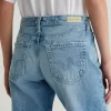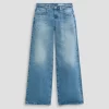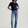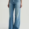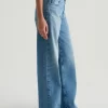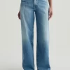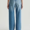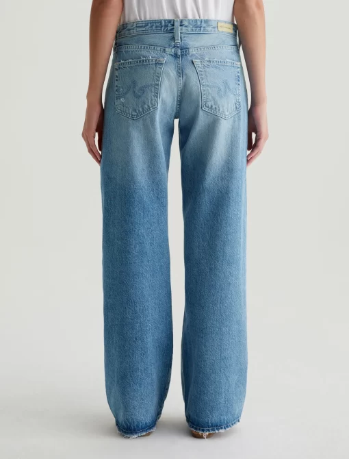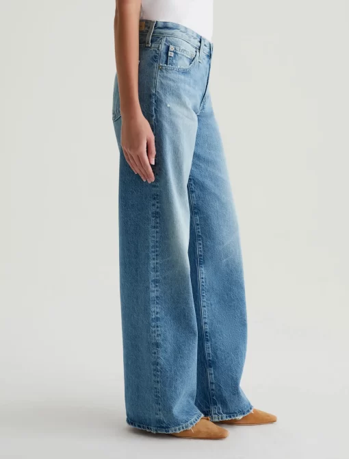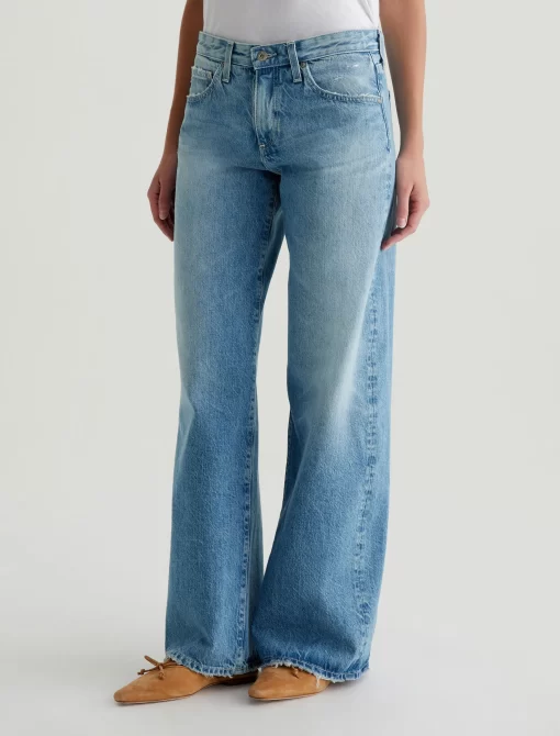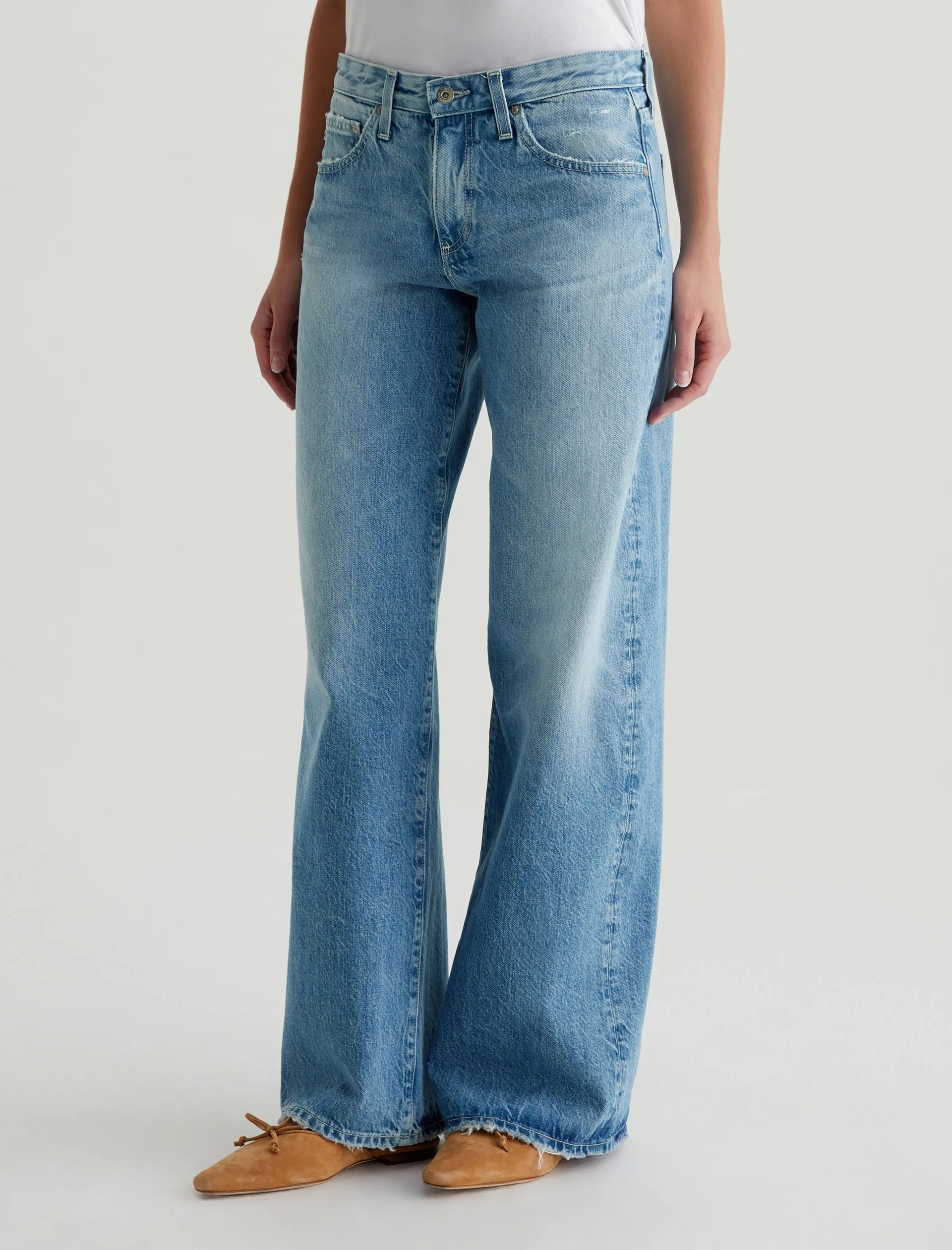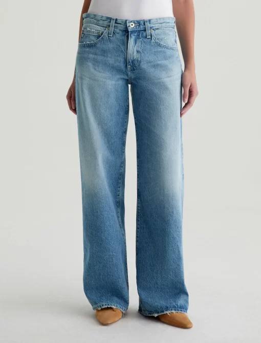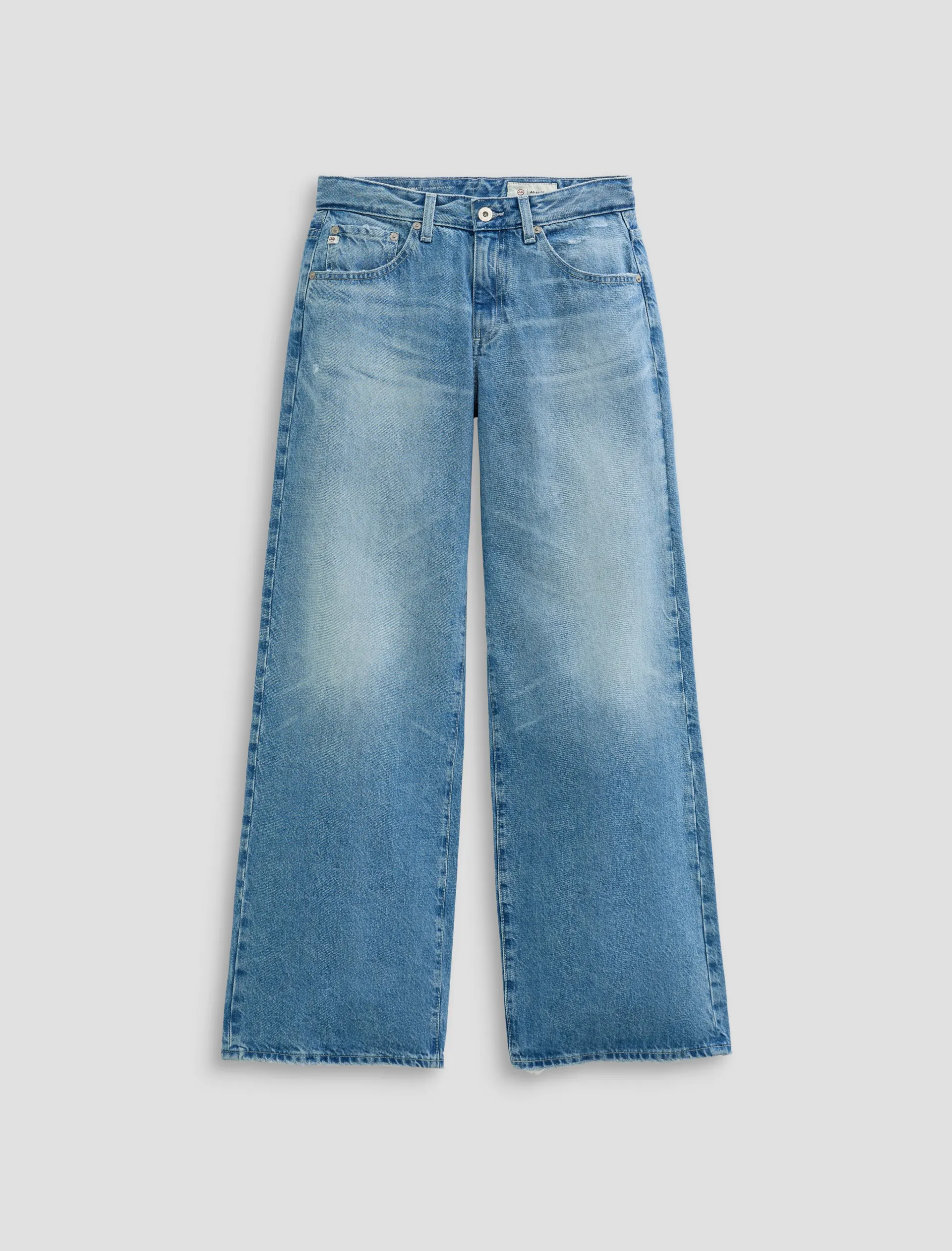Adria is a low-rise wide-leg jean that hangs low on the hips for a relaxed, slouchy look. These five-pocket jeans fit loose and wide through the legs, designed to puddle at the hems. Made from midweight 13 oz. Sioux Rigid Denim in 100% cotton, the pair features an AG-ed™ light indigo wash with fading and nicks of distr