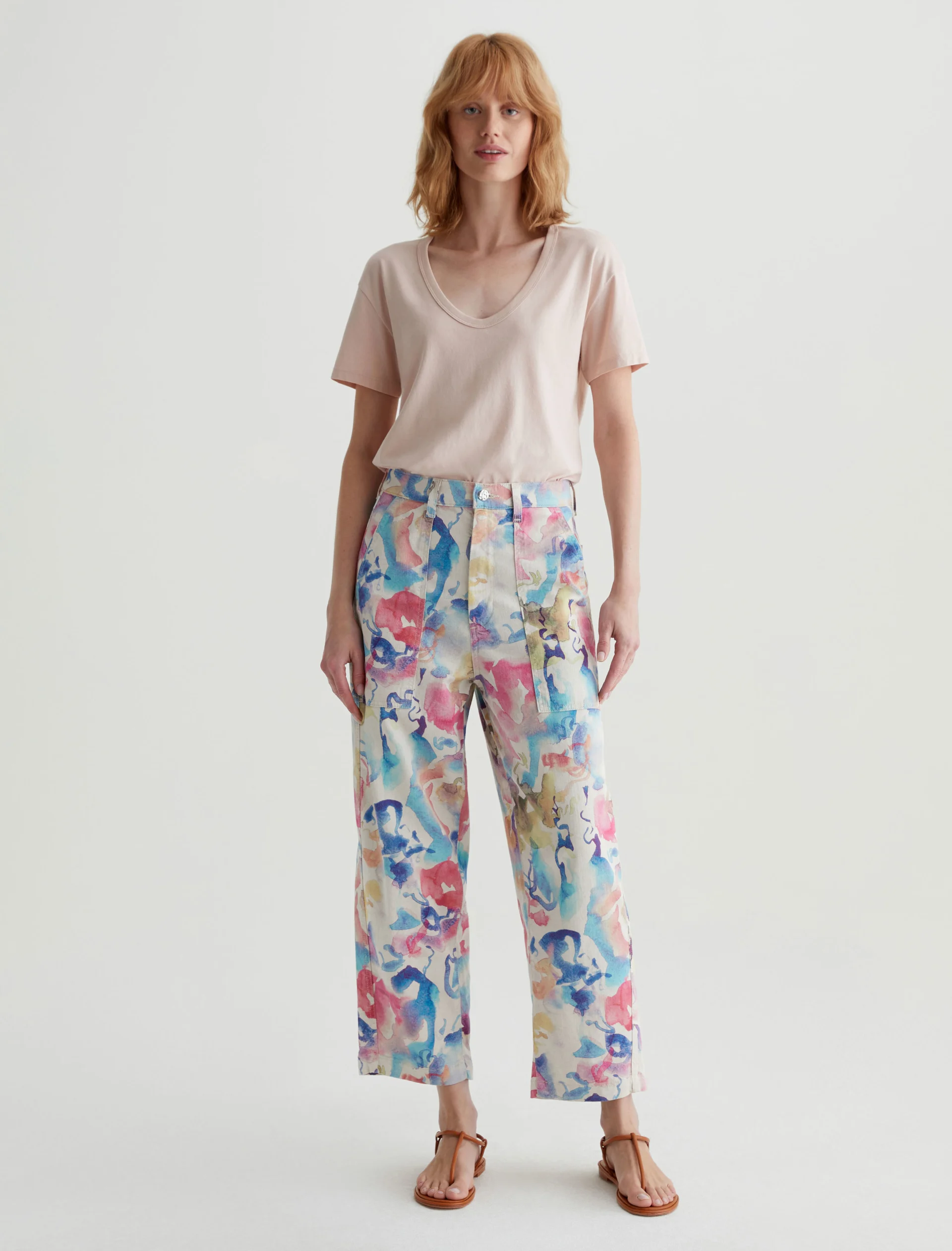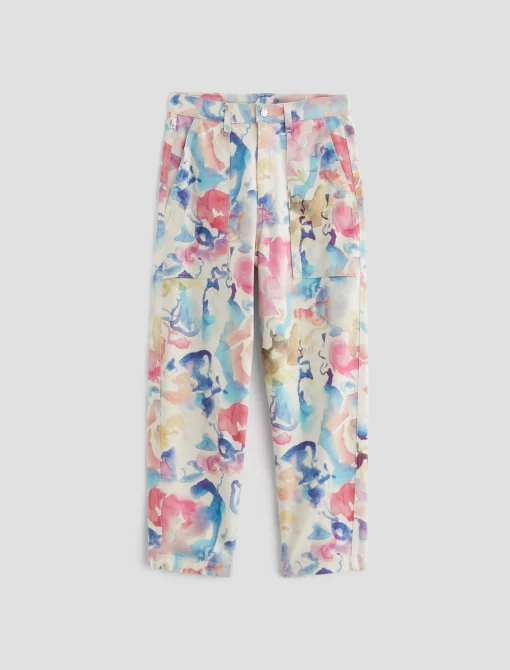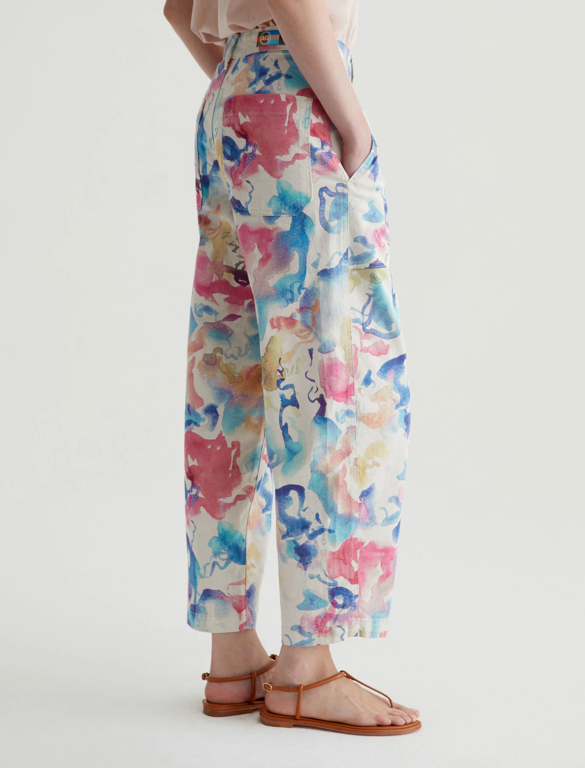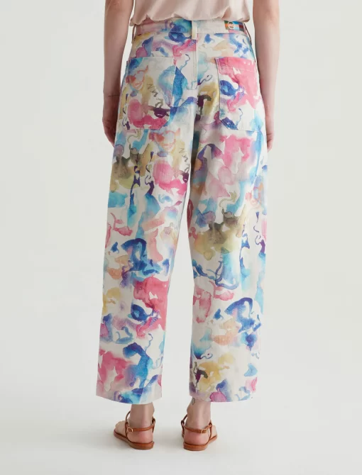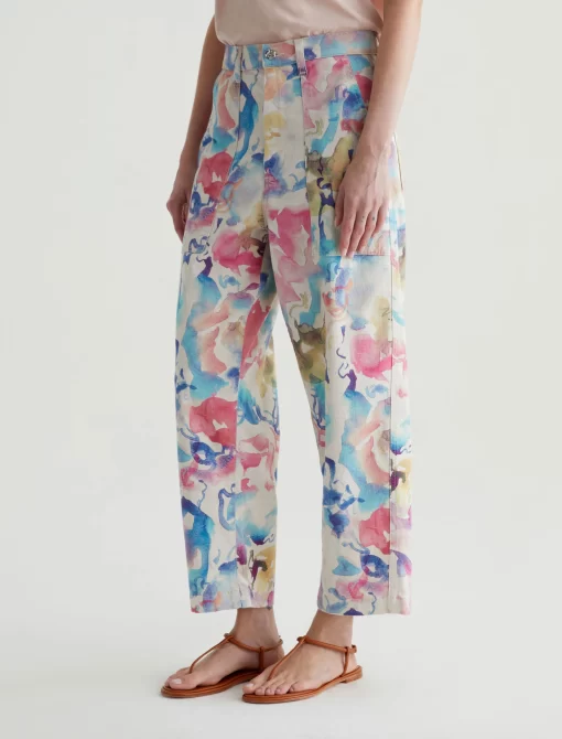 Our Camille utility barrel-leg pants make the perfect canvas for a unique watercolor print. Cut from a comfortable stretch-linen blend, this style has an ultra-high waist, workwear-inspired front pockets, and a loose, cropped fit through the legs. Roomy back pockets finish the look. About the Art Project print: Waterco
