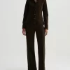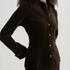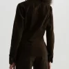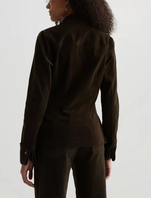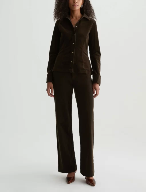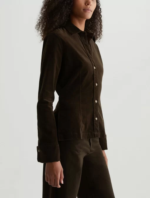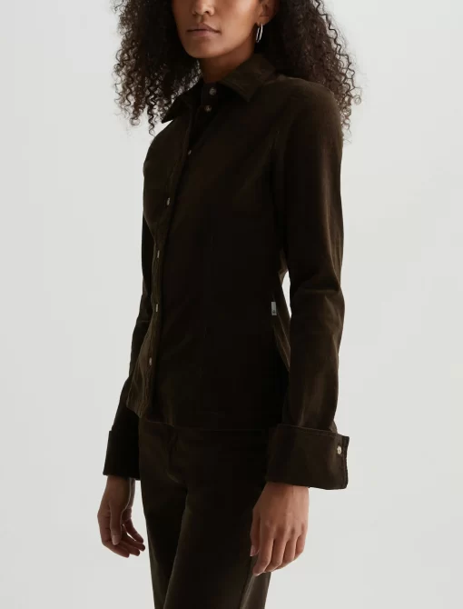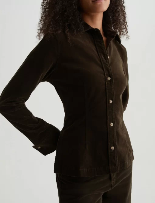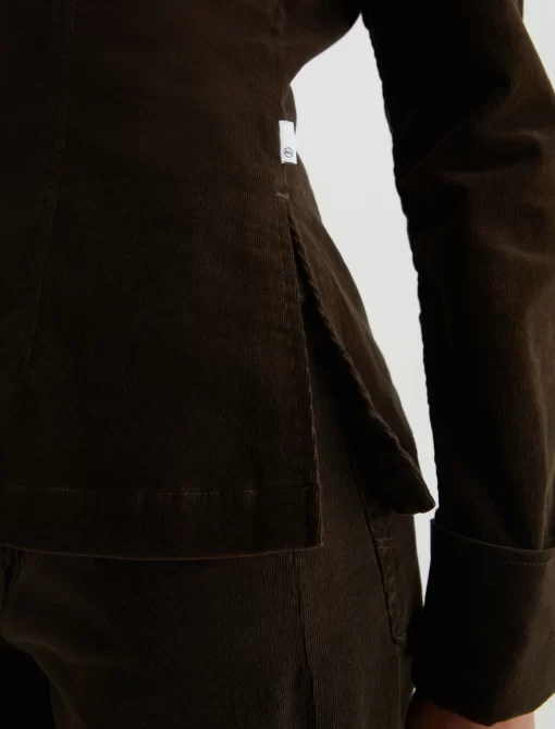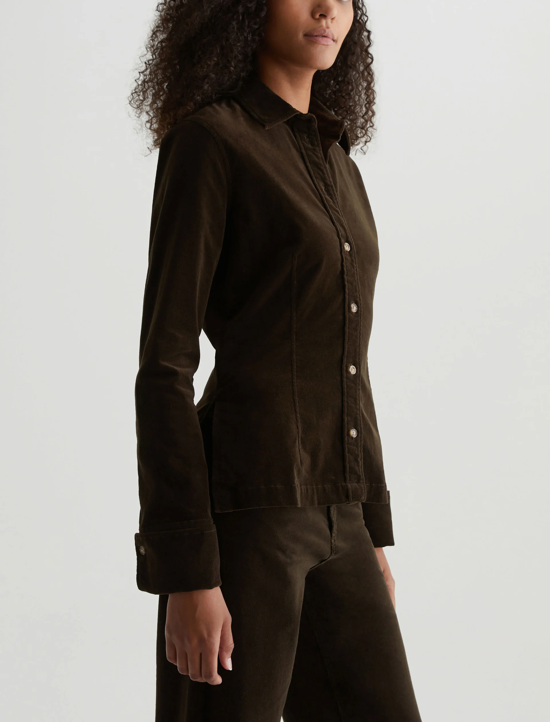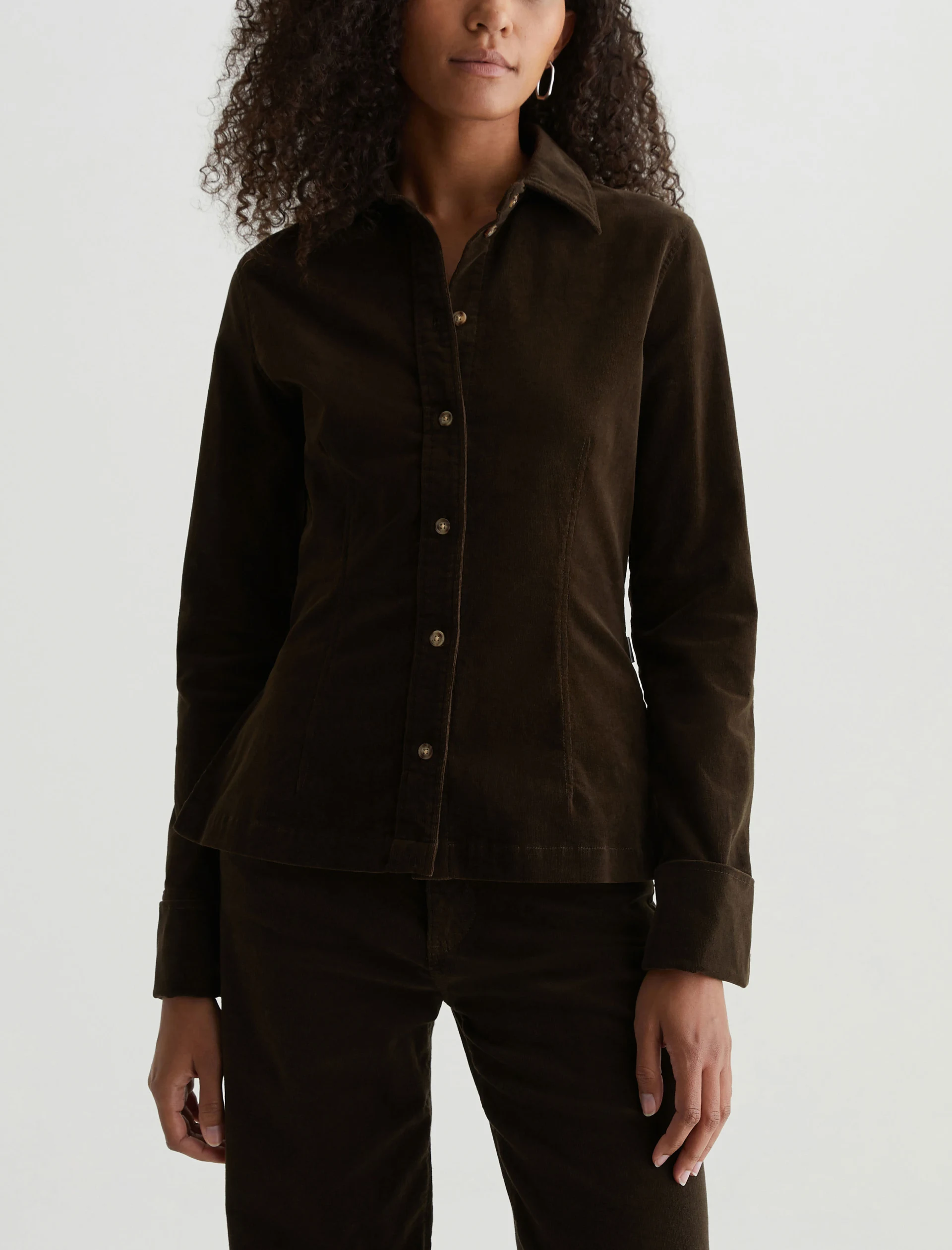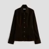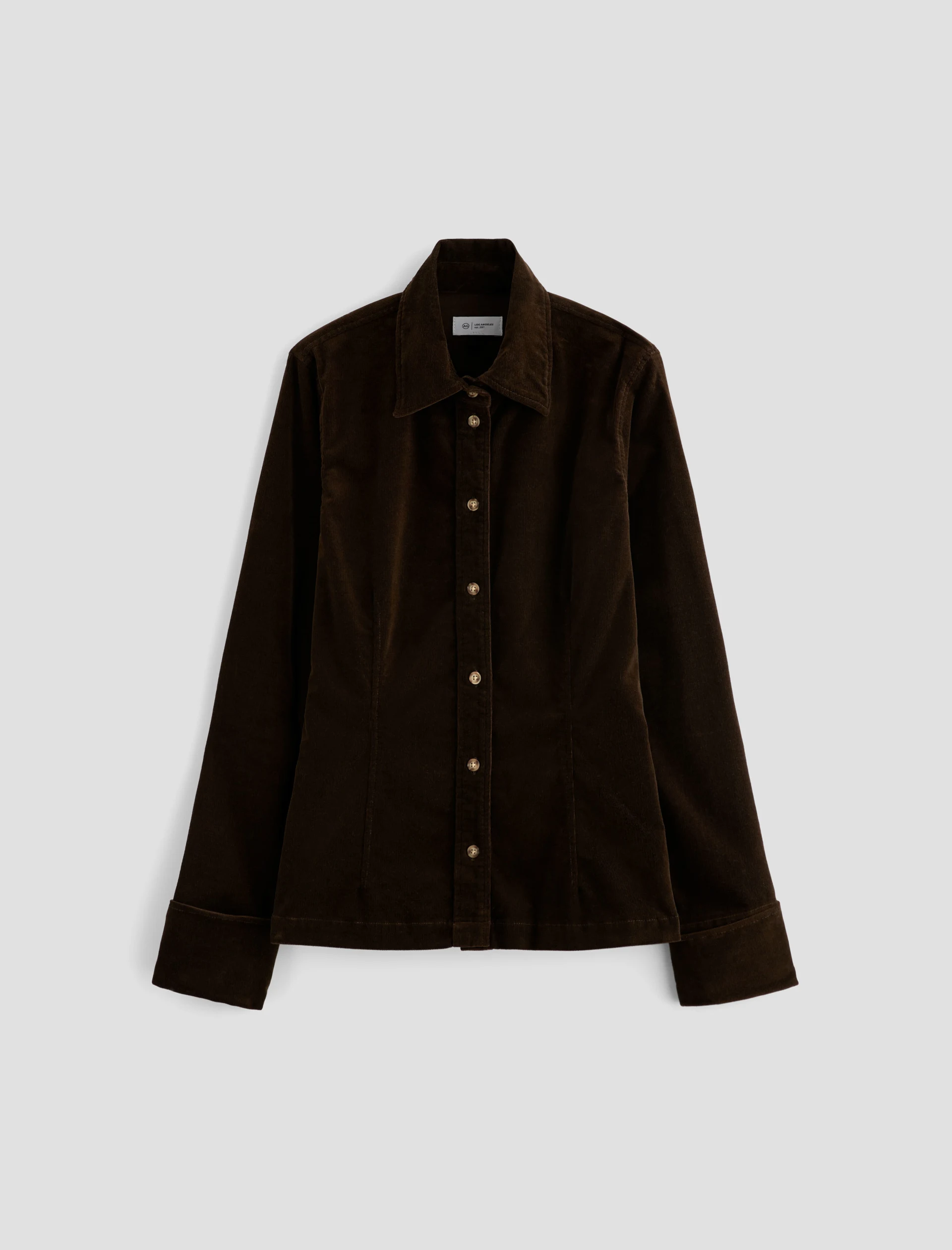 Darted for an hourglass silhouette, the Cheryl Shirt contours the body to accentuate your shape. It boasts a plush feel and waist-defining fit in 8.3 oz. Novel Stretch Mini Corduroy from Italy. Featuring a rich brown shade, this fitted shirt includes a pointed collar, button placket, and long sleeves with french cuffs.