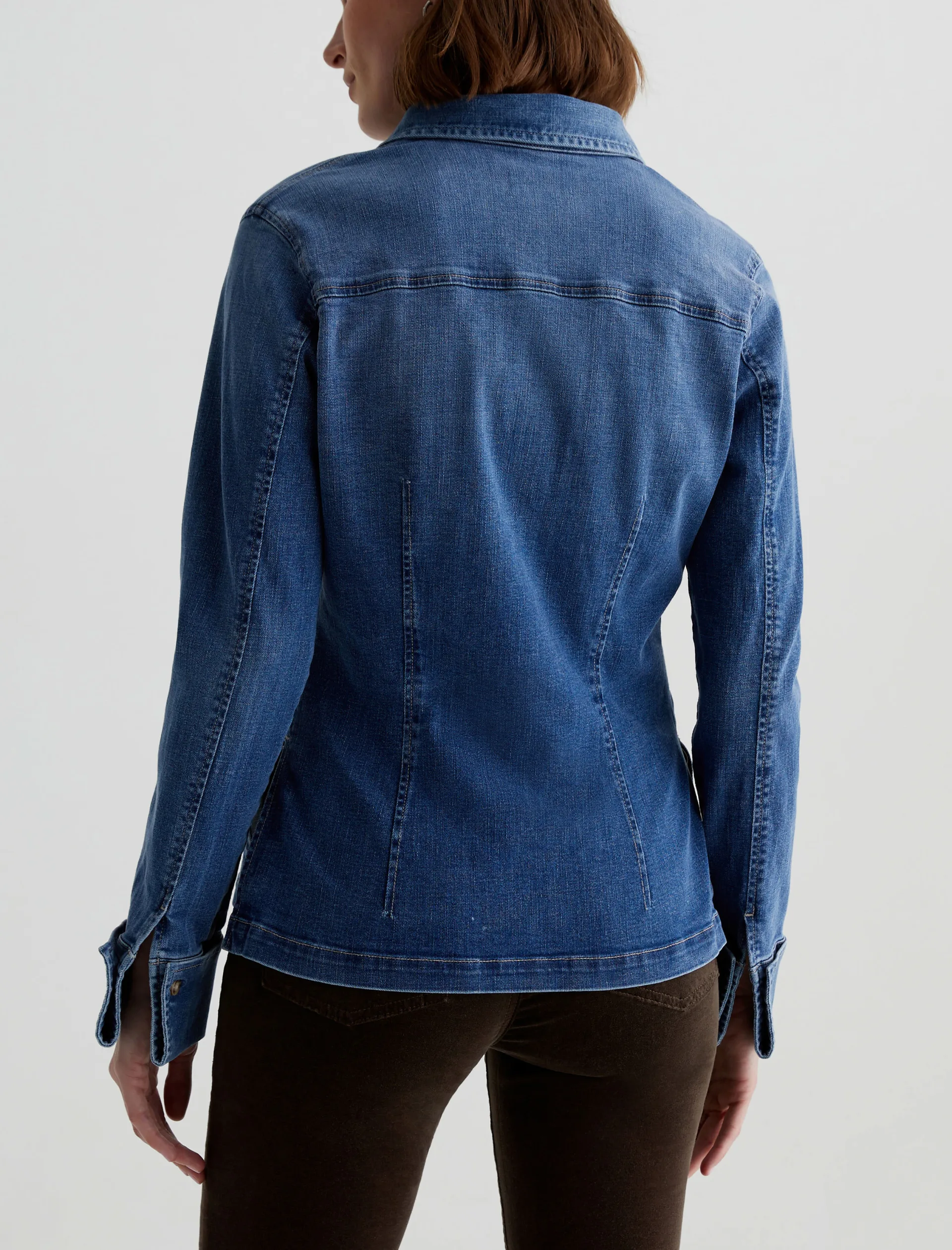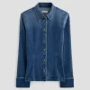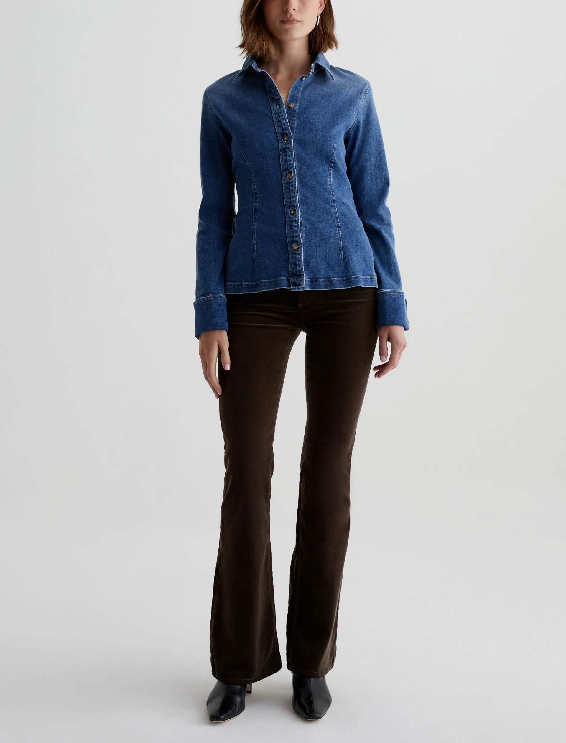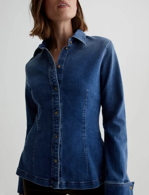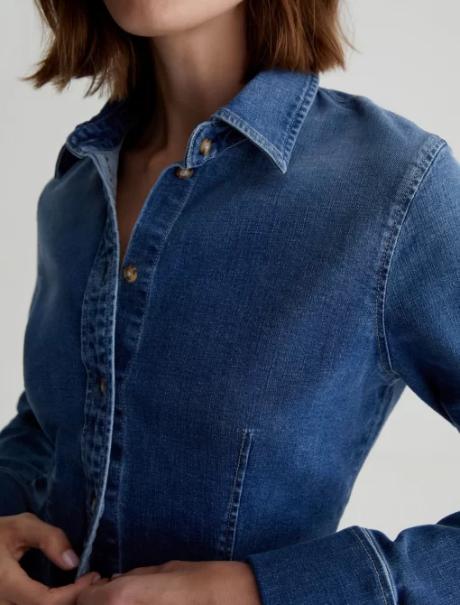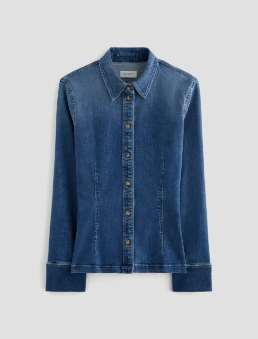 Darted for an hourglass silhouette, the Cheryl Shirt skims the body to accentuate your shape. It’s fitted and waist-defining in 10.2 oz. Crosshatch Comfort Stretch Denim. Washed to a medium-blue shade, this style features a pointed collar, buttons at the front, and long sleeves with french cuffs.