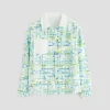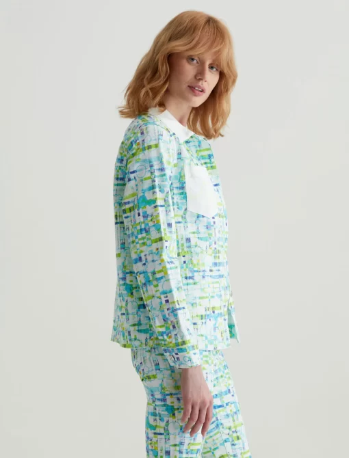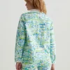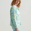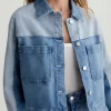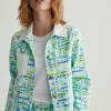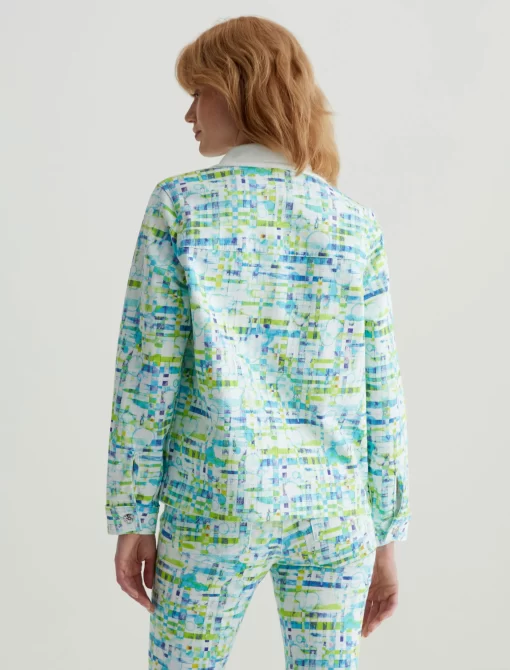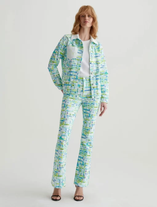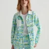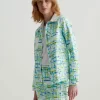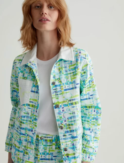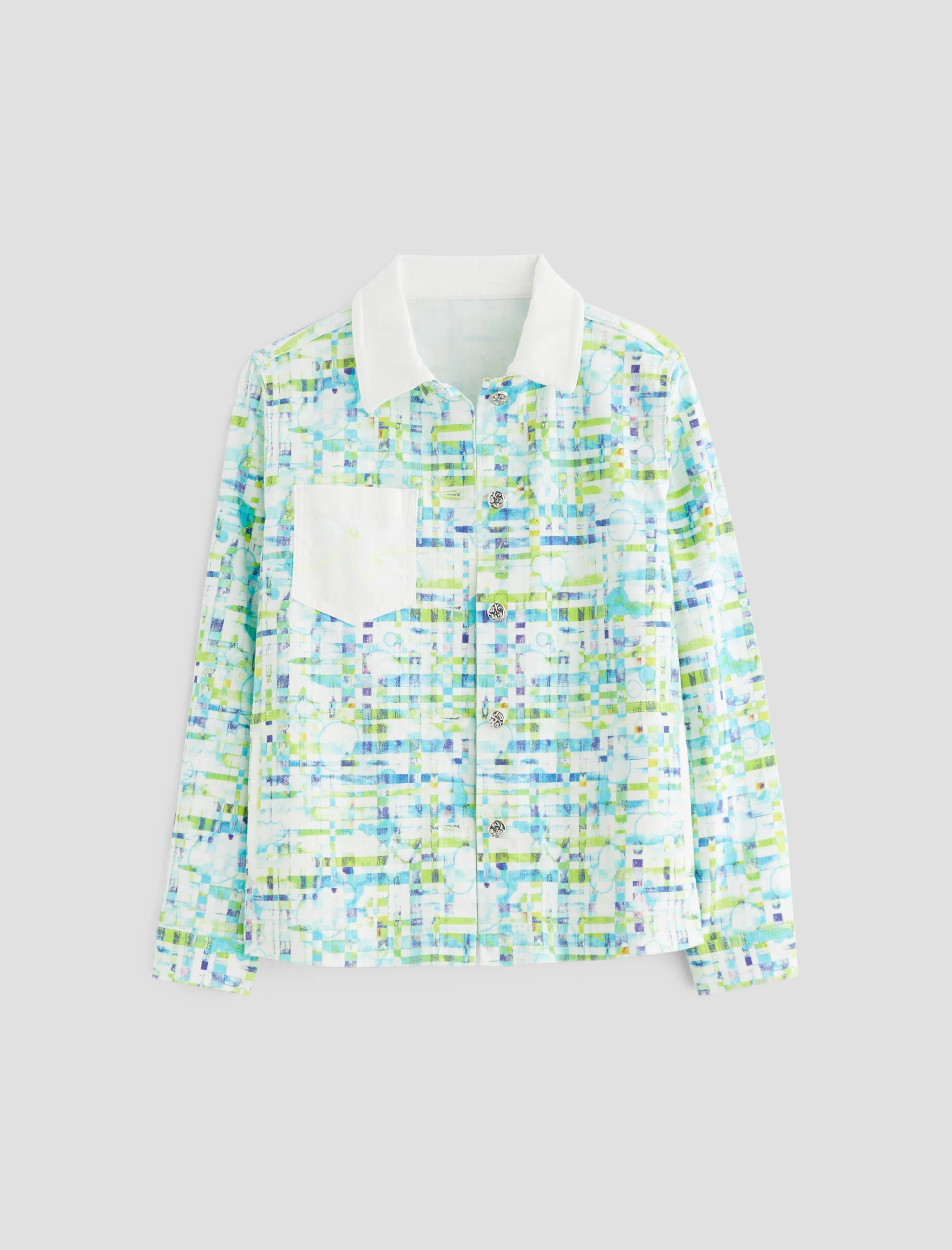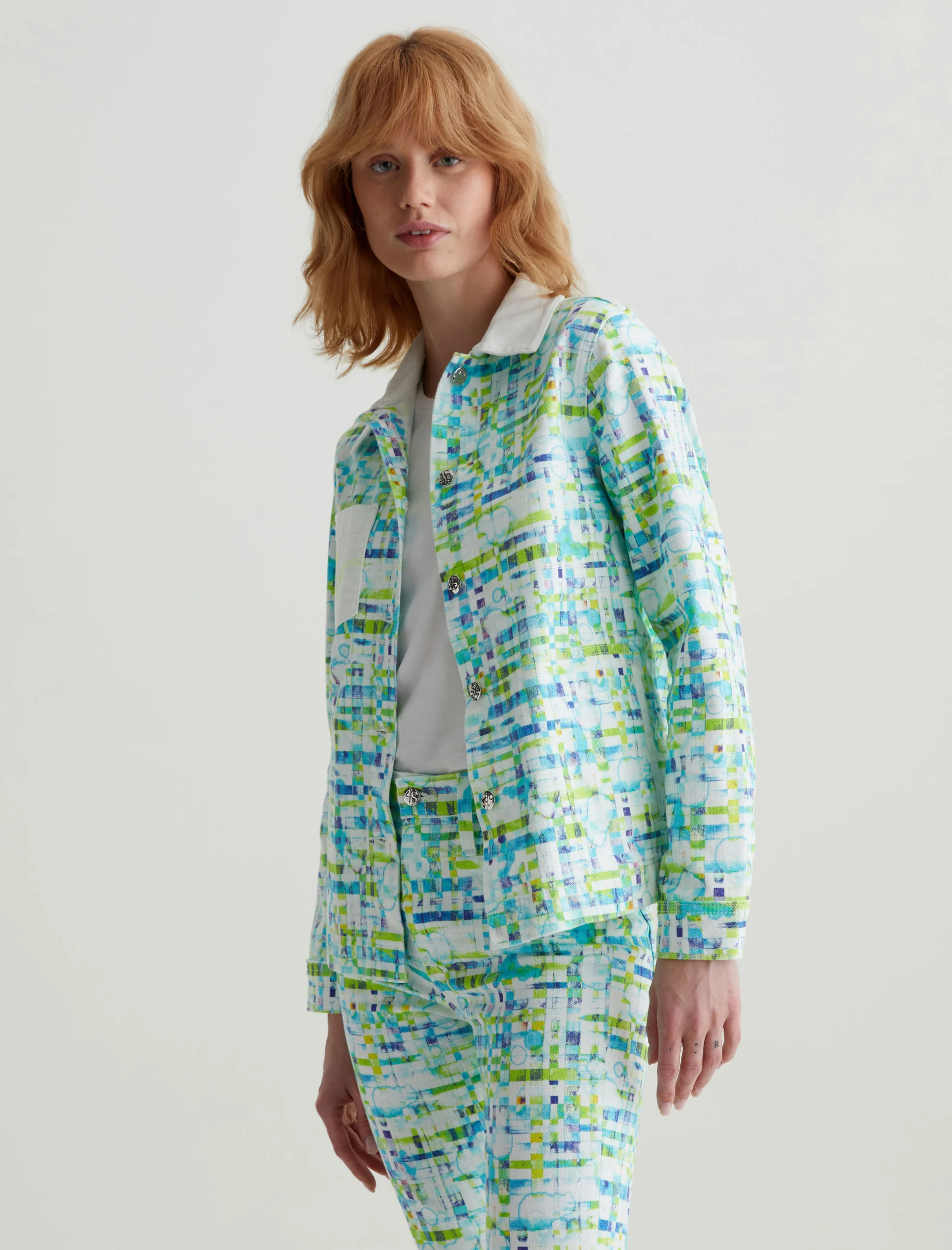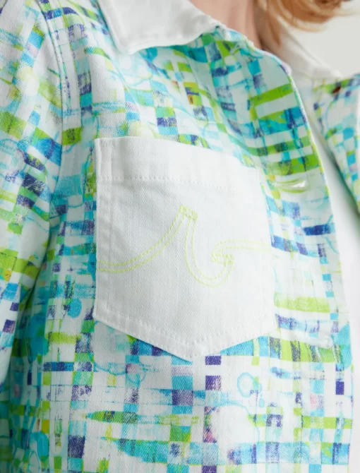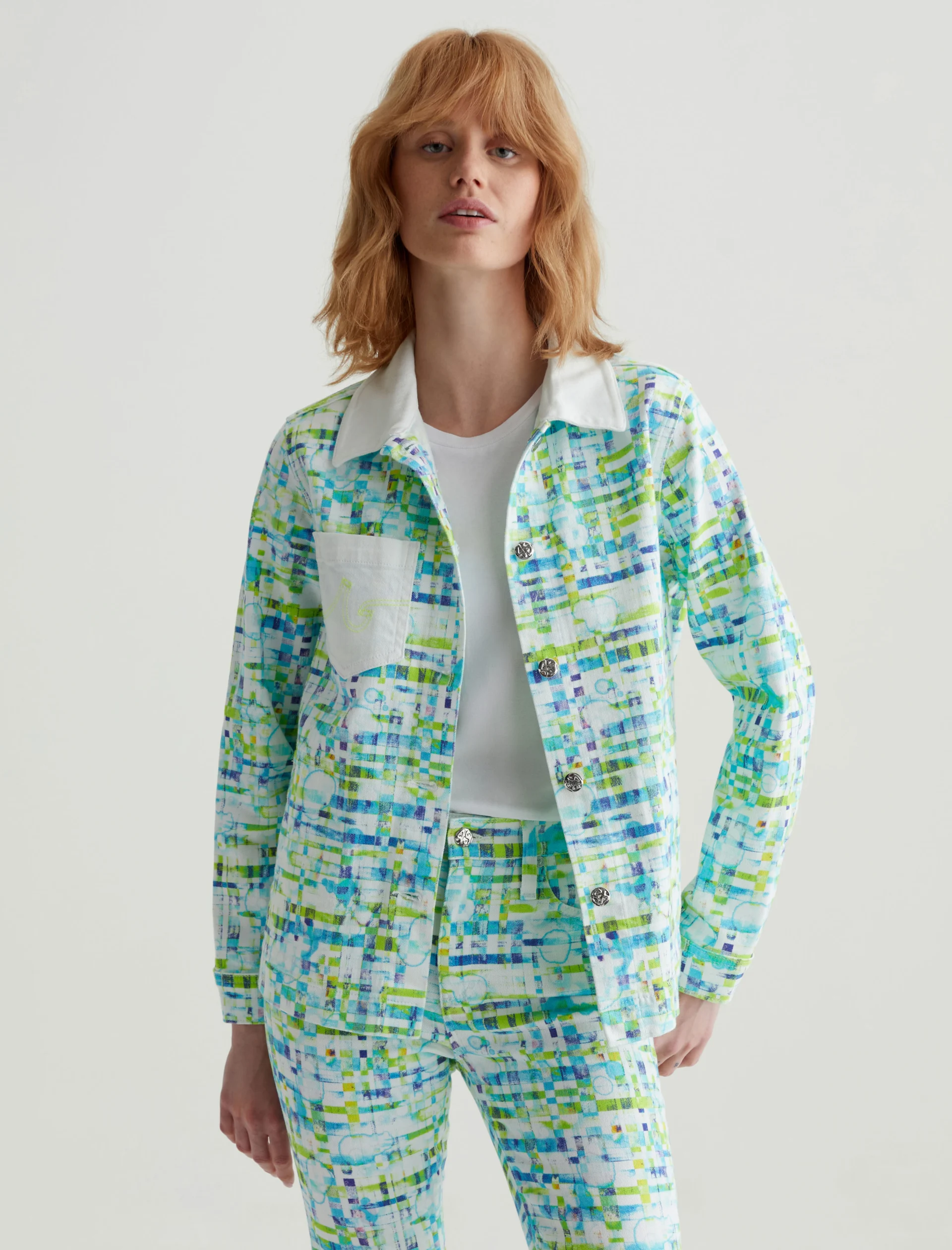 An easy option for brightening your layers, the Chiro Jacket combines the artistry of watercolor with workwear-inspired design elements. This boxy shirt jacket is cut from printed stretch denim and contrasted by a white collar and chest pocket with neon accent stitching. It’s complete with roomy hip pockets and embosse