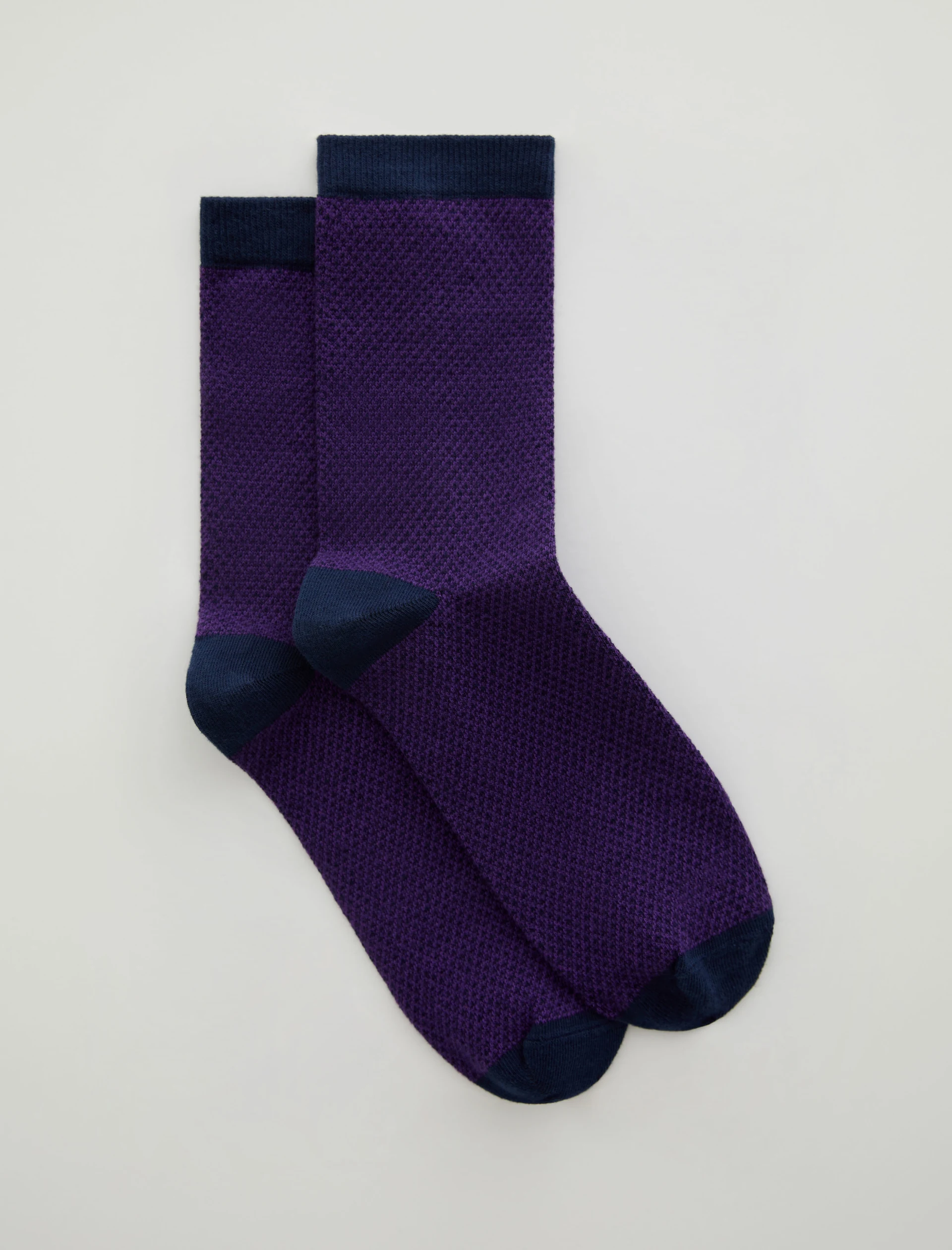 This sock is our classic crew sock. Featuring a check pattern, this pair has been knitted from a comfortable cotton blend and ribbed through the ankles.