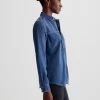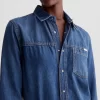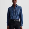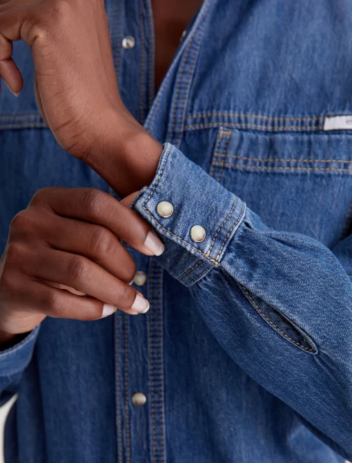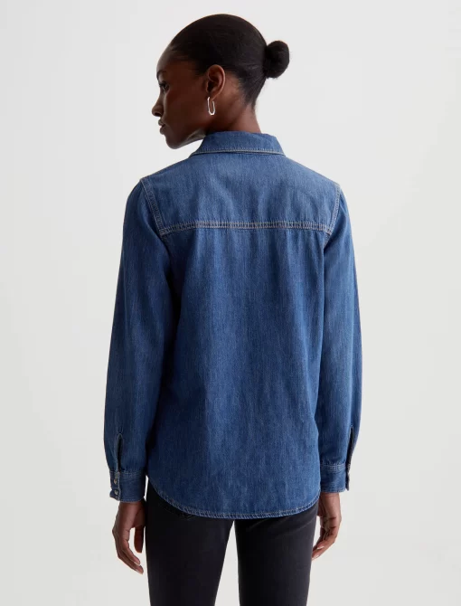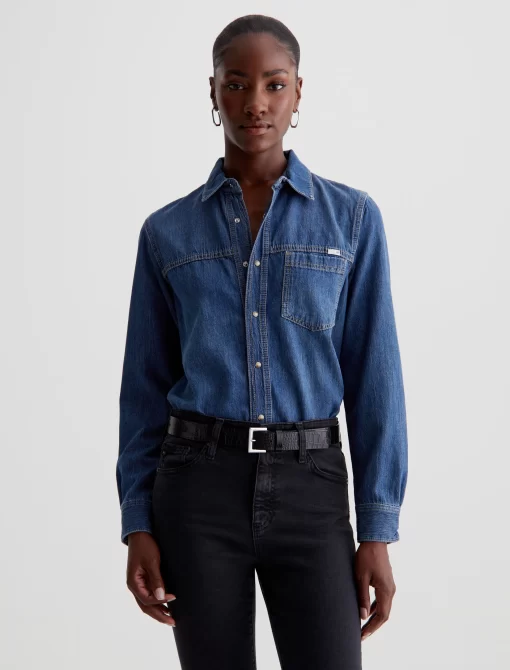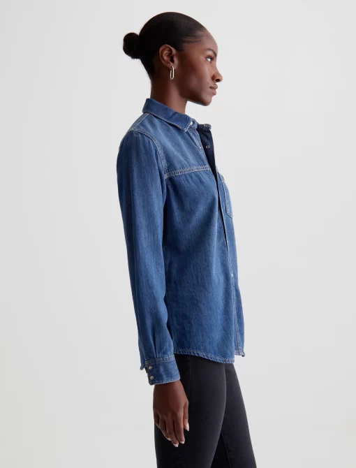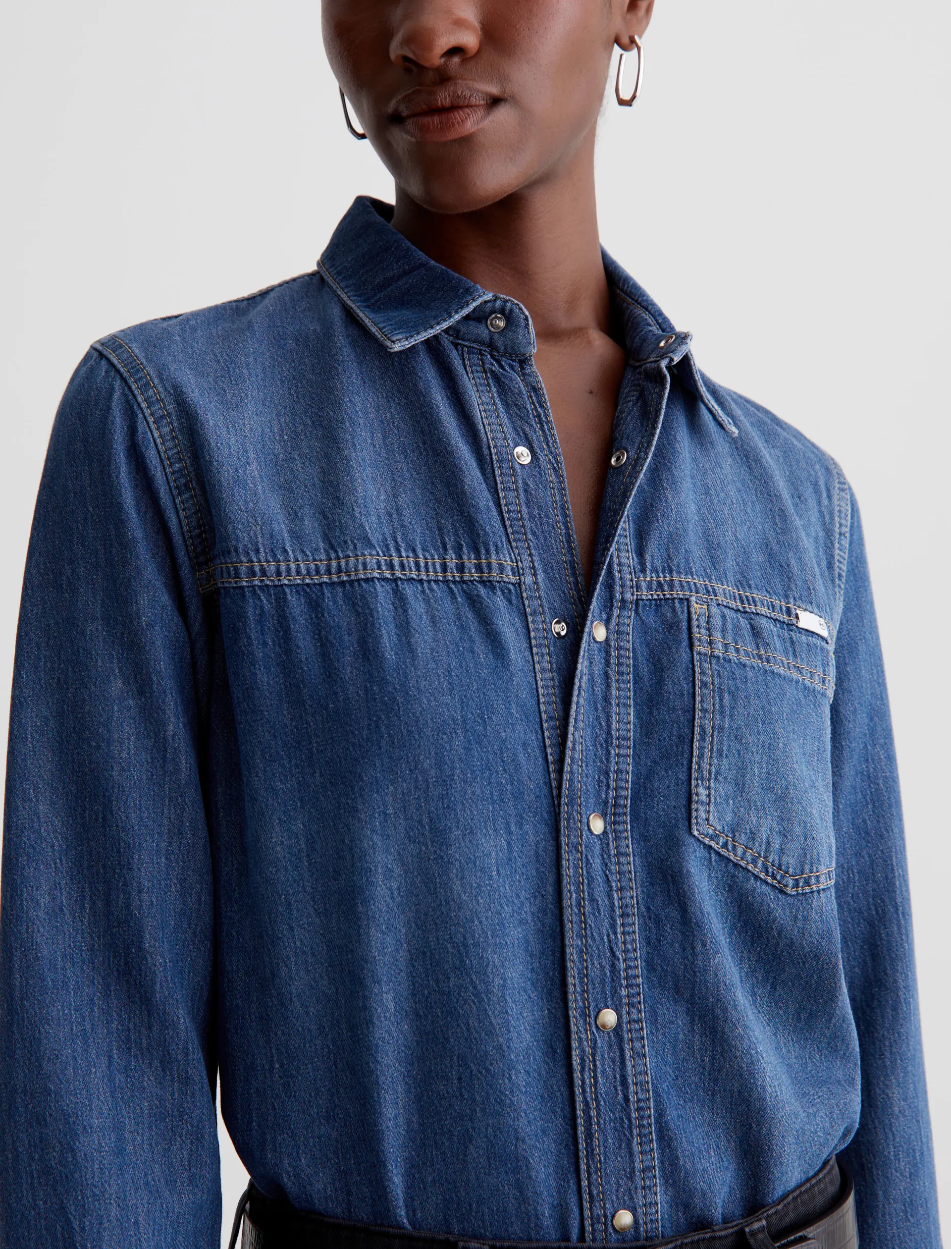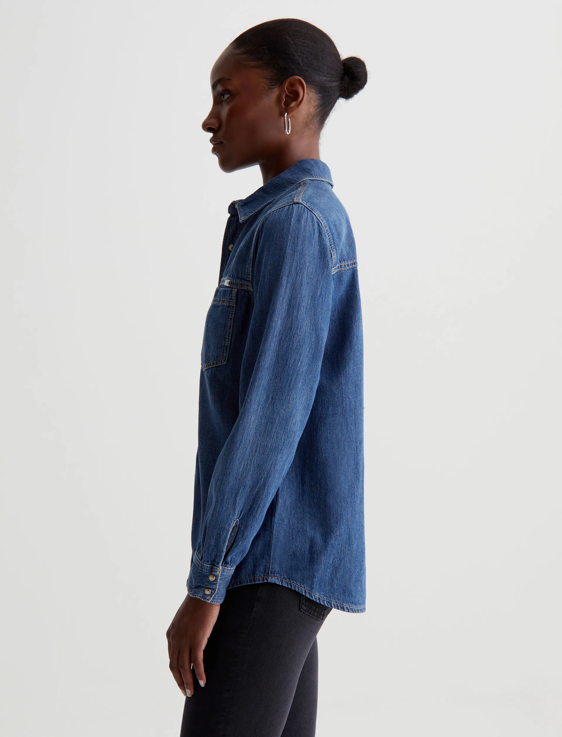 The Dakotah Shirt offers an updated take on the western shirt, designed with a minimalist yoke and a single patch pocket at the chest. This long-sleeve style is made from 7.25 oz. Boundless Lightweight Indigo chambray in a medium wash accented by marigold topstitching. Metal snaps down the front complete the look.