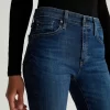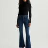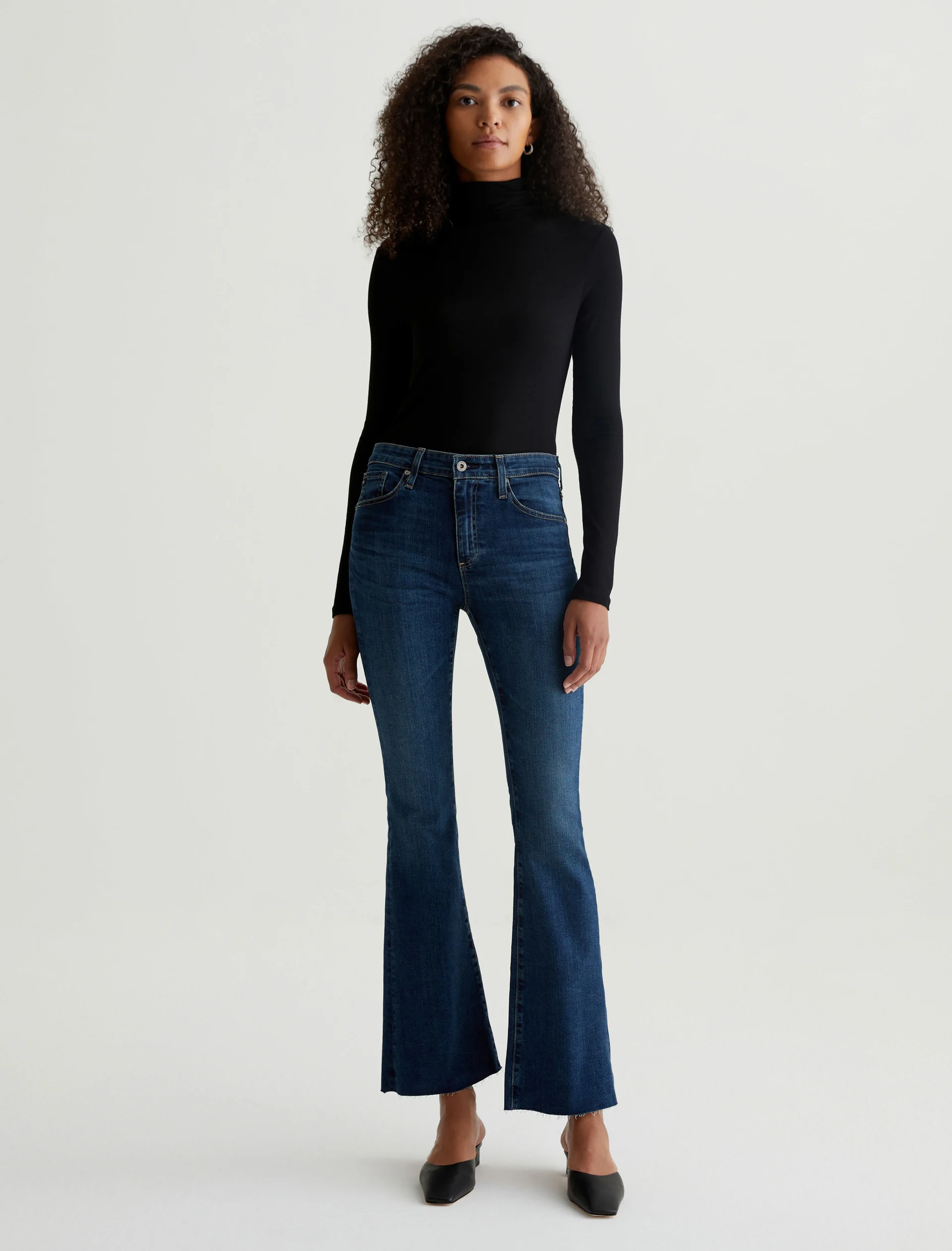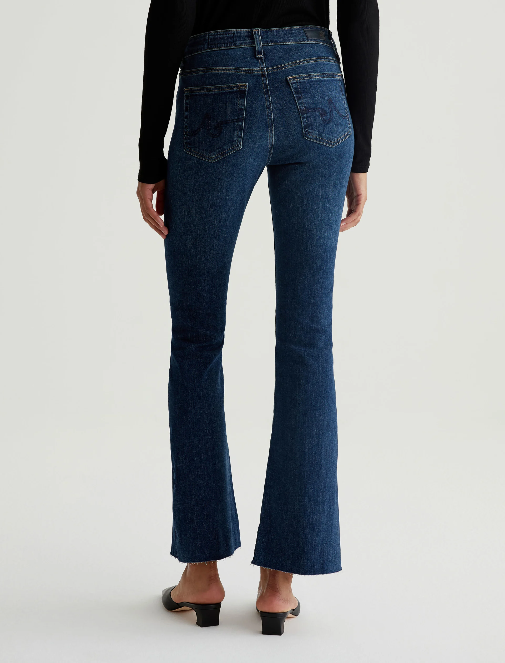 The Farrah Boot is a mid-rise bootcut jean in a dark blue wash with fading and whiskering. The pair sits right at the natural waist and has a skinny fit through the leg before opening into a subtly flared raw hem. This women’s bootcut jean is designed in 10 oz. Rouge Advance Stretch Denim for a flattering, comfortable