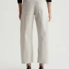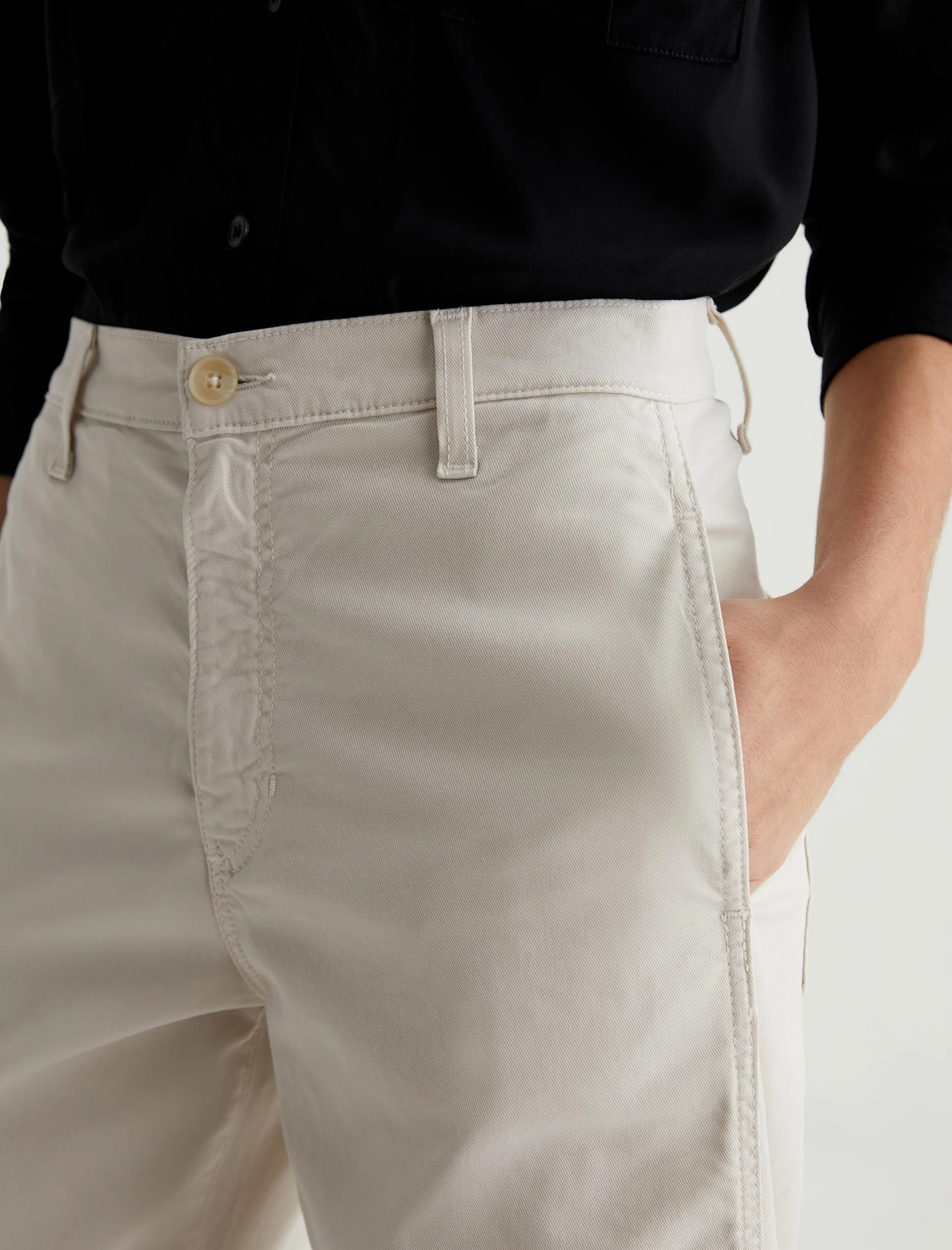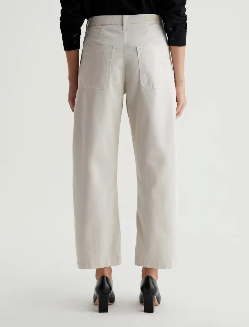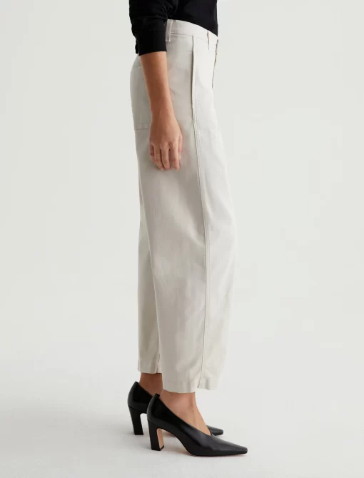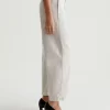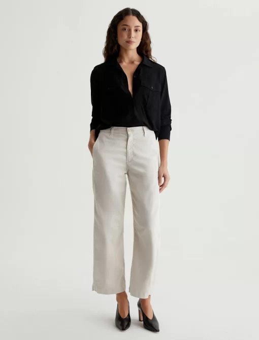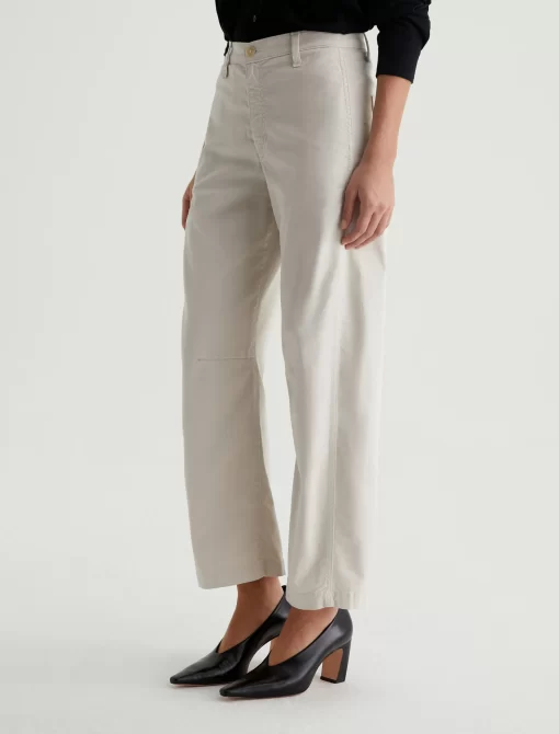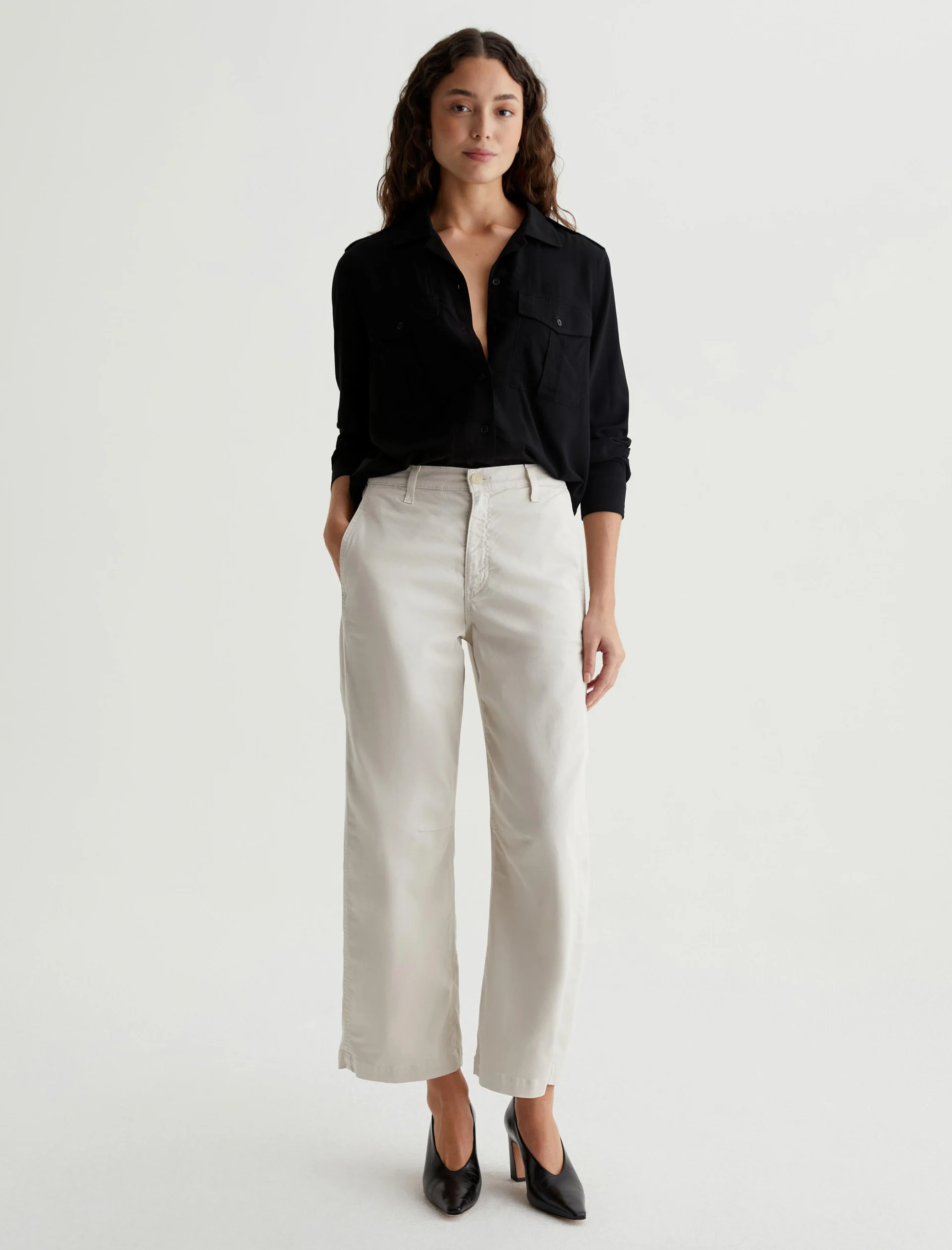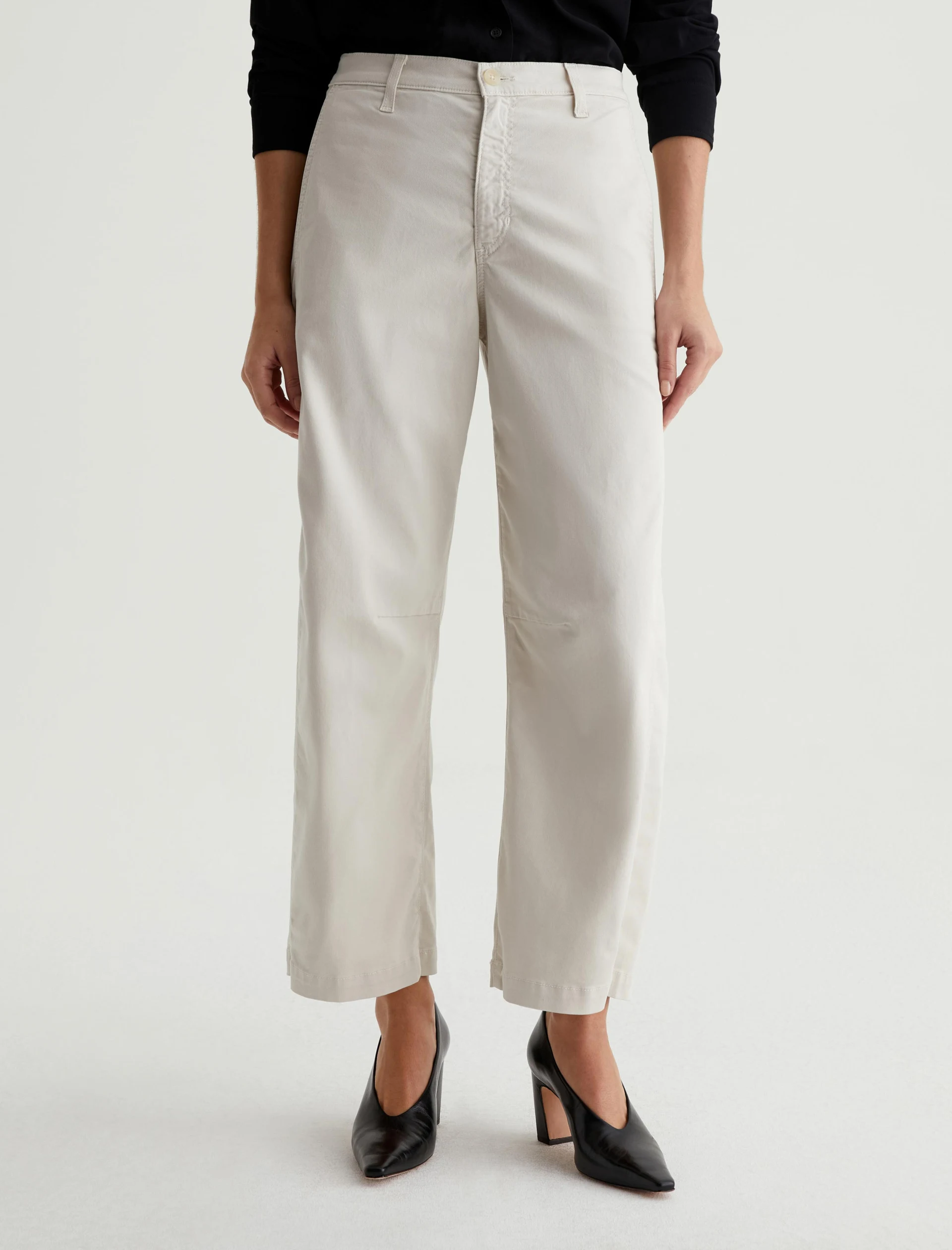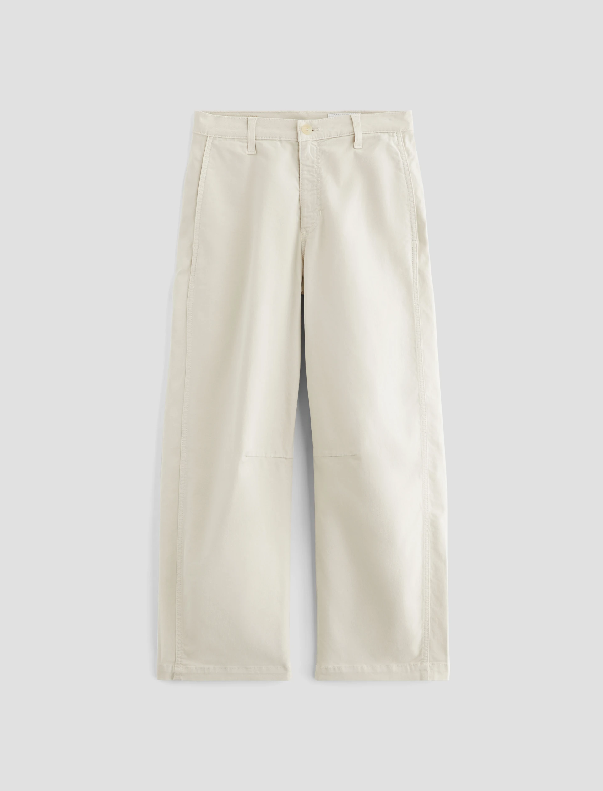 Fiona is a barrel-leg chino with a high waist and slant front pockets. Landing at an ankle-skimming length, it’s got slightly curved outer seams and darting at the inner knees. Done in an off-white shade, these barrel-leg trousers have a soft, supple feel in 7.9 oz. Sorrento Stretch Twill from Italy.
