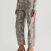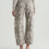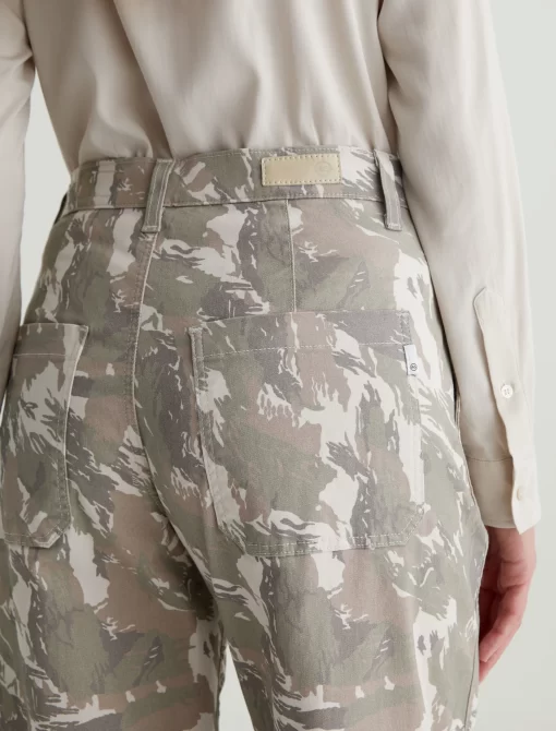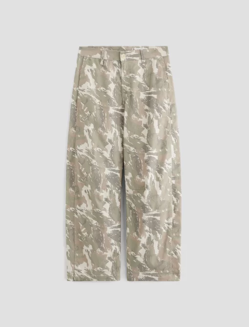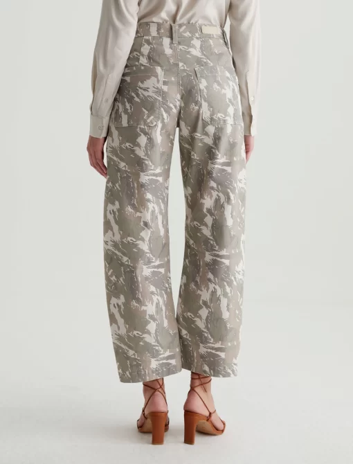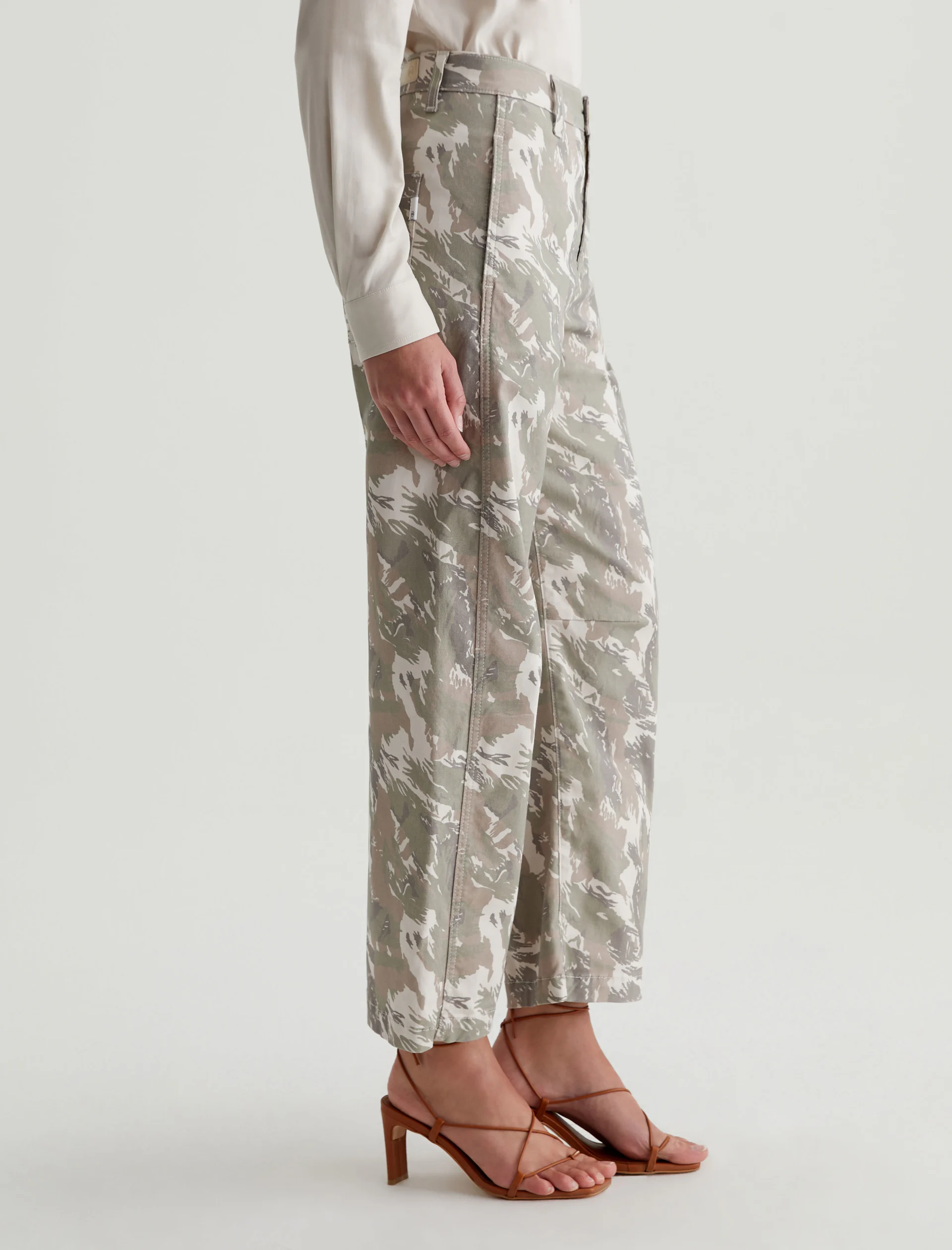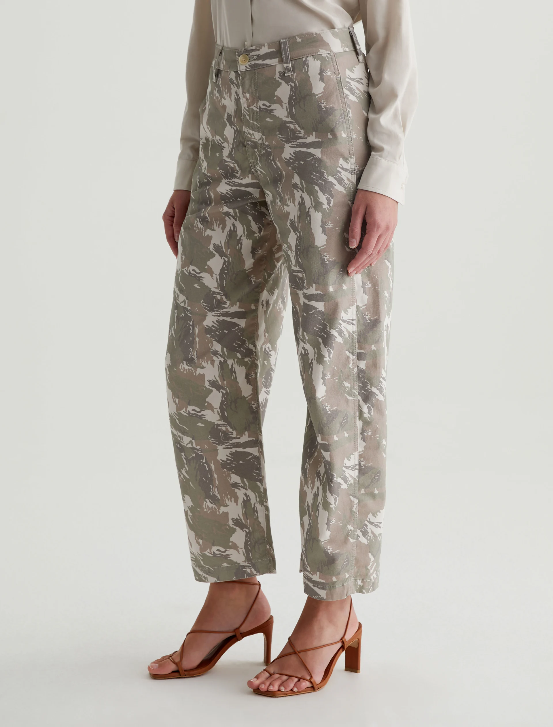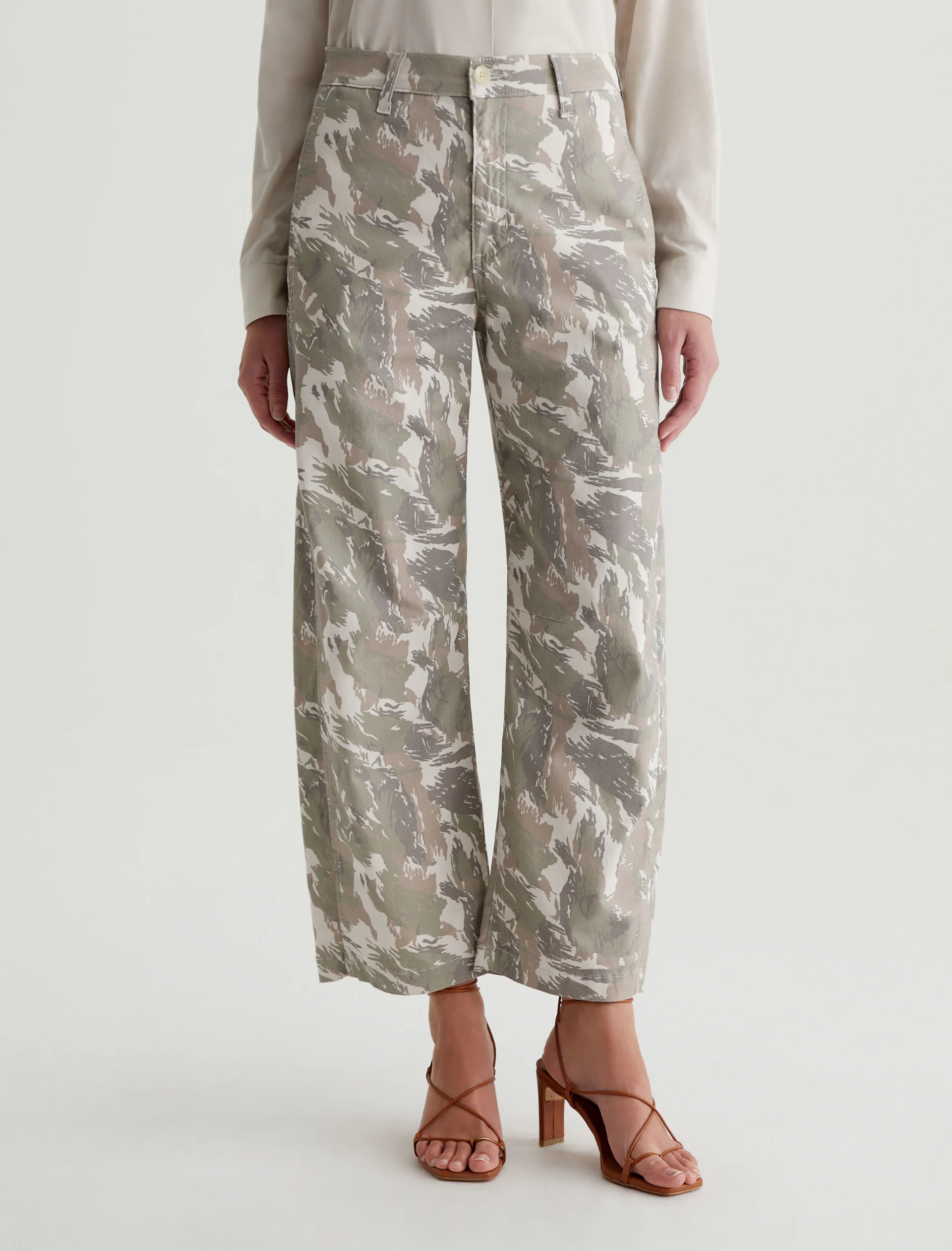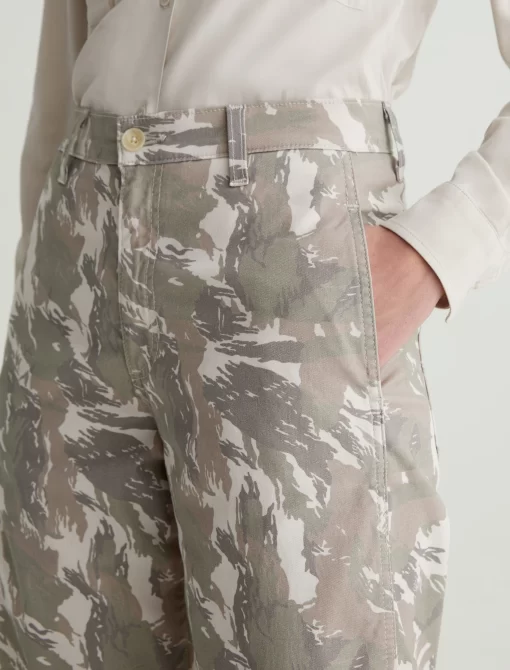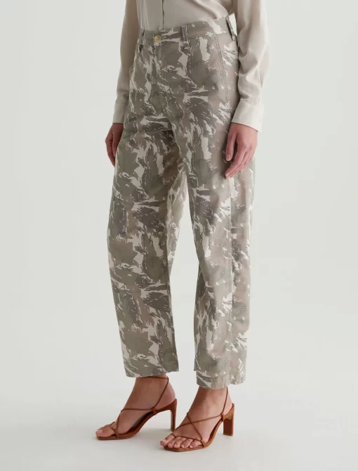 Fiona is a barrel-leg chino with a high waist and slant front pockets. Landing at an ankle-skimming length, it’s got slightly curved outer seams and darting at the inner knees. Featuring a camo print of neutral shades, these barrel-leg trousers have a soft, supple feel in 7.9 oz. Sorrento Stretch Twill from Italy.