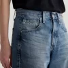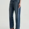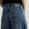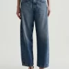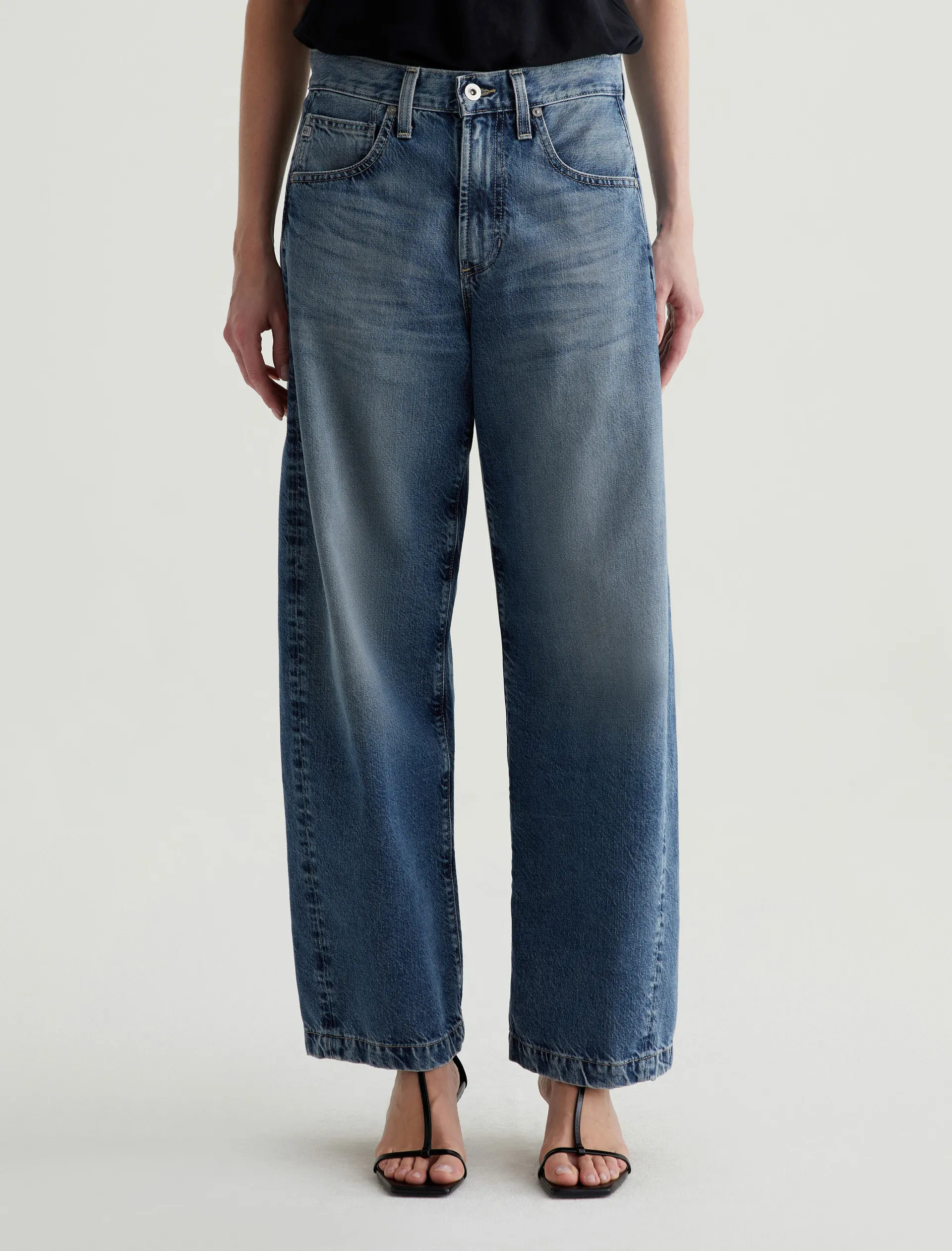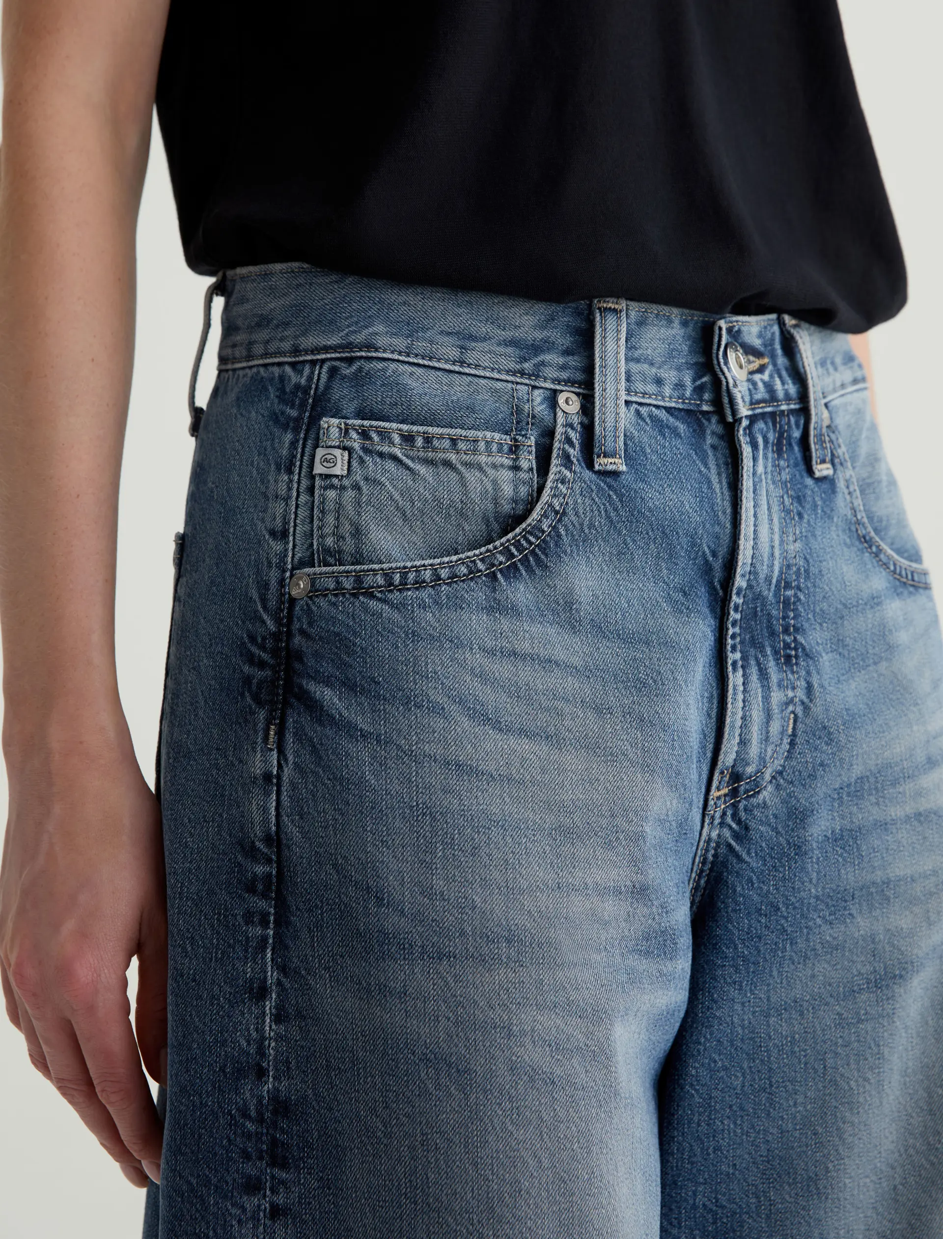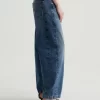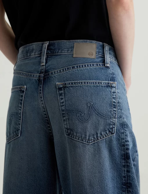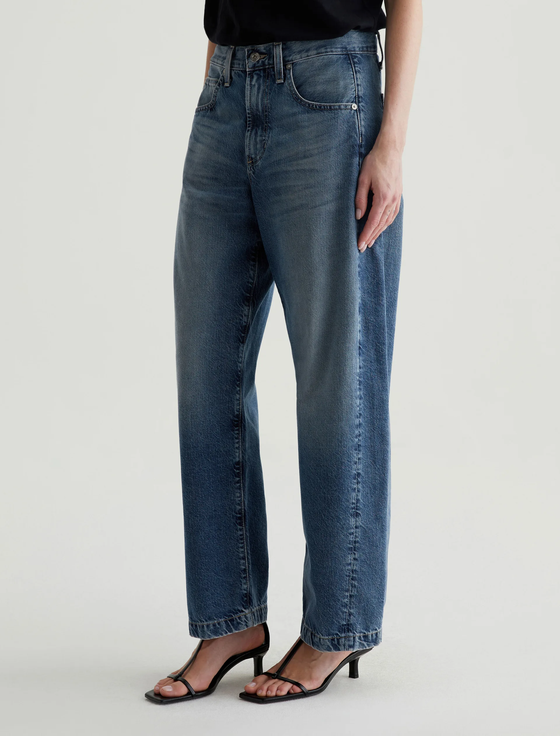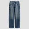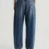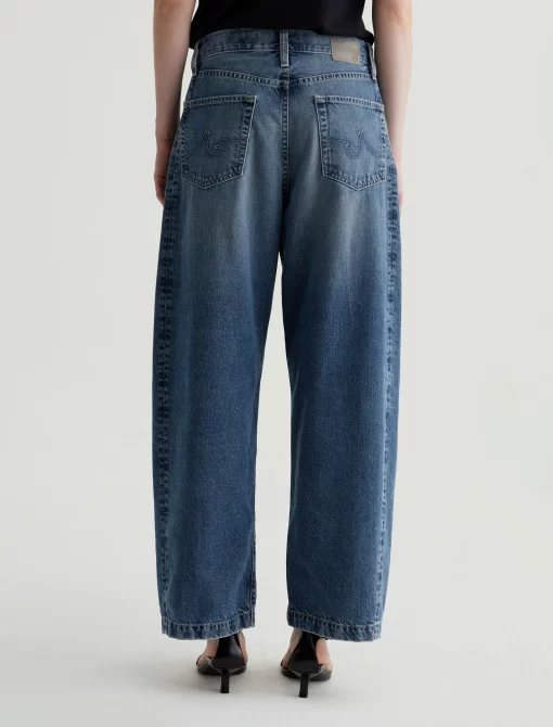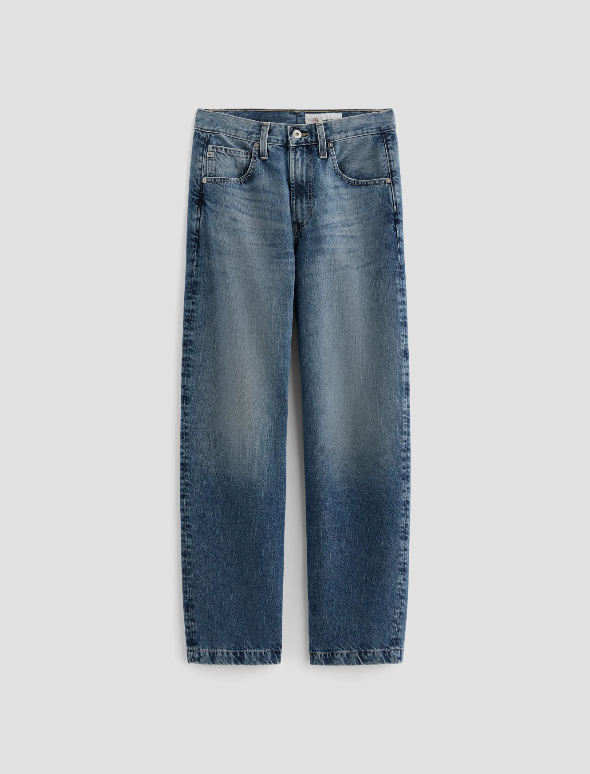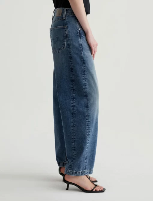 Our new Hattie barrel-fit jeans feature an ultra-high rise and a curved shape at the legs. Accented by forward side-seam paneling, the style is designed to land at the ankle. Done in a faded medium-blue wash, this pair is made from 11.75 oz. Legion Denim, a rigid cotton denim from Japan.