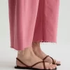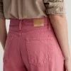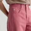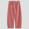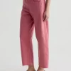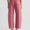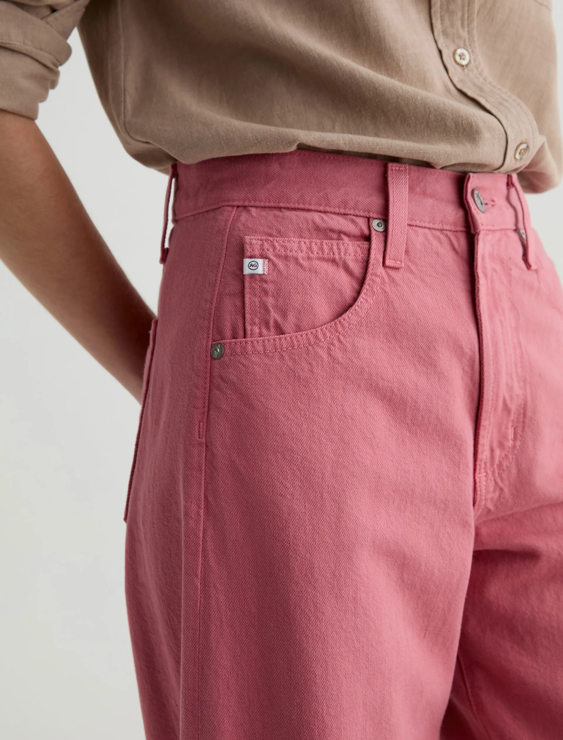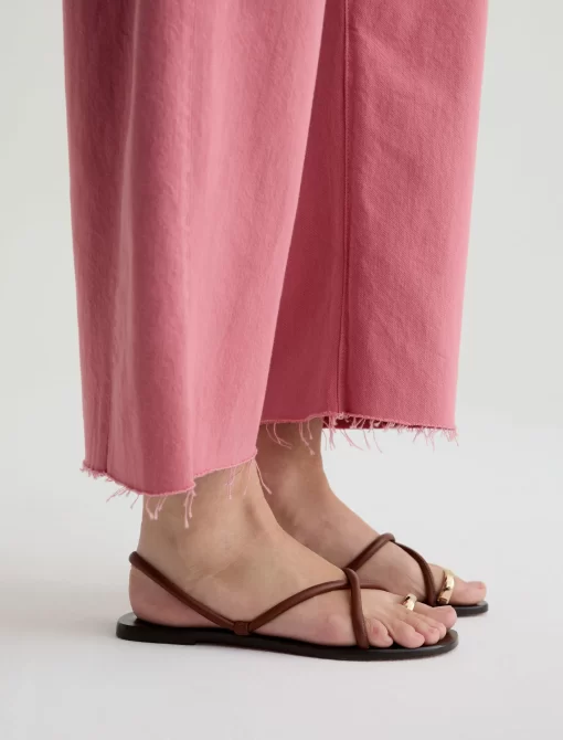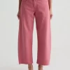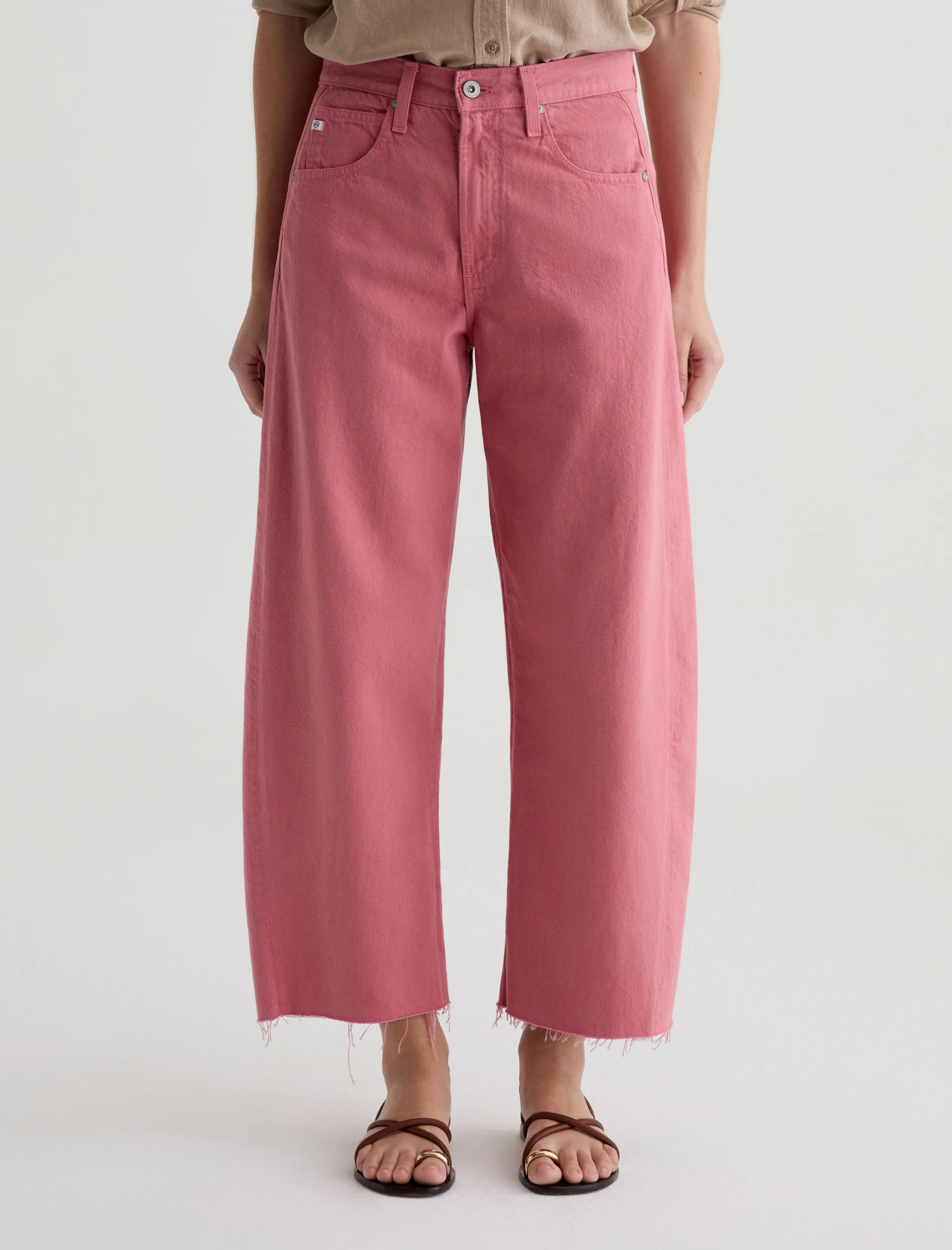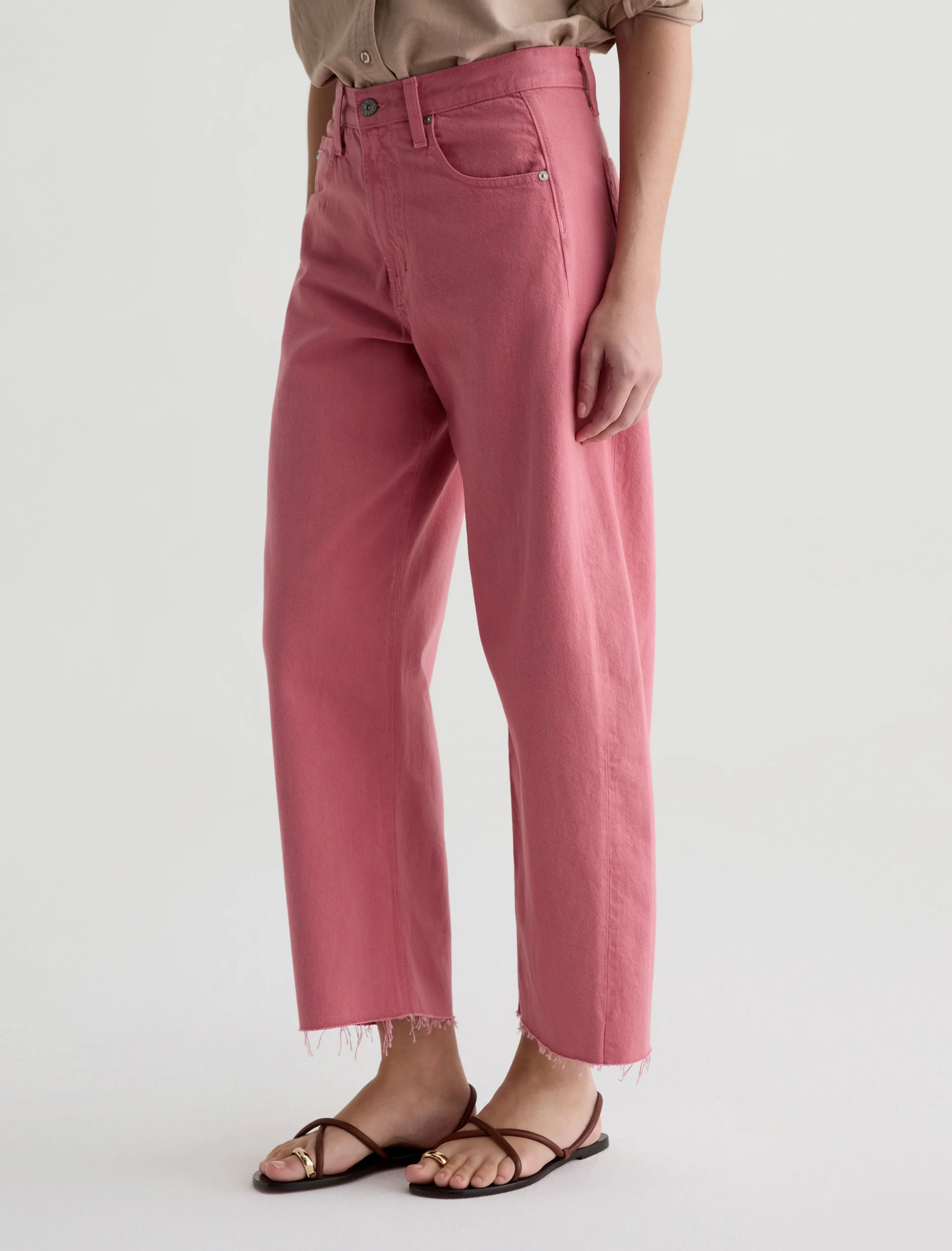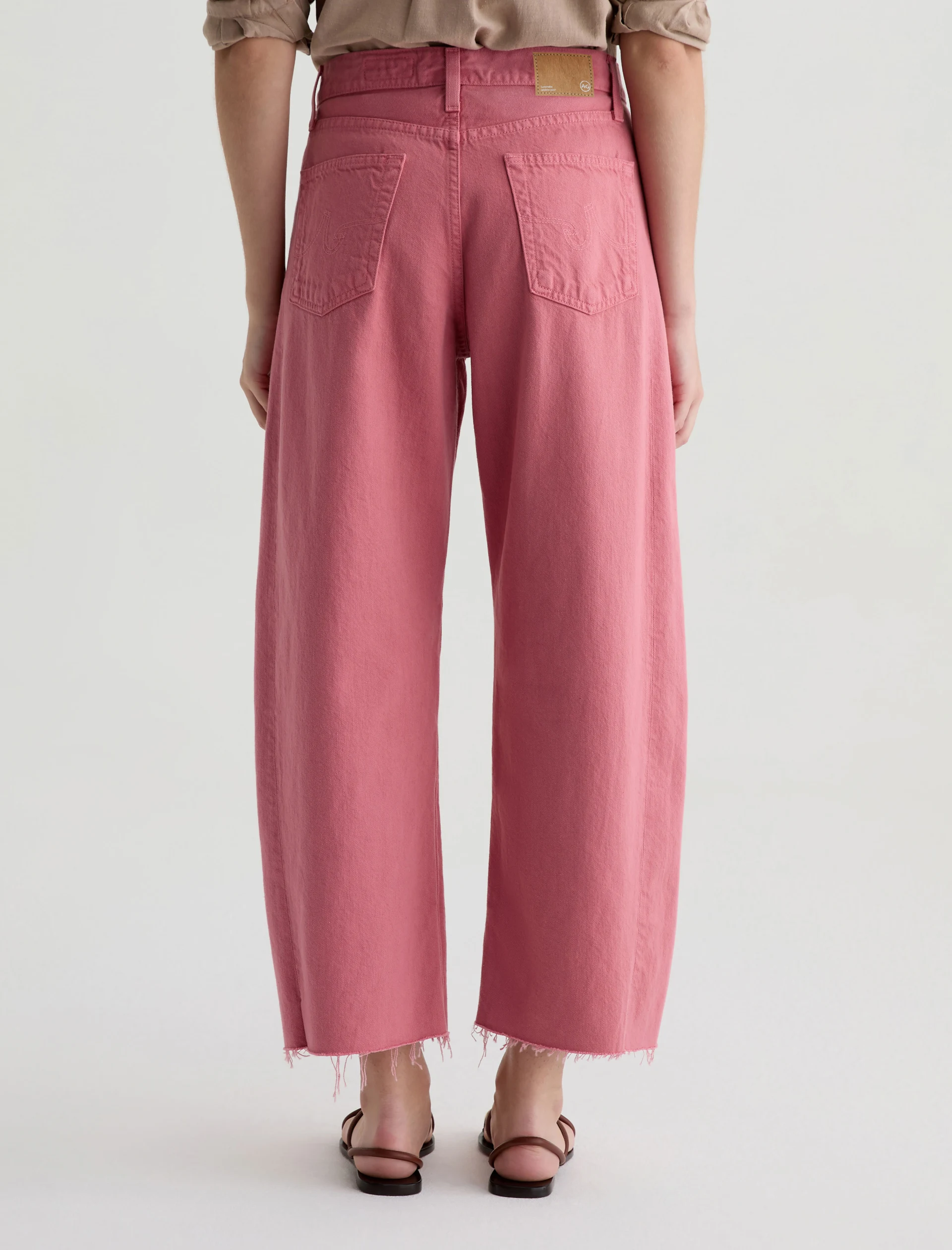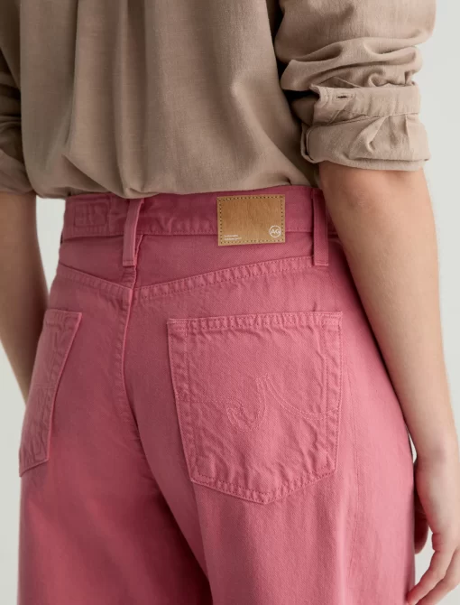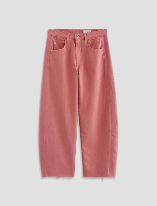 Our Hattie Crop in Peony is a high-rise barrel jean made from soft, pure non-stretch denim. It features a light wash and raw hems, offering a relaxed, broken-in feel with a modern, sculpted silhouette.