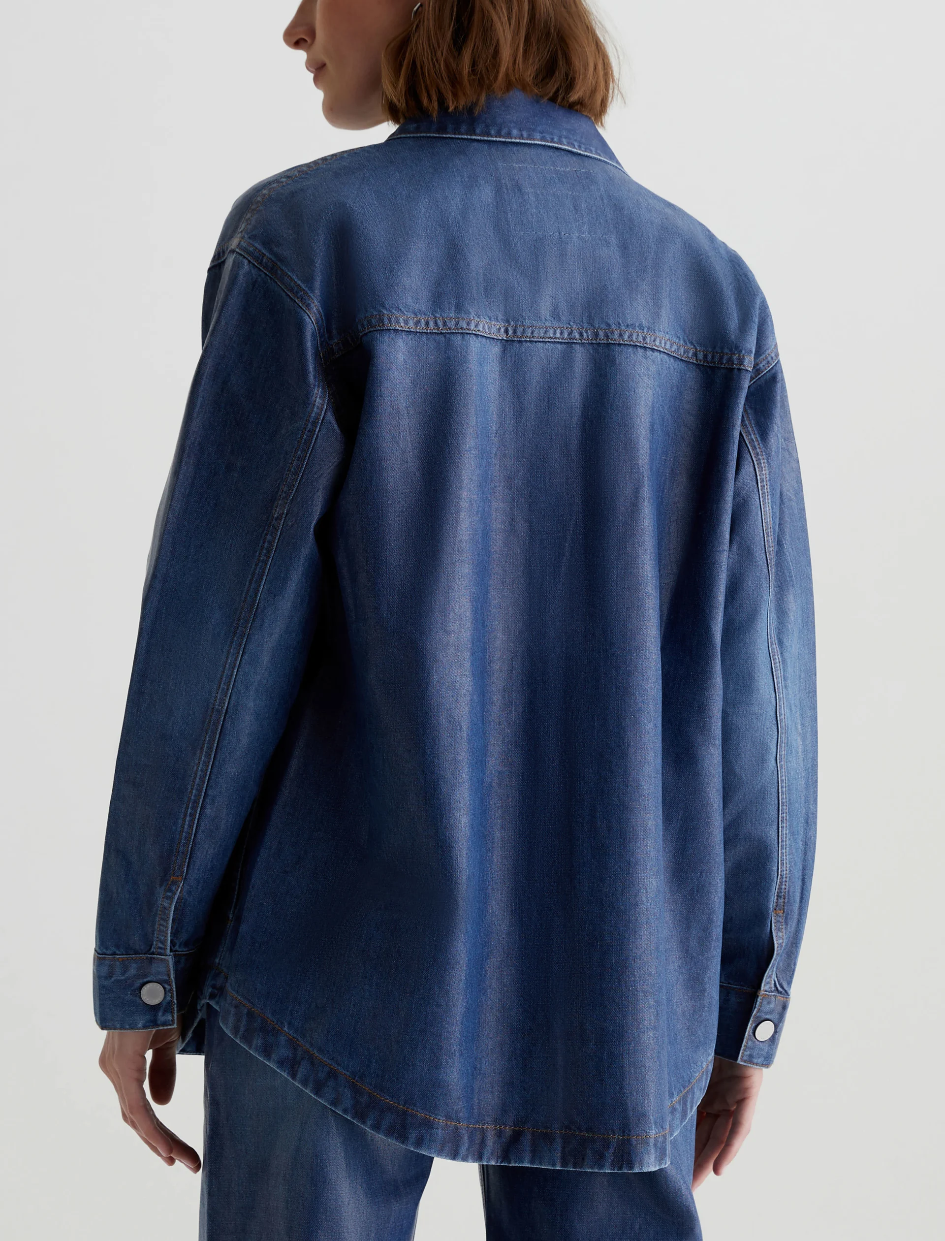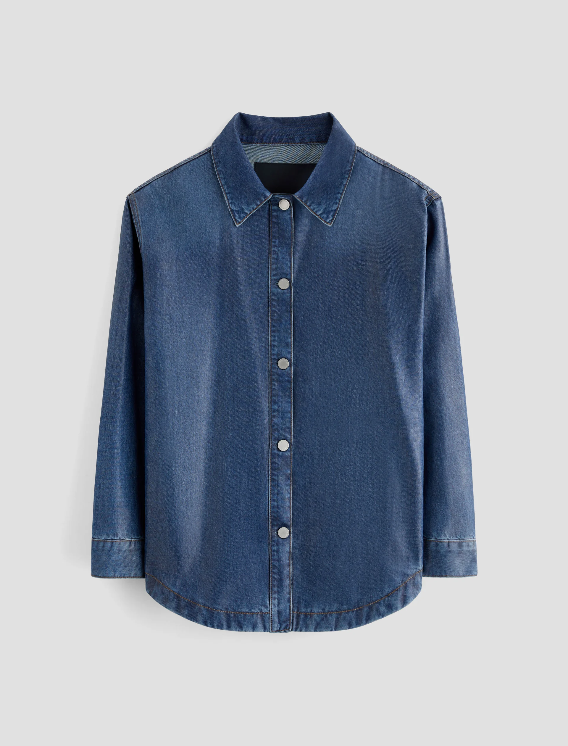 Glazed denim makes the Kea Jacket a statement piece. Part shirt, part jacket—it’s an easy, oversized shirt jacket in our Liquid Lyocell Denim. The soft cotton blend is washed to a faded blue shade and glossed with a clear coating for a shiny water-repellent finish.