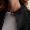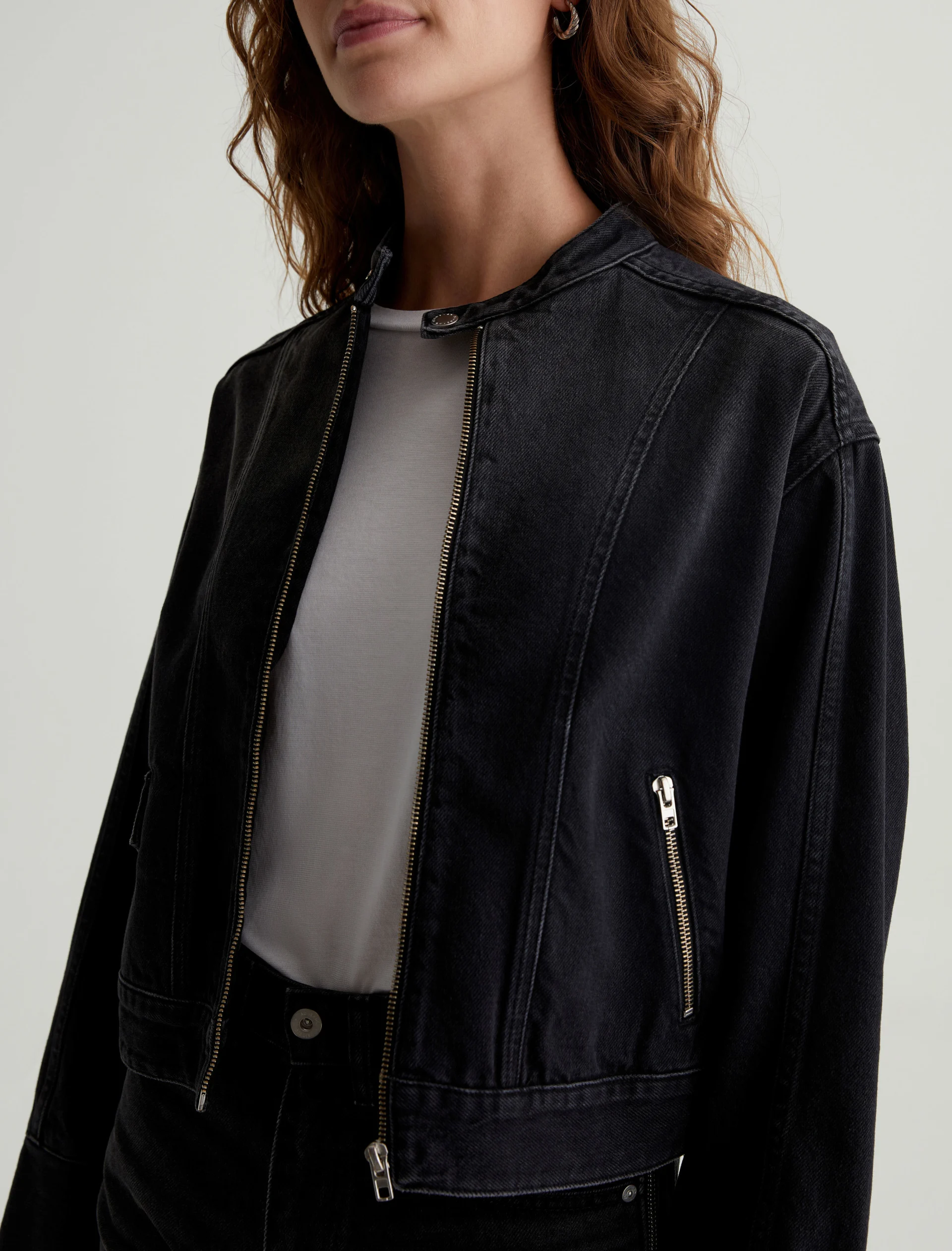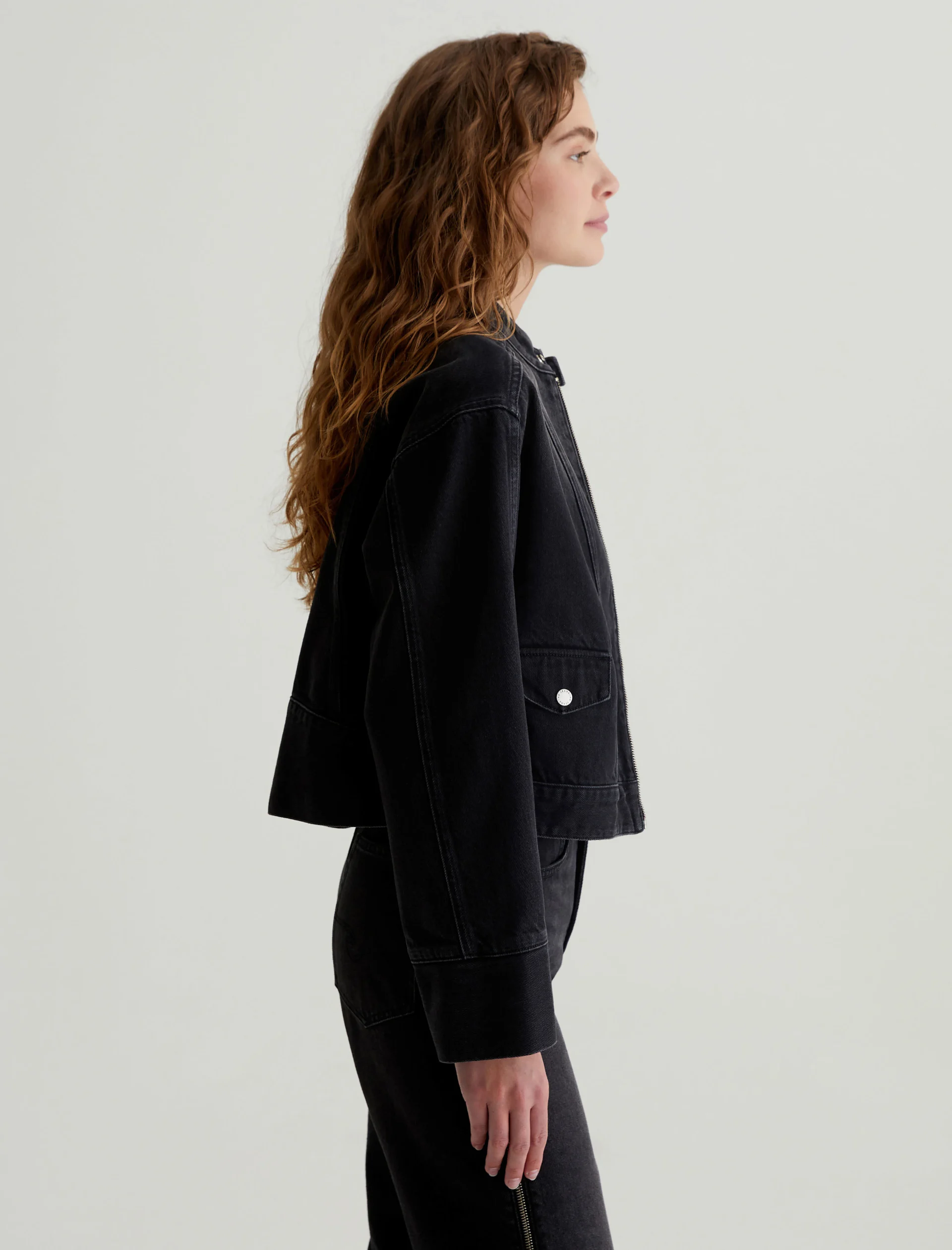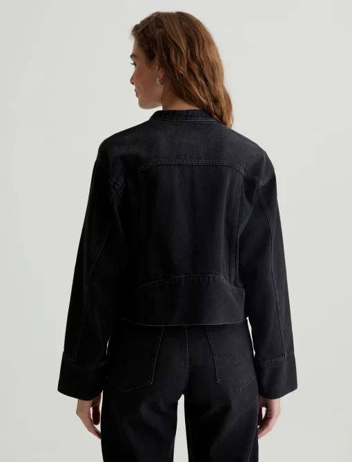 The Laney moto jacket features a boxy fit with paneled styling, wide sleeves, and racer-inspired details. Note the collarless neckline that snaps into place, plus the exposed center zip, an angled zipper pocket, and pocket flap with hidden welt. It’s designed in 11.25 Organic Black Rigid Denim, a non-stretch Italian fa