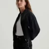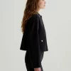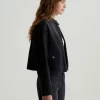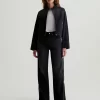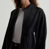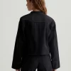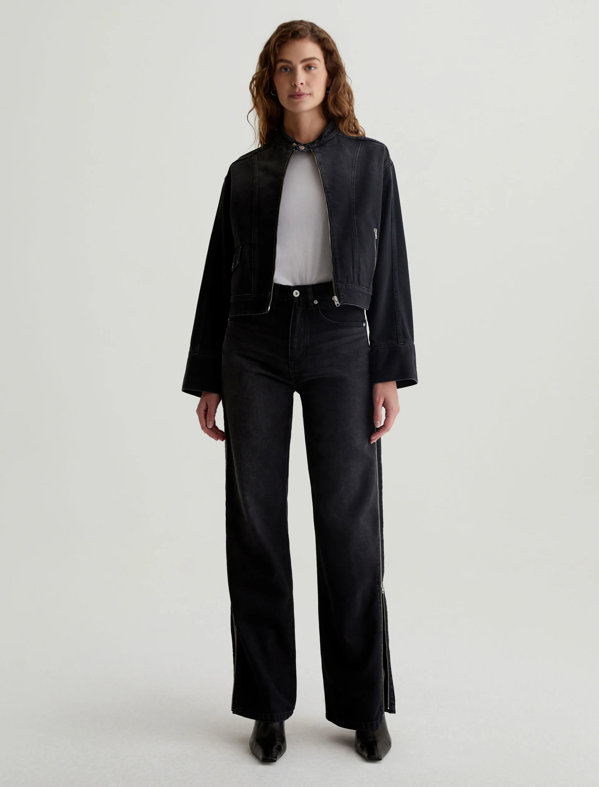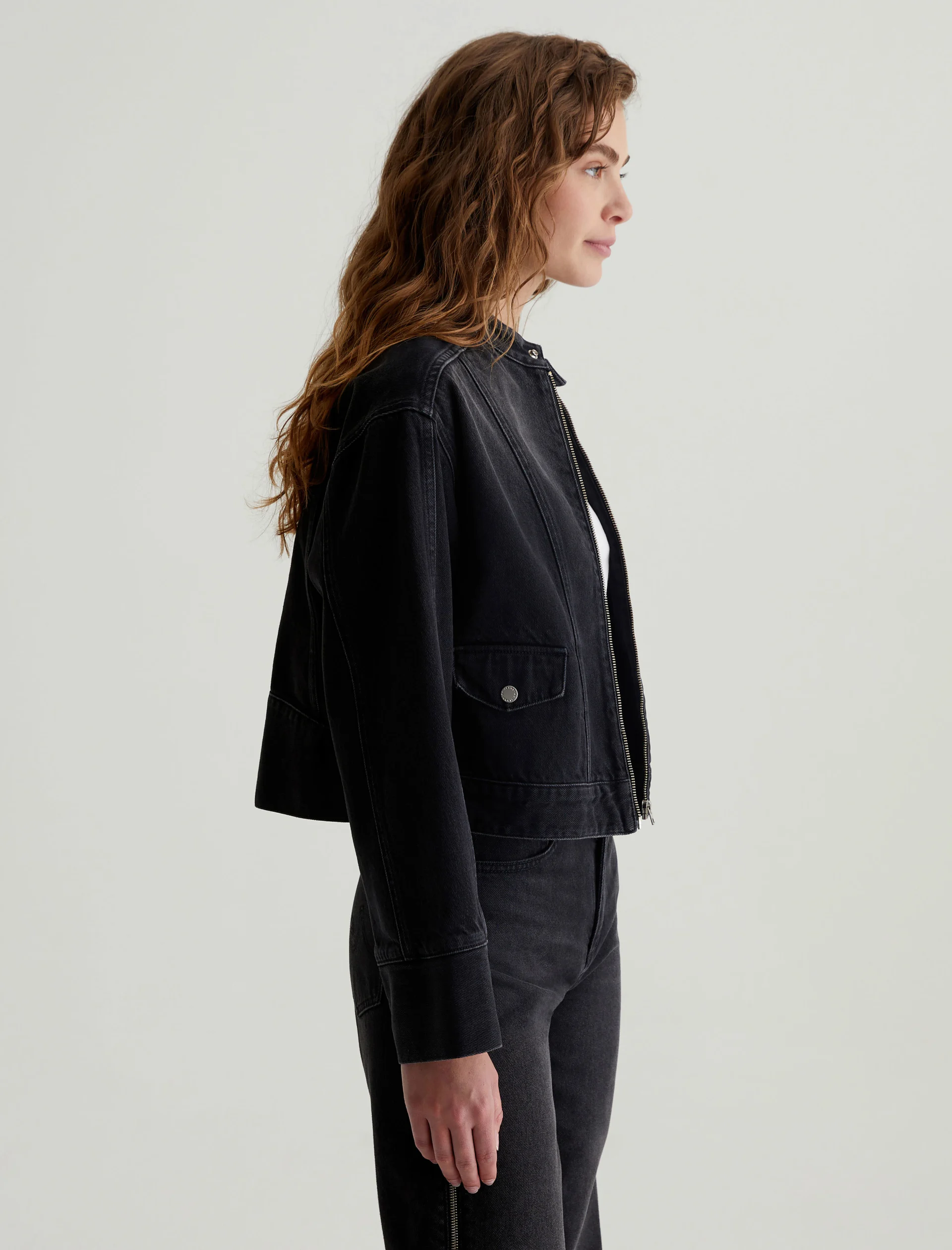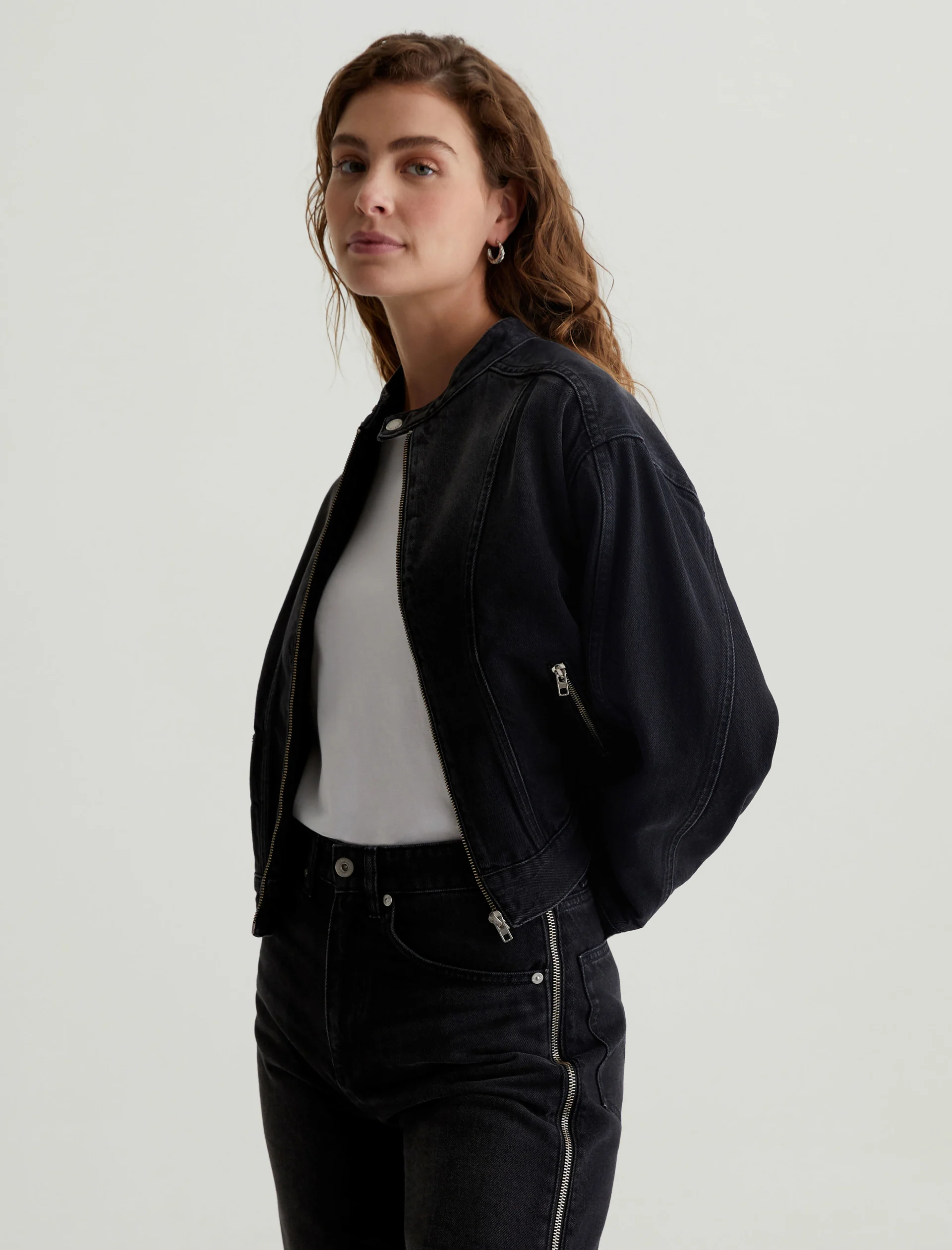 The Laney moto jacket features a boxy fit with paneled styling, wide sleeves, and racer-inspired details. Note the collarless neckline that snaps into place, plus the exposed center zip, an angled zipper pocket, and pocket flap with hidden welt. It’s designed in 11.25 Organic Black Rigid Denim, a non-stretch Italian fa