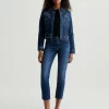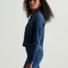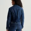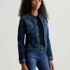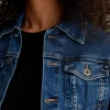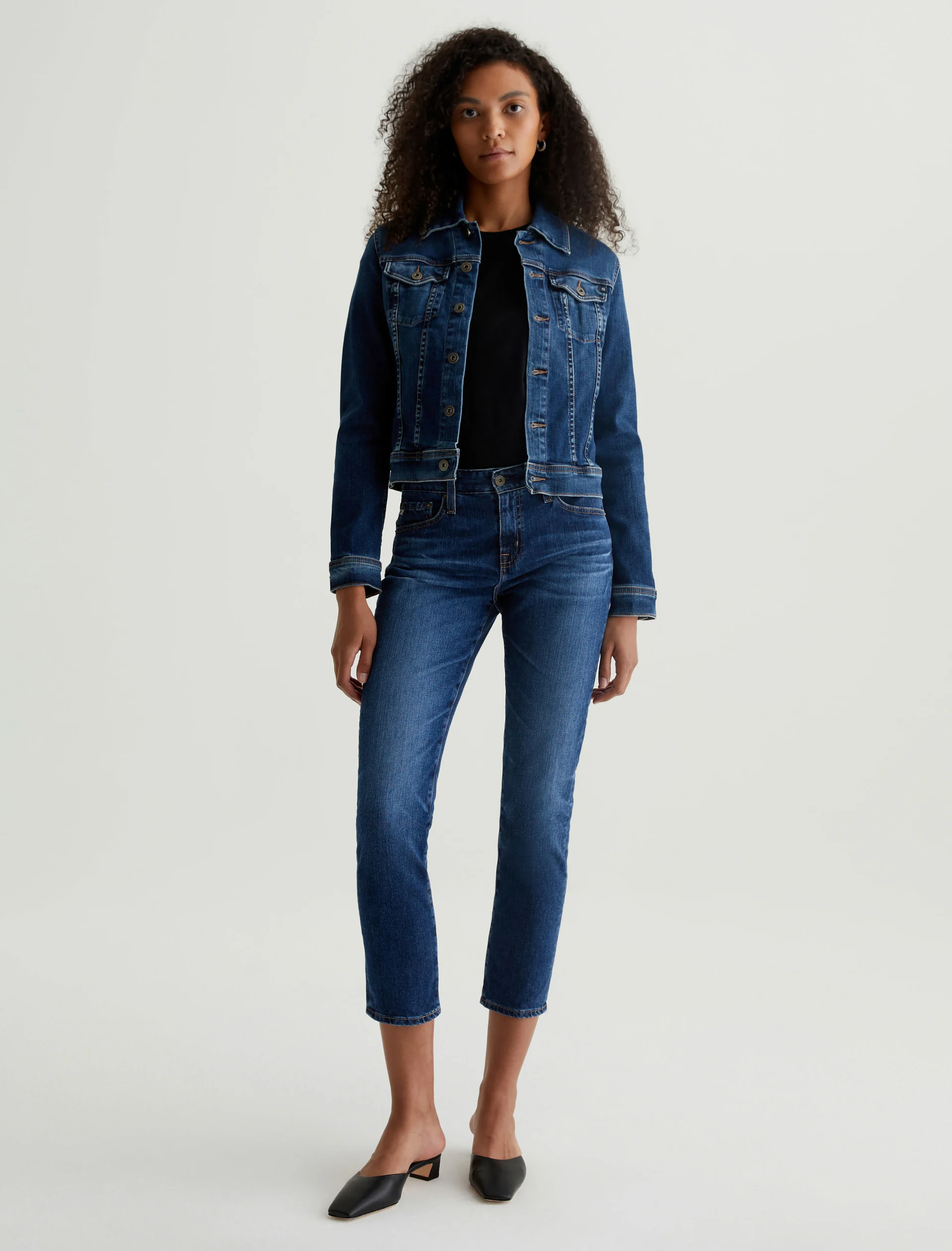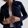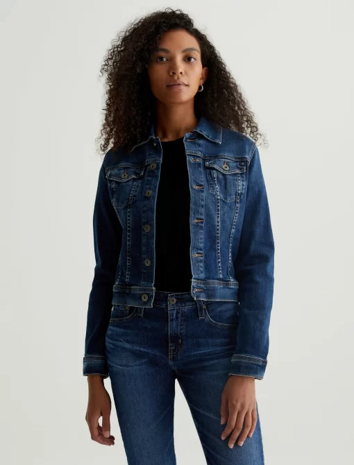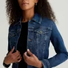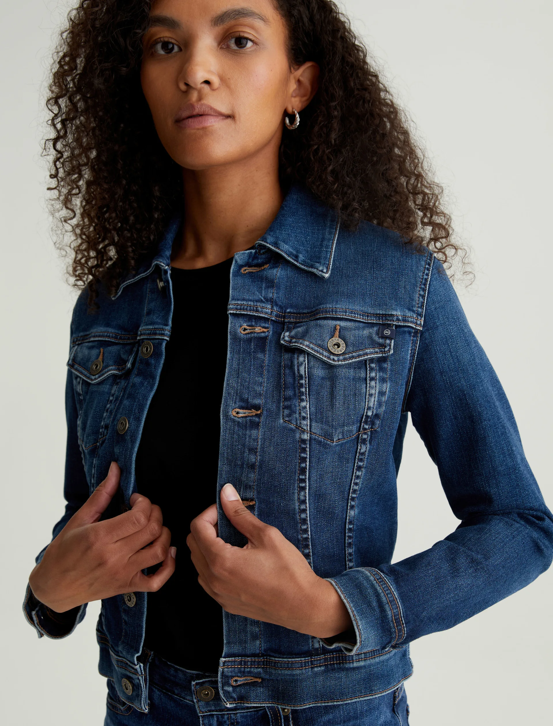 The Robyn Jacket is a slim jean jacket for women featuring a true vintage dark wash with placement shadows, fitted silhouette throughout, and classic chest pockets with tonal button closures. This women’s jacket is designed in a body-hugging 10 oz. Rouge Advanced Stretch Denim—a lightweight, super stretch fabric that l