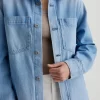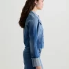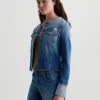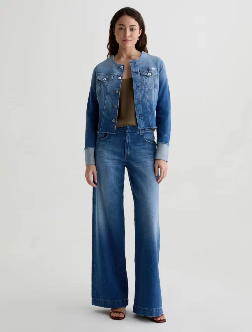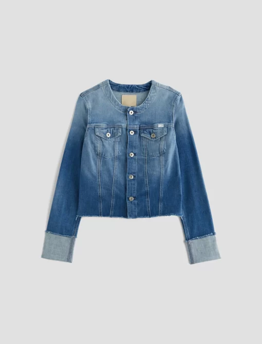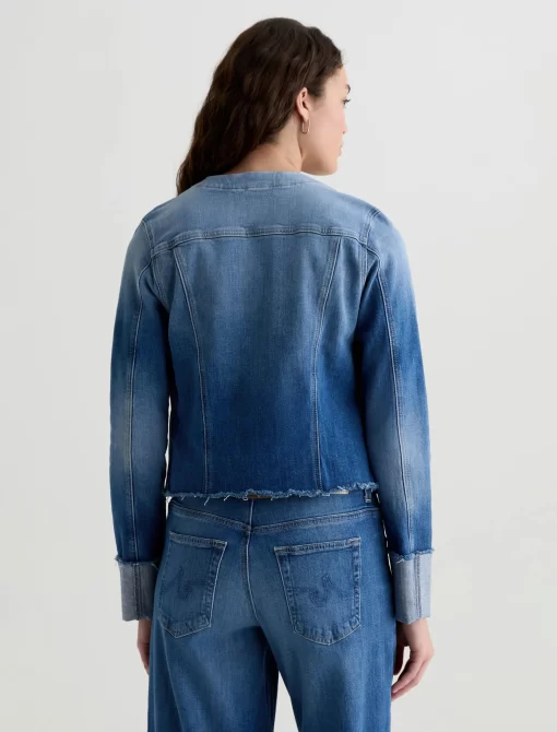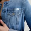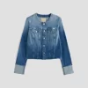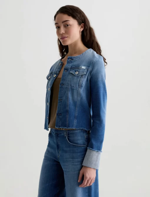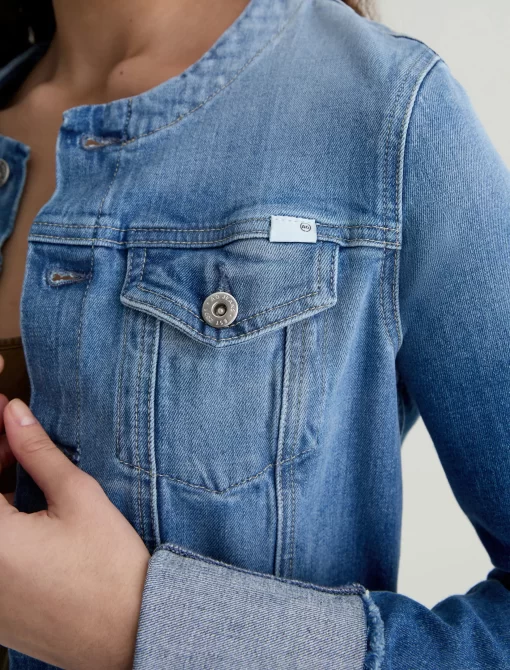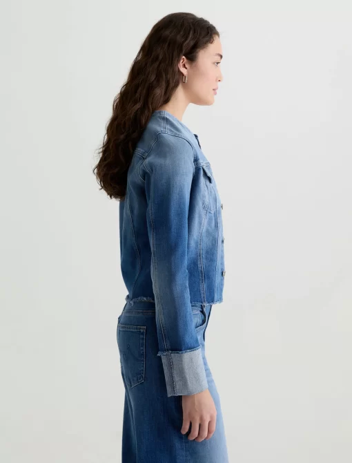 This fresh take on our famous Robyn jacket features a collarless neck line with a raw edge detail. Crafted from 11 oz. Journey Denim in a medium wash. Featuring a comfort stretch feel, it’s finished with raw hems, cuffed detailing, and two front button-flap pockets to make an evelated statement.
