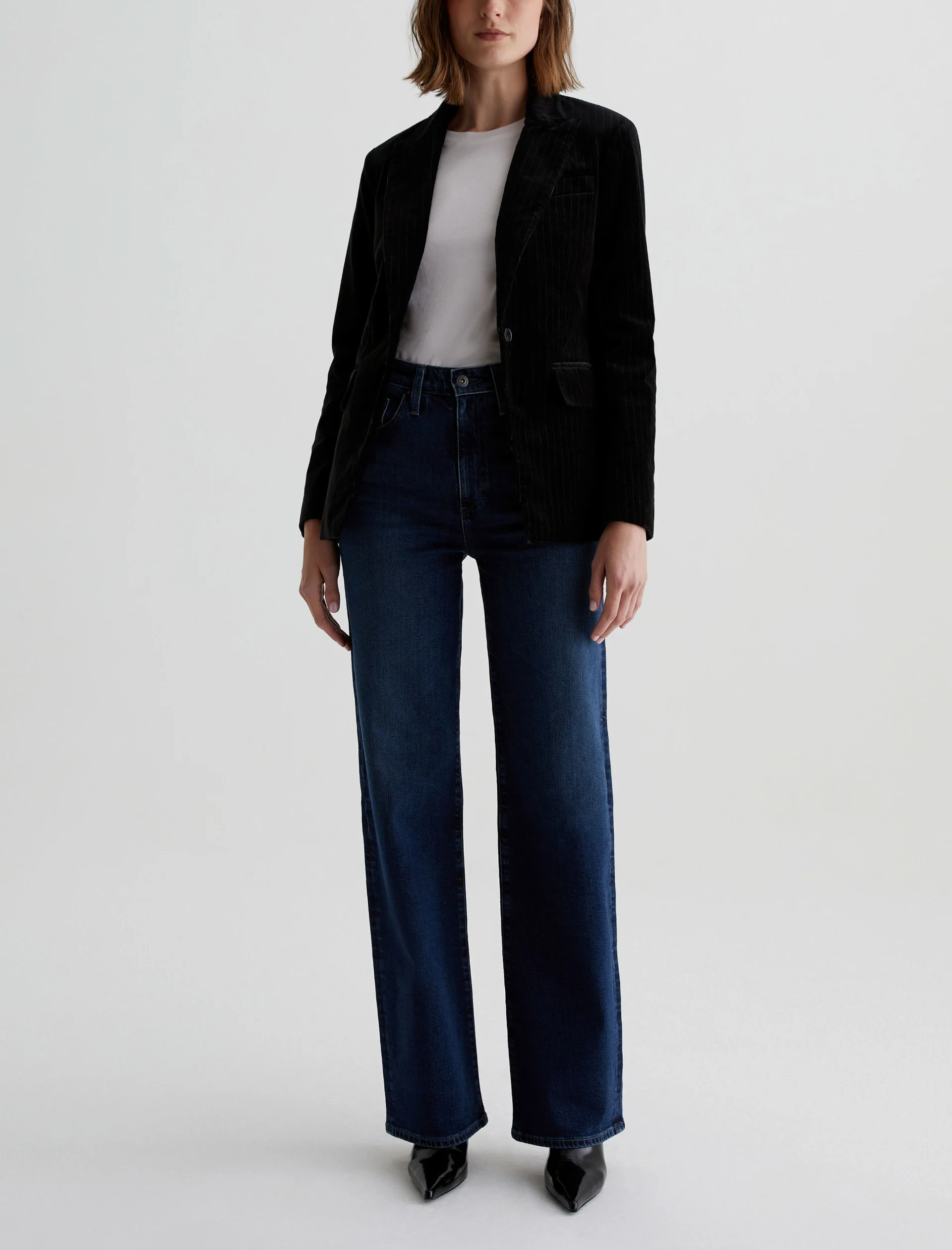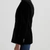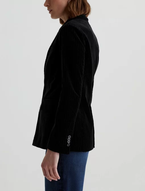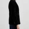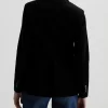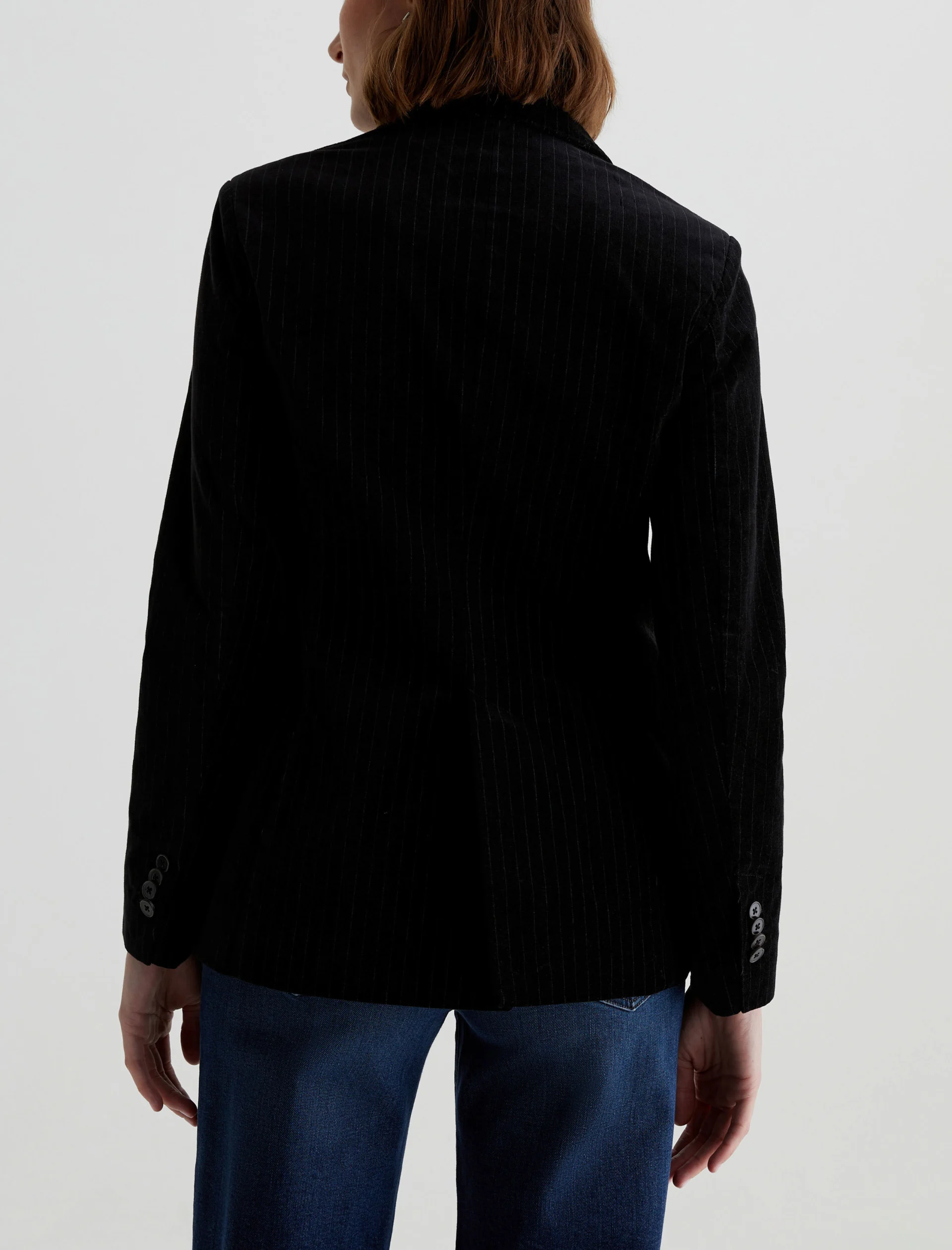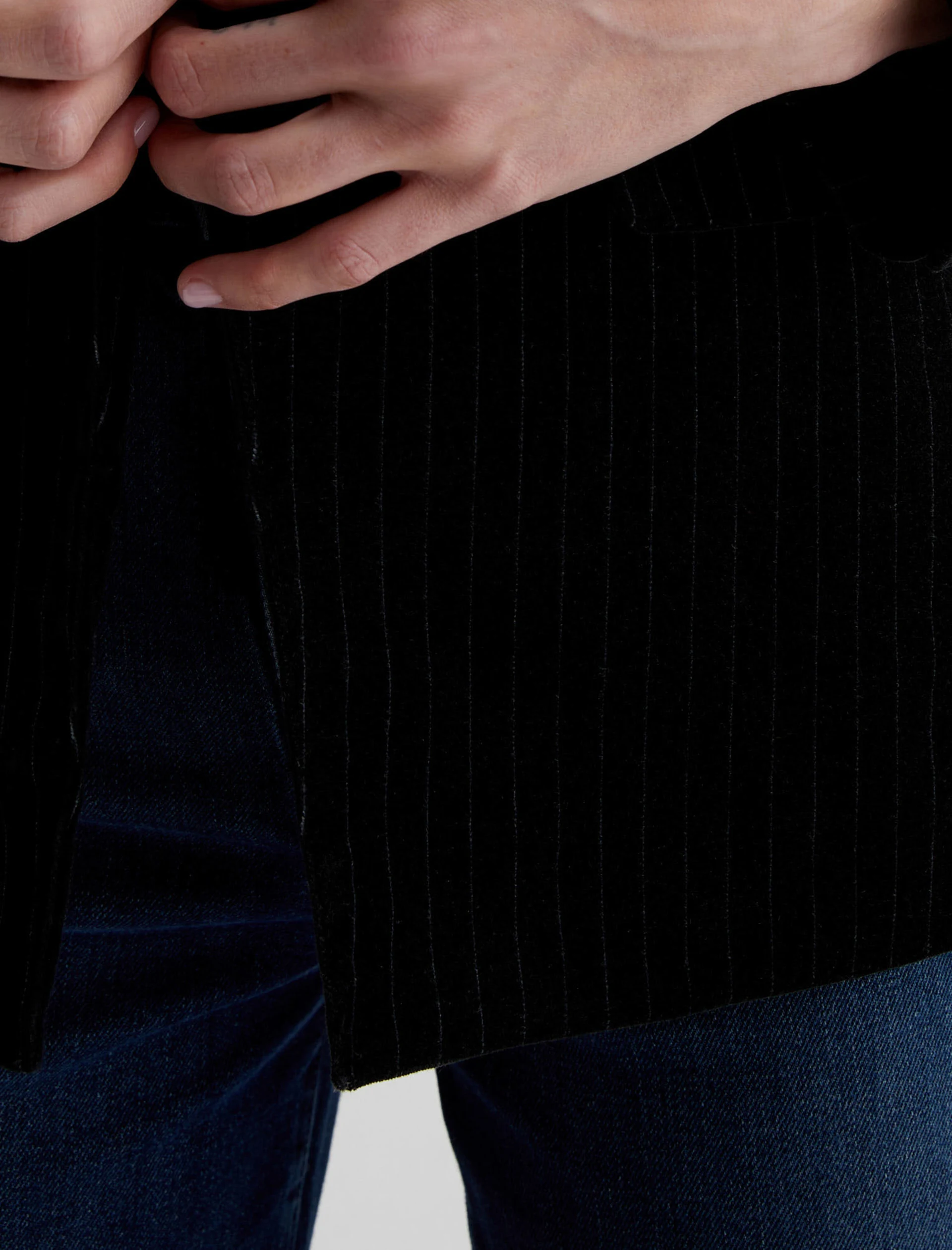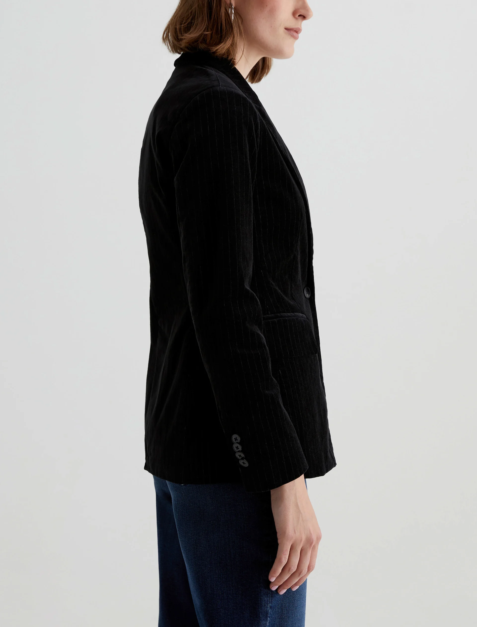 The Rue Blazer is occasion-ready in black velveteen with delicate white pinstripes and a touch of stretch. Designed for a fitted silhouette, this lustrous style looks sharp with peaked lapels, flap pockets, and a single button at the front.