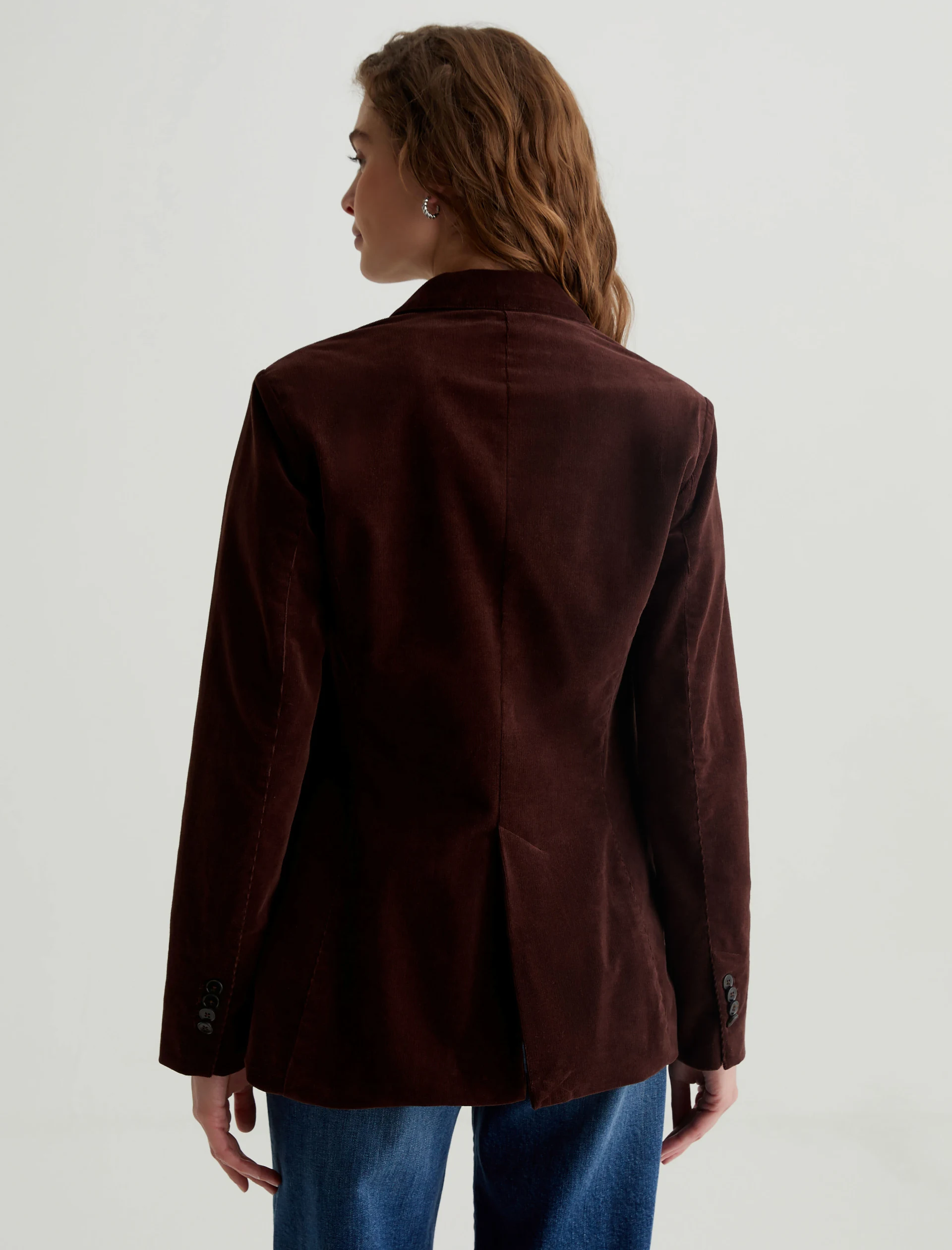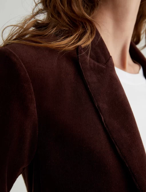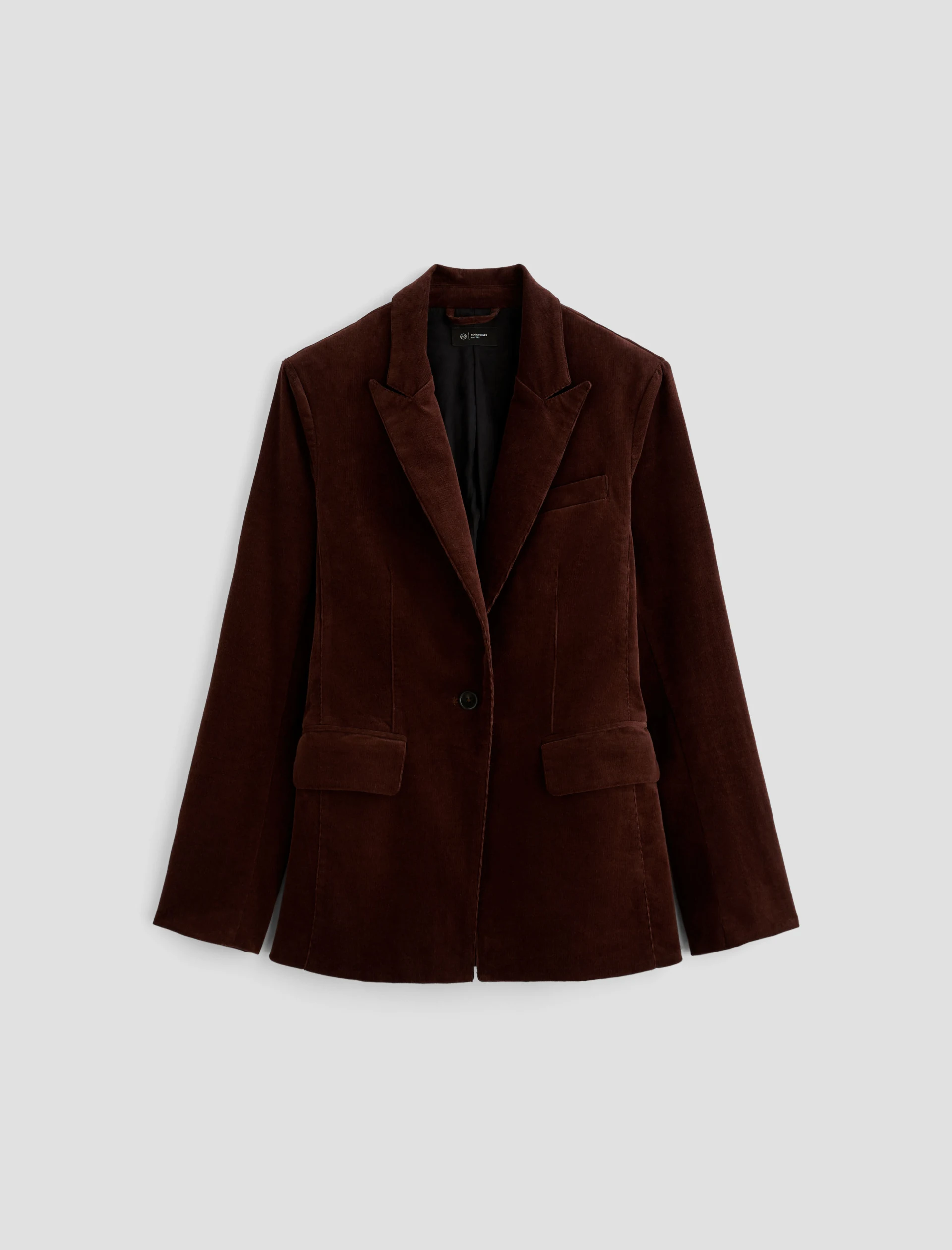 The Rue Corduroy Blazer brings a polished finish to any look. Done in a rich brown shade, it’s soft to the touch and blended with a bit of stretch. This tailored style looks sharp in a fitted silhouette with peaked lapels, flap pockets, and a single button at the front.