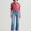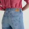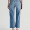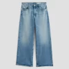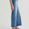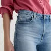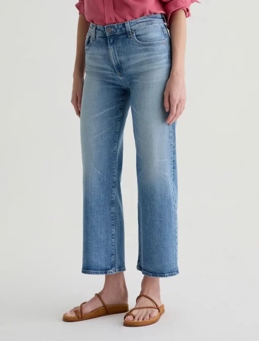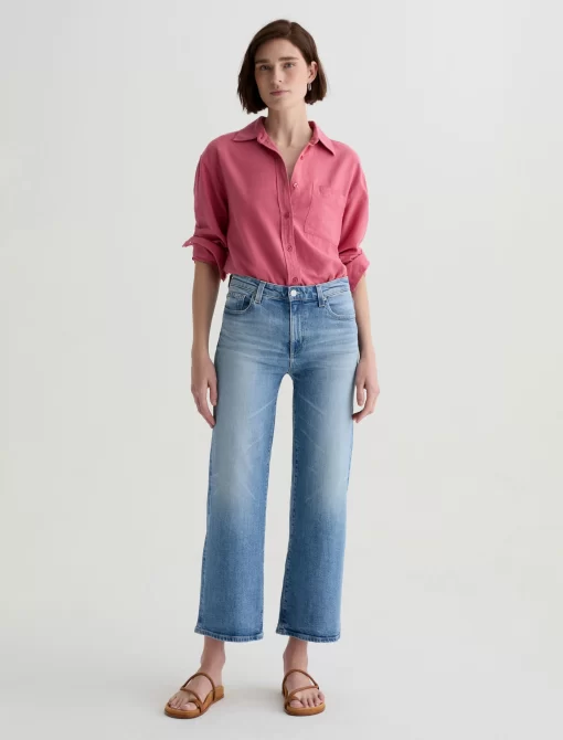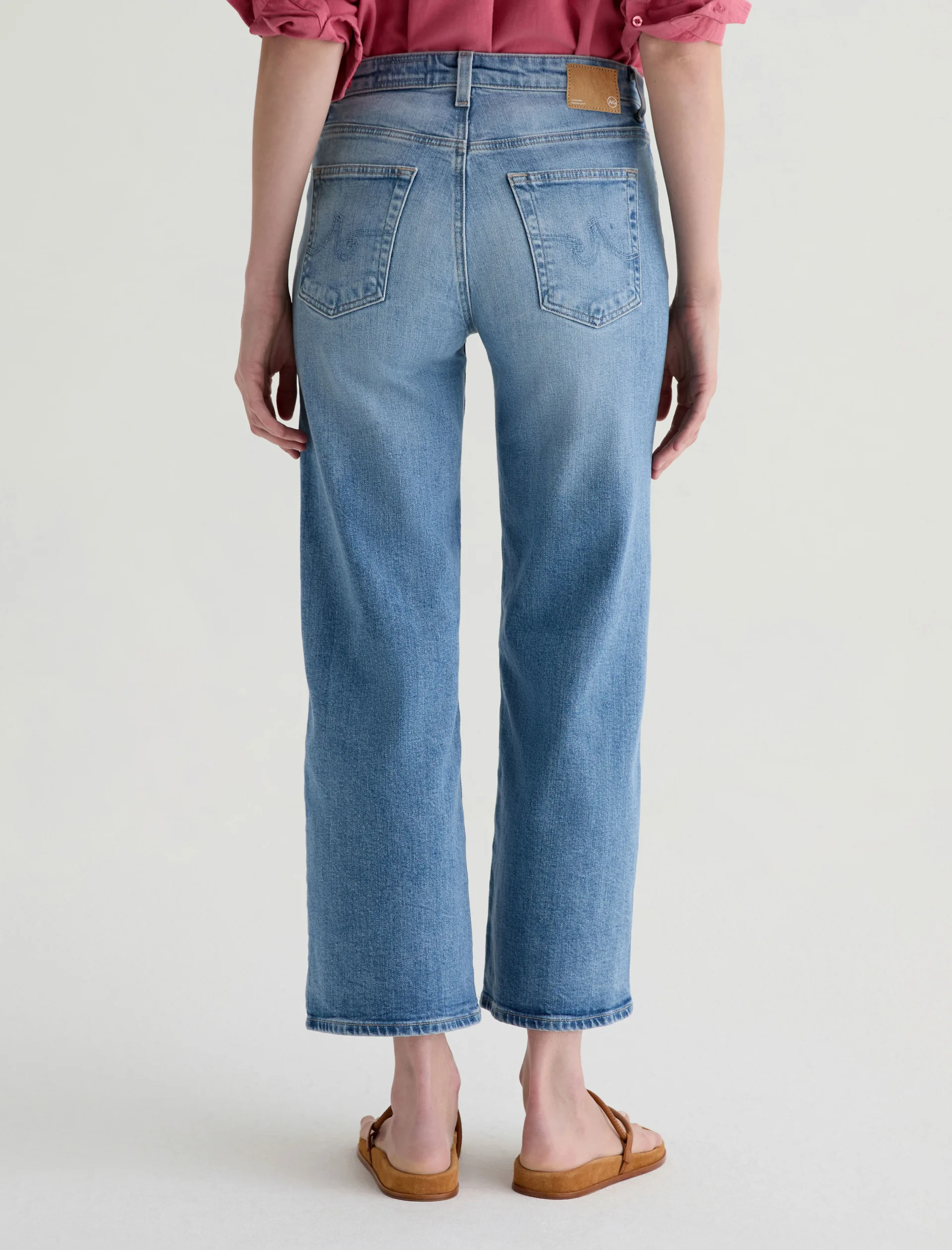 The Saige Wide-Leg crop is a high-rise jean with a wide-leg silhouette and clean hems. This five-pocket style offers a relaxed yet structured look. Crafted from 11.75 oz. Vintage Comfort Stretch Denim, the pair comes in a Helios light wash.