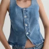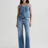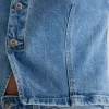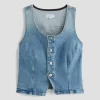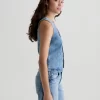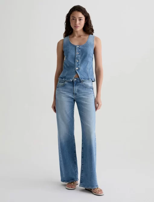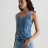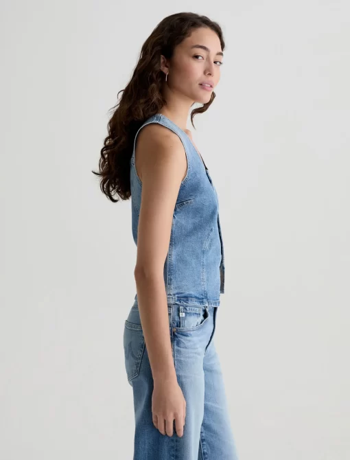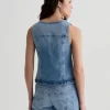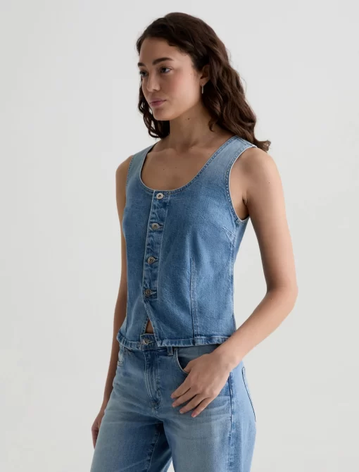 The Teagan Tank is a slim-fitting denim top with a sleeveless design and a center front closure. Made from 11.75 oz. Vintage Comfort Stretch Denim, it comes in a light indigo wash with subtle fading for a sun-worn look.