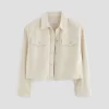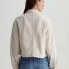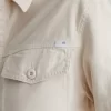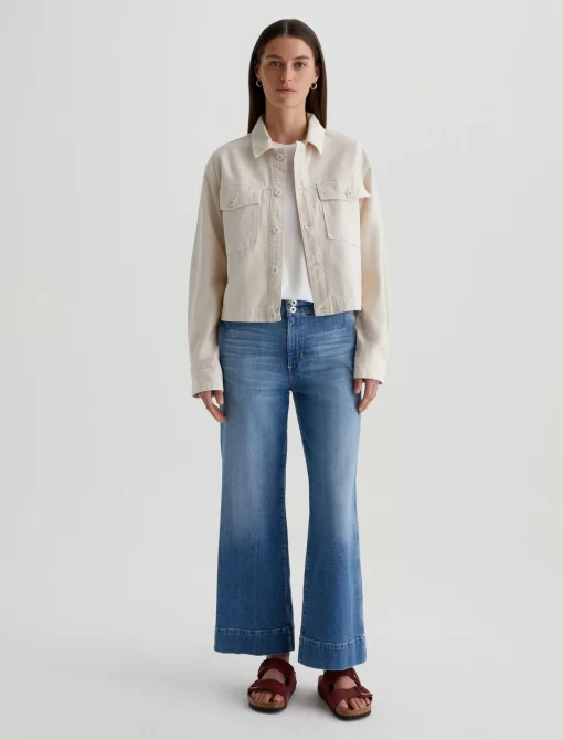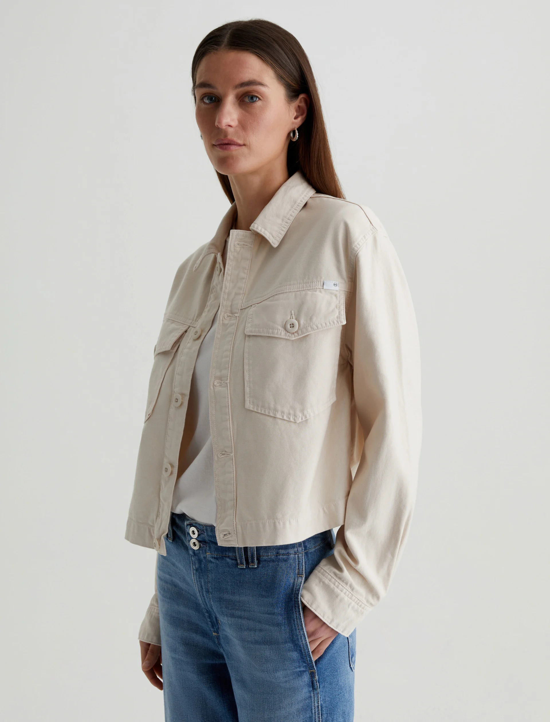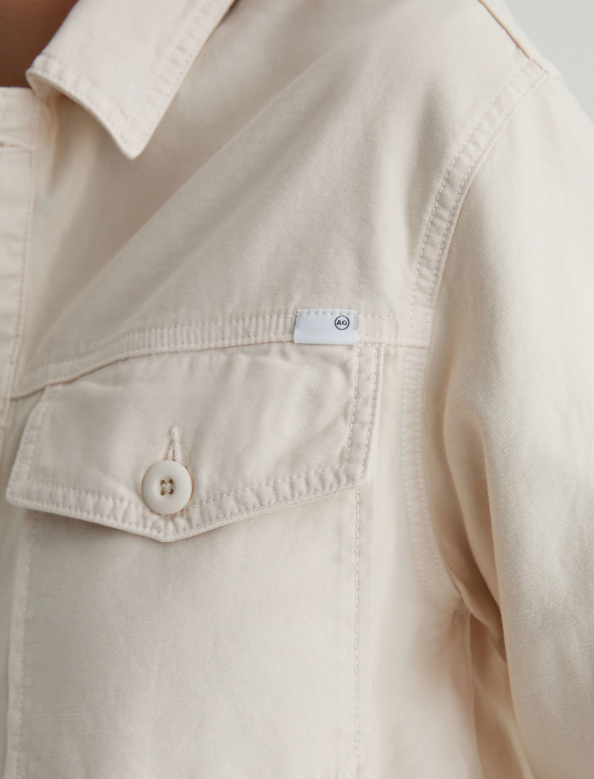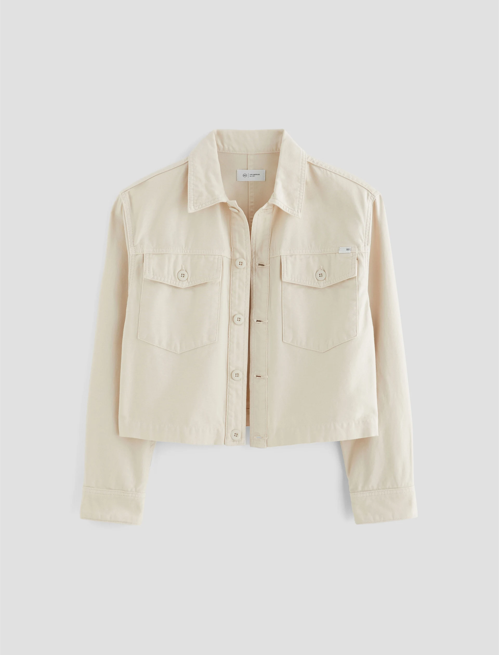 A cropped version of the classic utility shirt jacket, the Valleta layers with ease but also wears well on its own. This long-sleeve style comes in off-white Sternway Reverse Sateen and features button-through flap pockets at the front.
