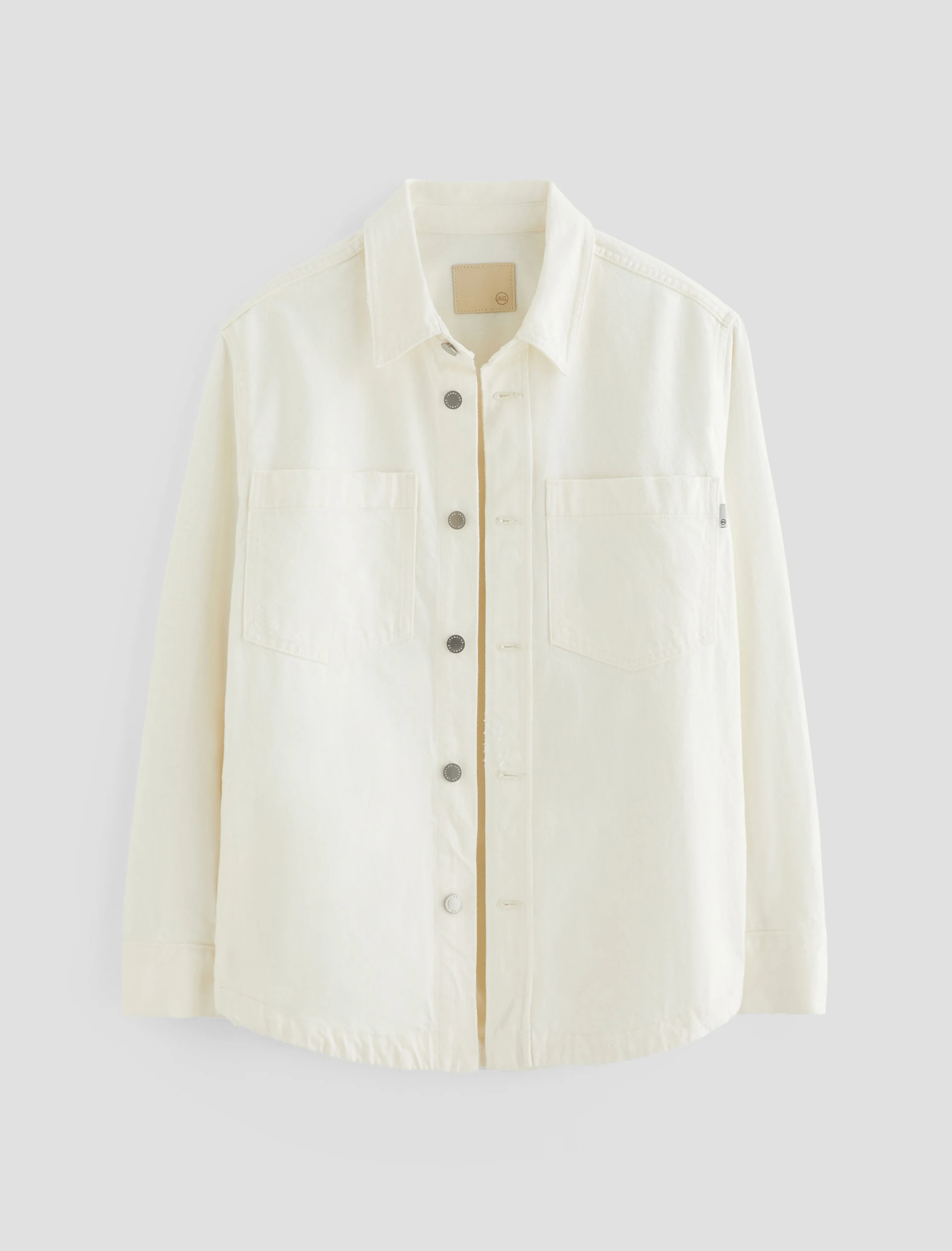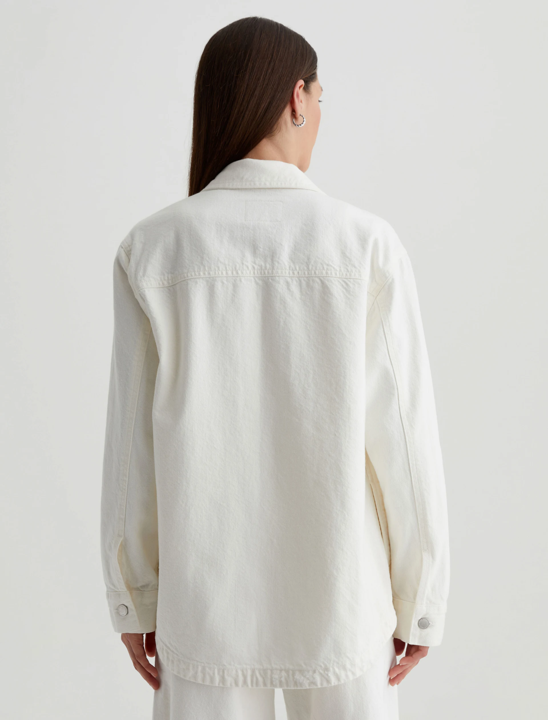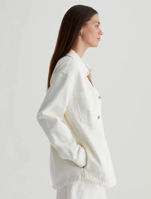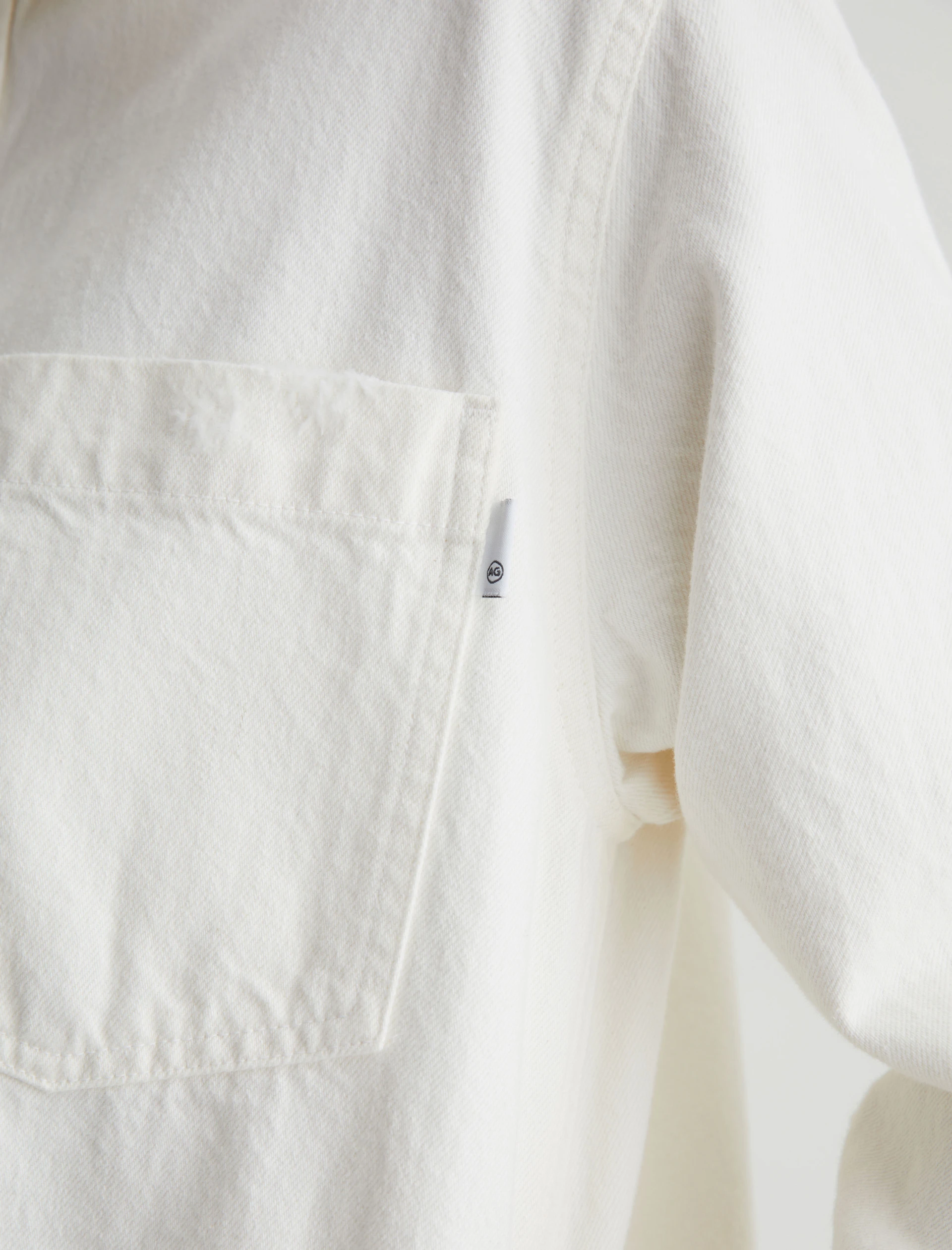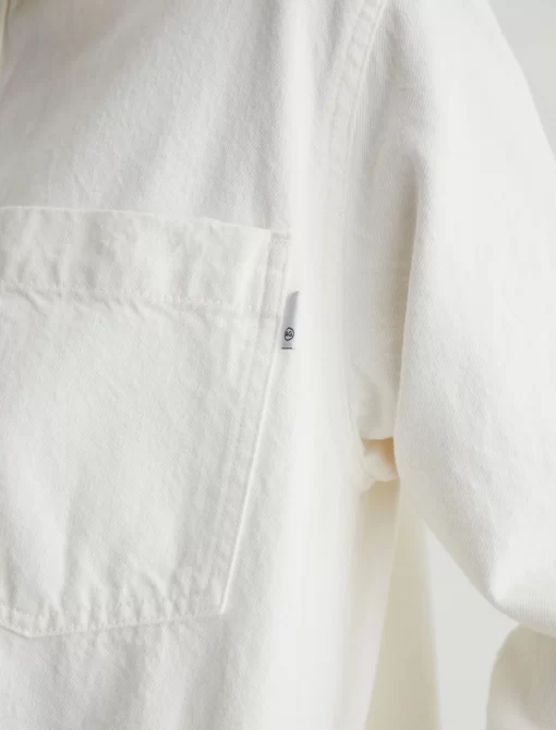 The Vita relaxed-fit shirt jacket layers well throughout the seasons. Crafted from 11.75 oz. Soft Pure Denim, the long-sleeve number features 100% cotton construction in powder white with subtle destruction. Patch pockets and shank fastenings borrow from utility styles, while dropped shoulders give it some slouch.