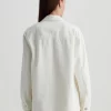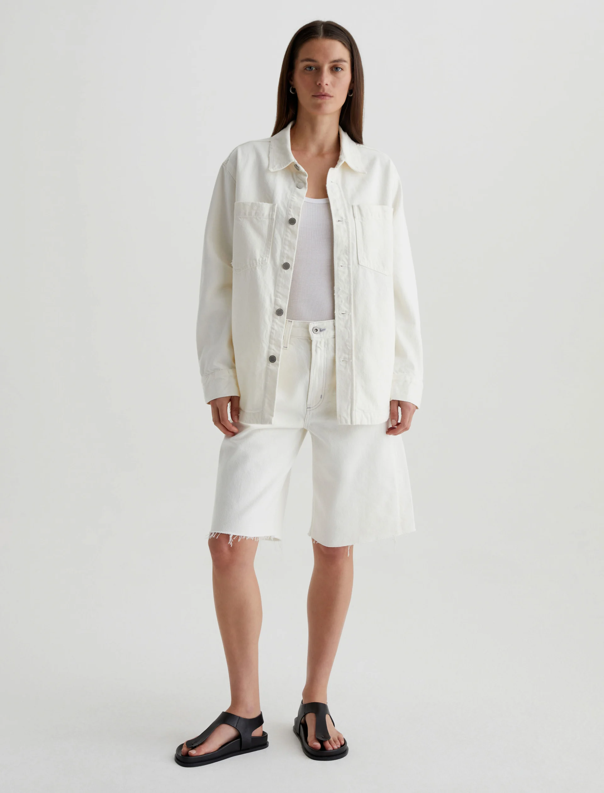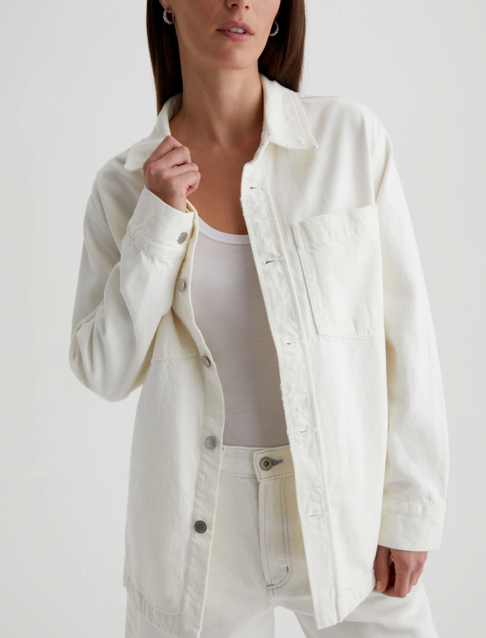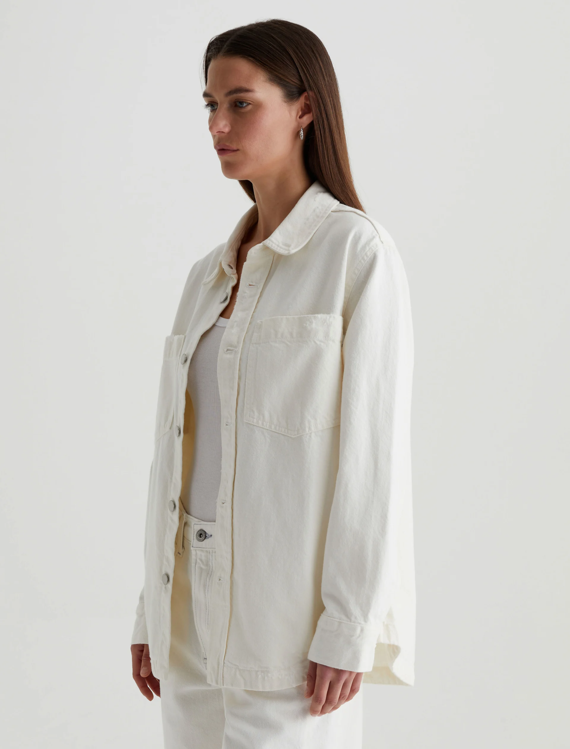 The Vita relaxed-fit shirt jacket layers well throughout the seasons. Crafted from 11.75 oz. Soft Pure Denim, the long-sleeve number features 100% cotton construction in powder white with subtle destruction. Patch pockets and shank fastenings borrow from utility styles, while dropped shoulders give it some slouch.